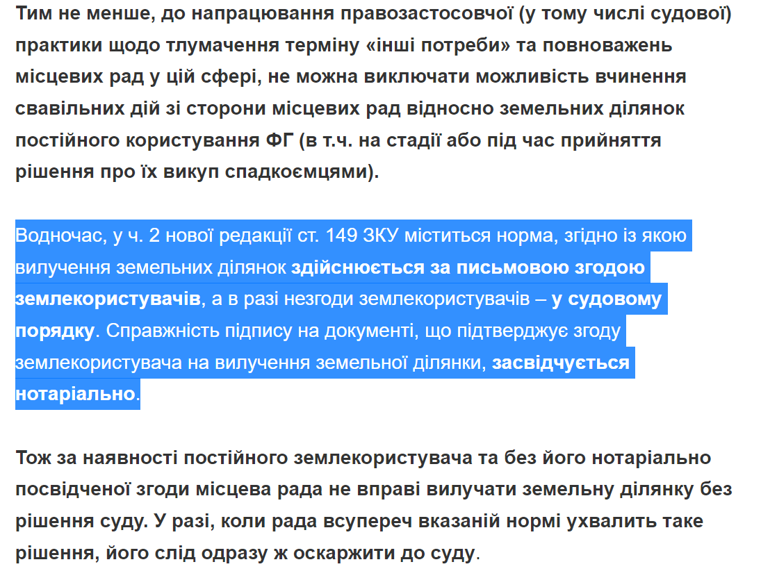 Водночас, у ч. 2 нової редакції ст. 149 ЗКУ міститься норма, згідно із якою вилучення земельних ділянок здійснюється за письмовою згодою землекористувачів, а в разі незгоди землекористувачів – у судовому порядку. Справжність підпису на документі, що підтверджує згоду землекористувача на вилучення земельної ділянки, засвідчується нотаріально.