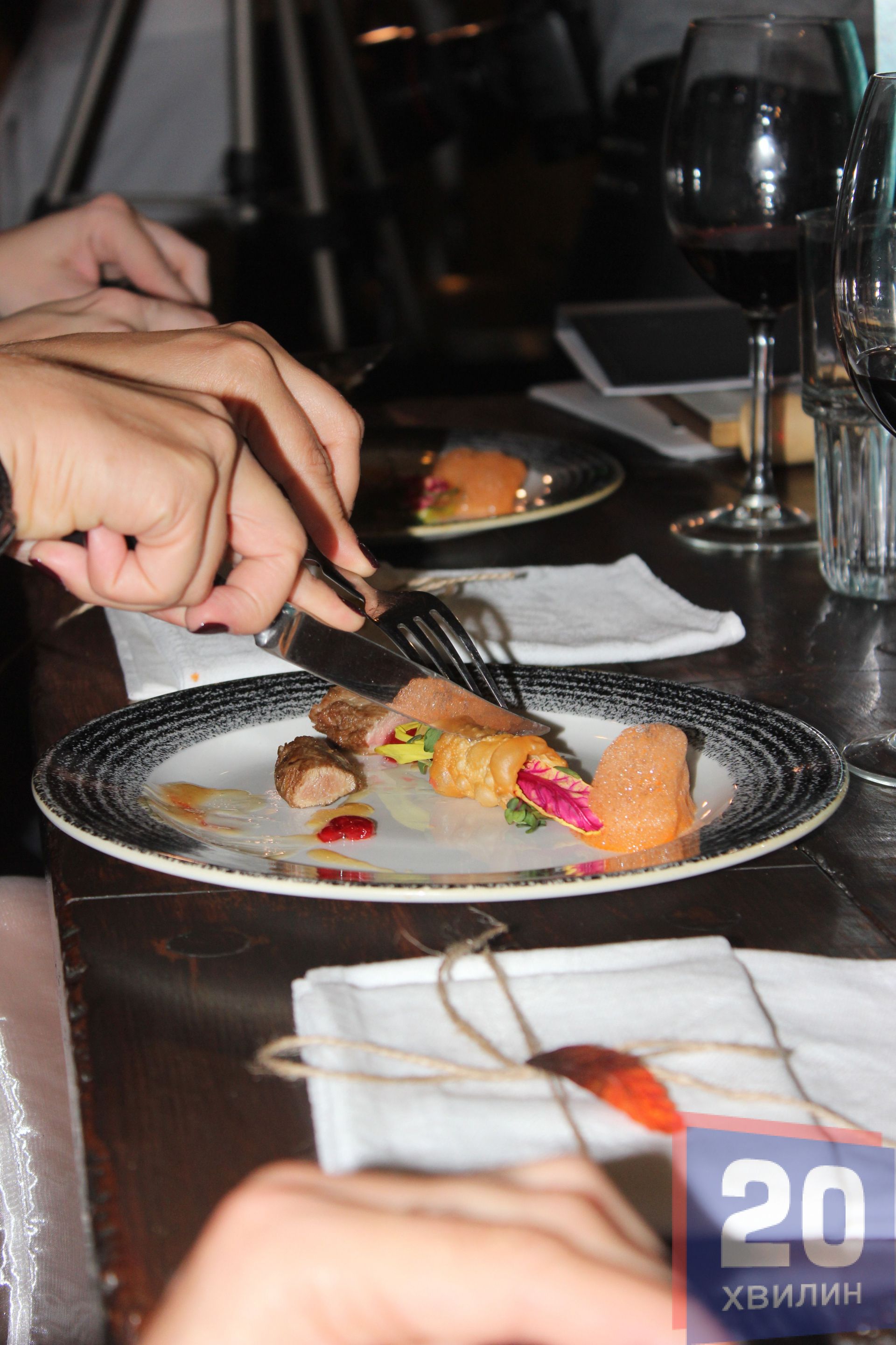 - У першій закусці, як на мене, кранч був суховатим, - каже Антон. - Але сам паштет крутий. Друга страва - салат. Класне поєднання та подача, але я очікував чогось смачнішого. Загалом, мені всі страви смакували. Атмосфера вечору мені теж подобається. Такі проекти потрібні не стільки шеф-кухарям, а й самим власникам ресторанного бізнесу. Класно, коли люди, які працюють в одній сфері можуть отак поспілкуватись, обмінятись досвідом.