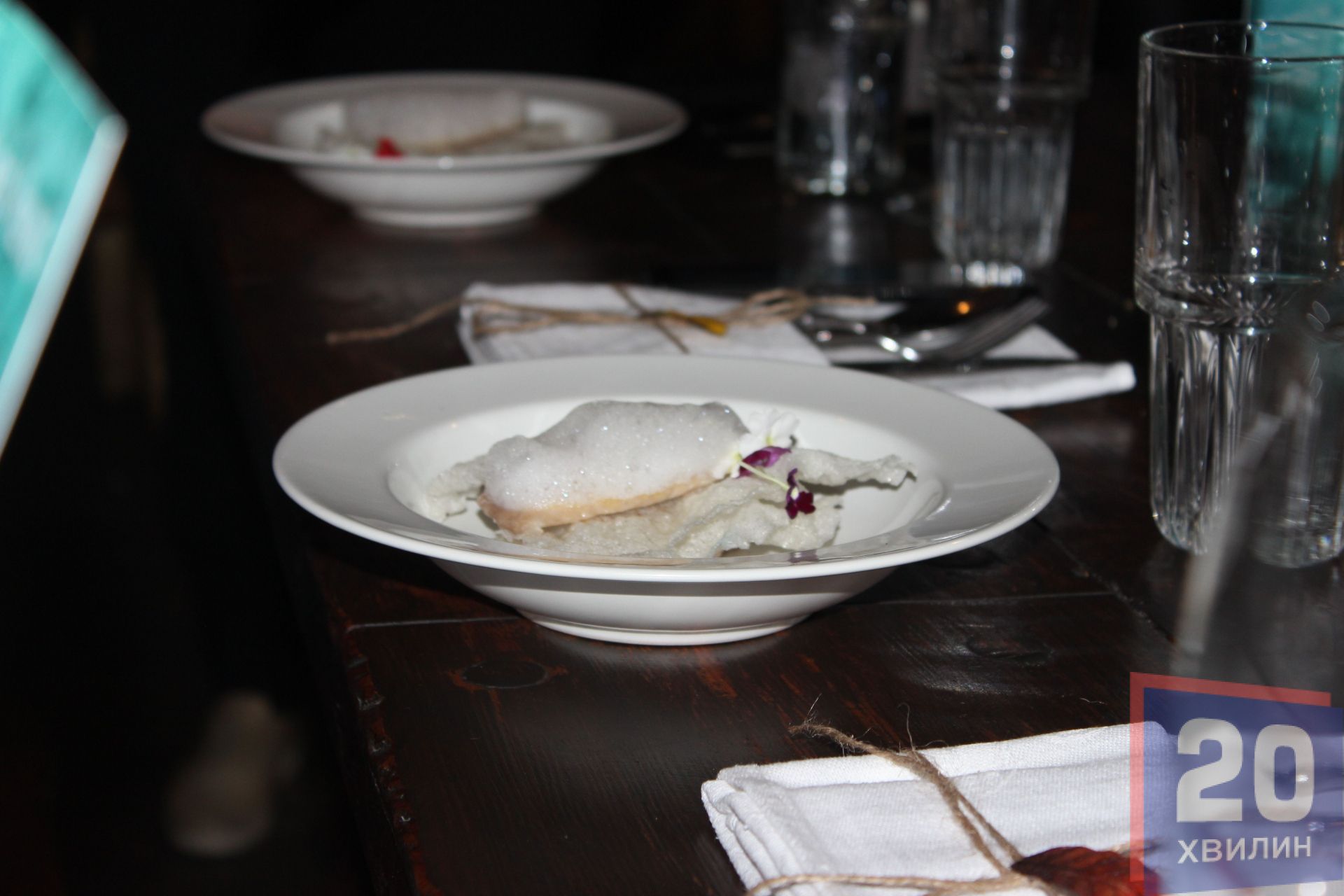 Після консоме було томлене філе сома з лимонною піною. Віталій каже, що з цією рибою мало хто експериментує і зазвичай використовують лосось.