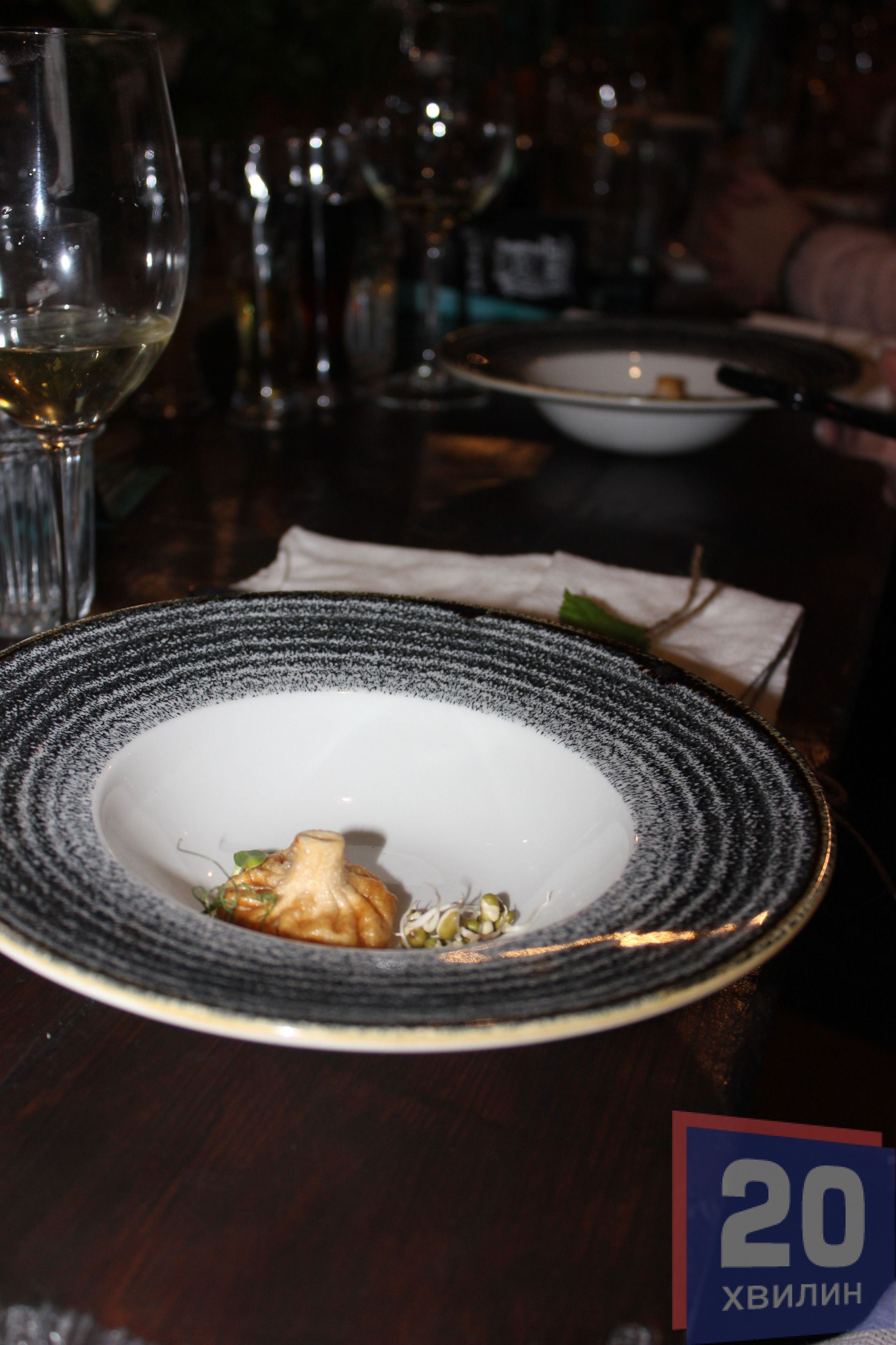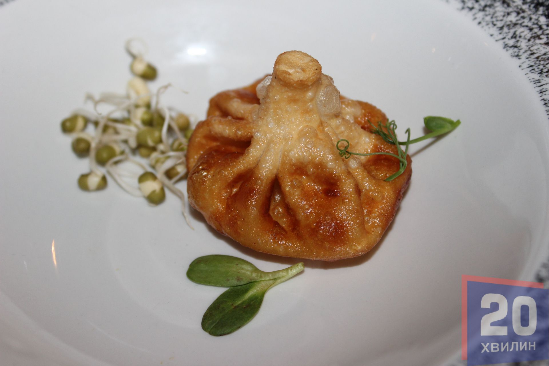 - Це консоме лише з соку з грибів, тут взагалі немає води, - каже Віталій. - І на цьому соці я приготував концентрований грибний бульйон. Ще є маленька хінкалька з куркою та сиром, яку попередньо відварили, а потім обсмажили.