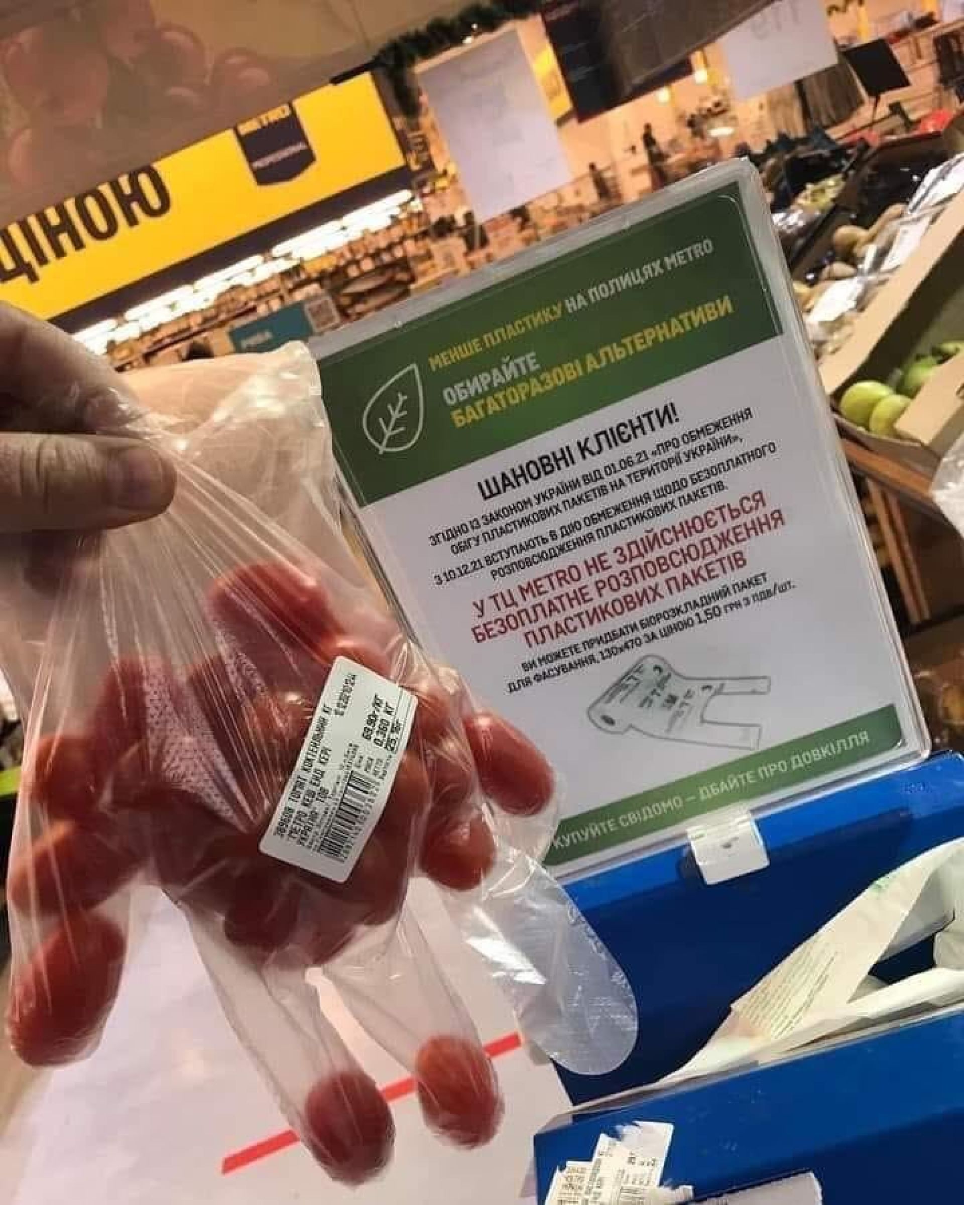 – Я розумію, коли в пакетики кладуть одяг запаковані товари, там можна відмовитися. Але що робити з м’ясом, рибою, крупами та й навіть овочами? – питає одна з продавчинь.