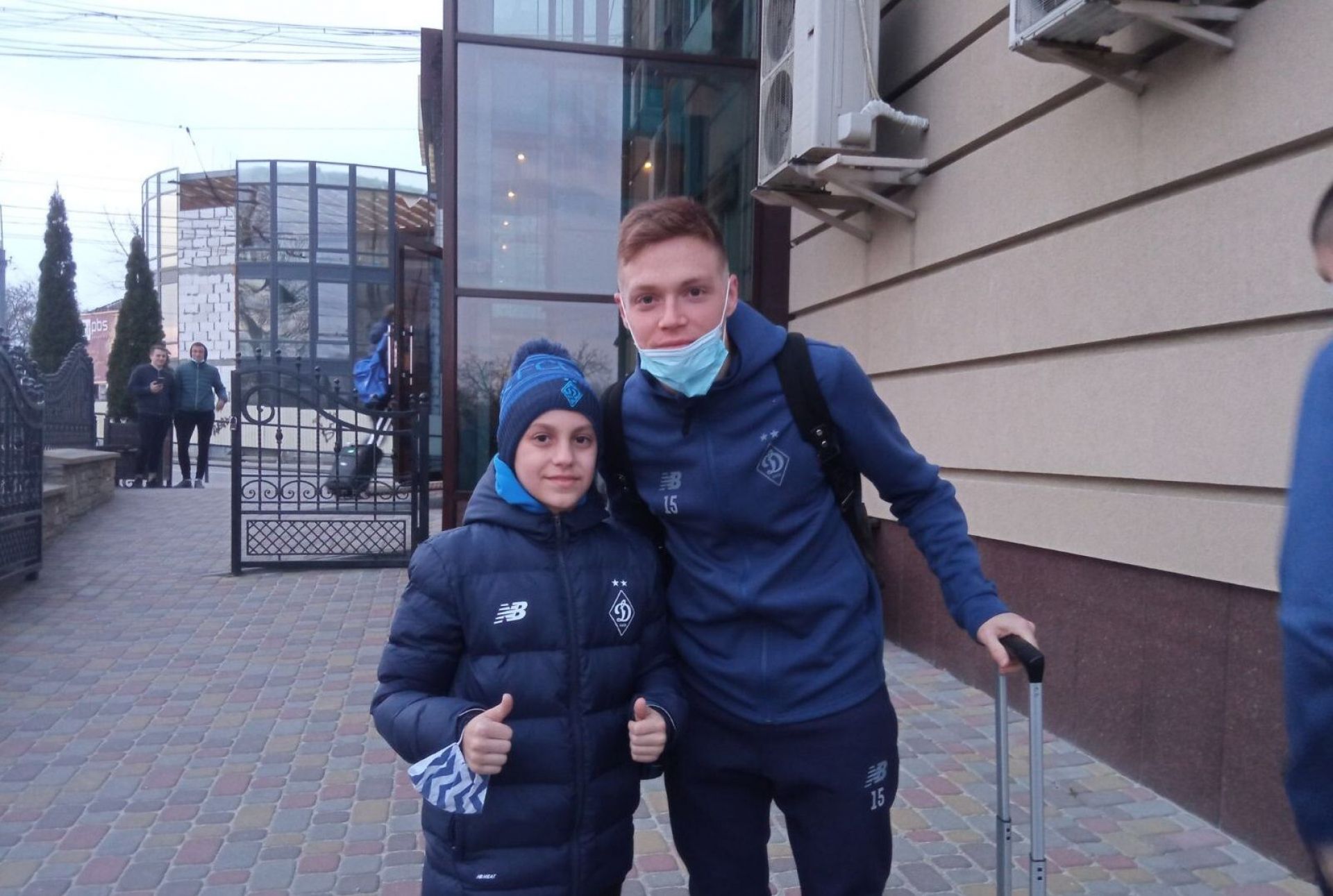 Біля готелю «біло-синіх» зустріли вболівальники, серед яких Максим – уболівальник «Динамо» з Тернополя, якому клуб висловив підтримку після того, як він став жертвою обстрілу і постраждав від численних поранень.