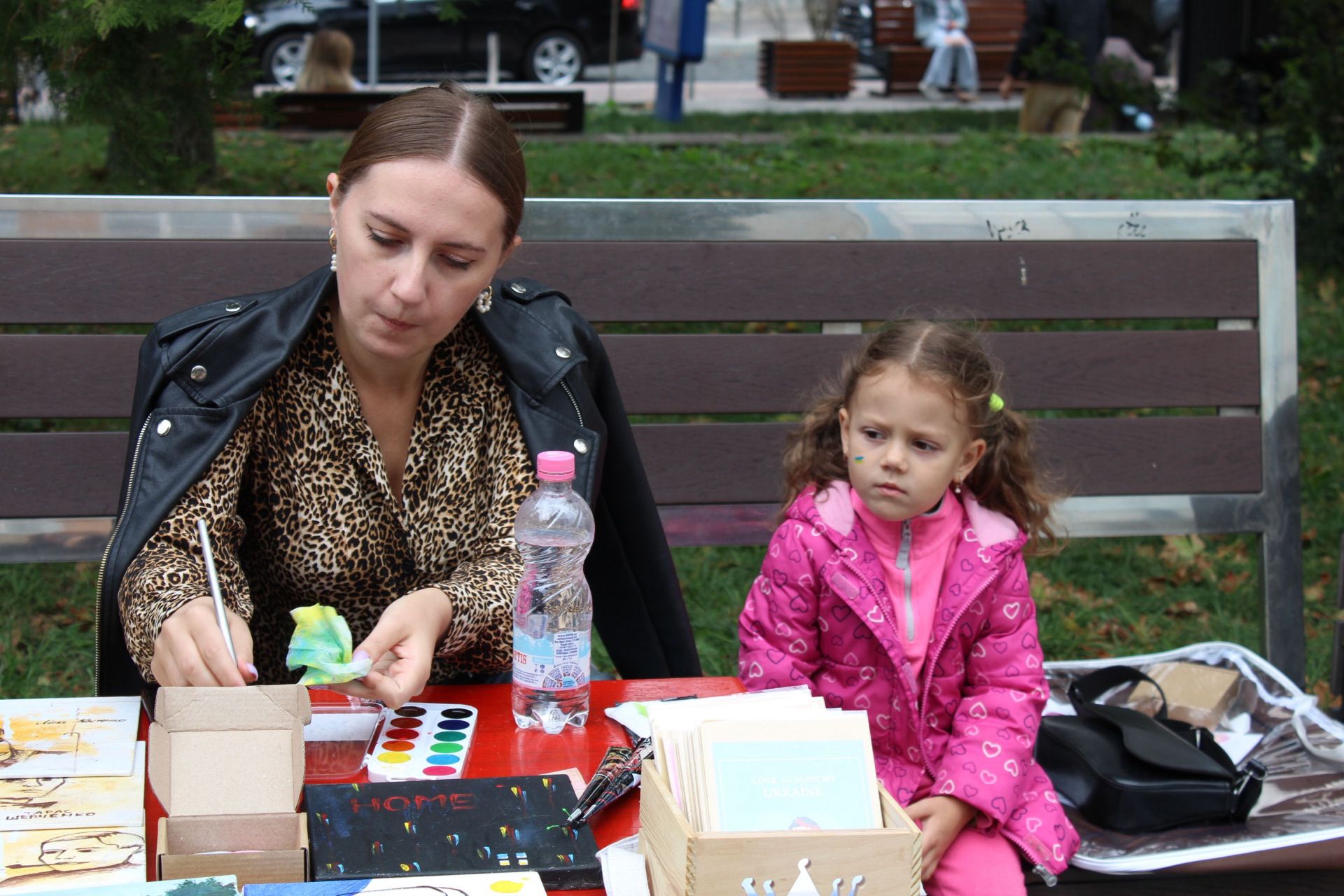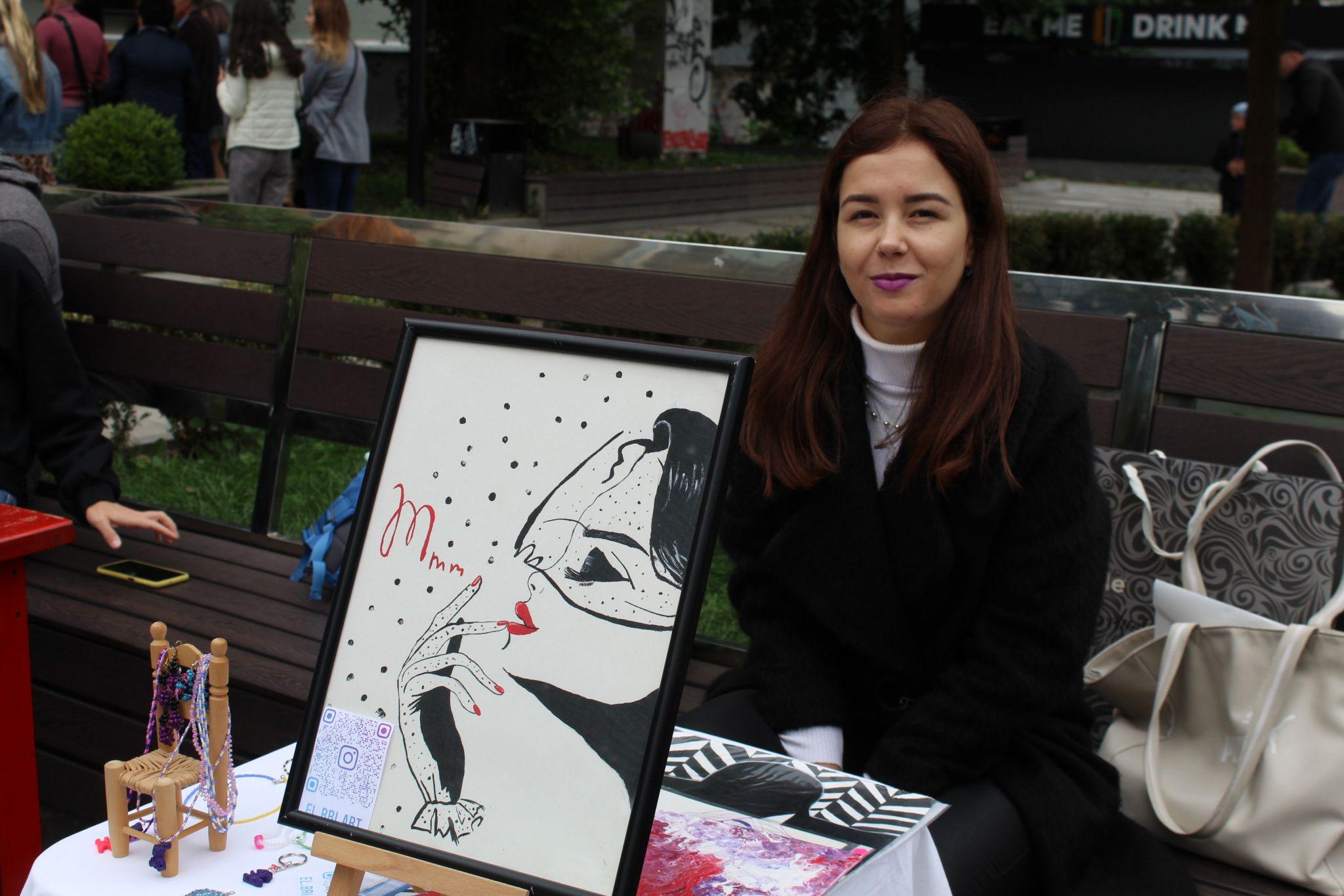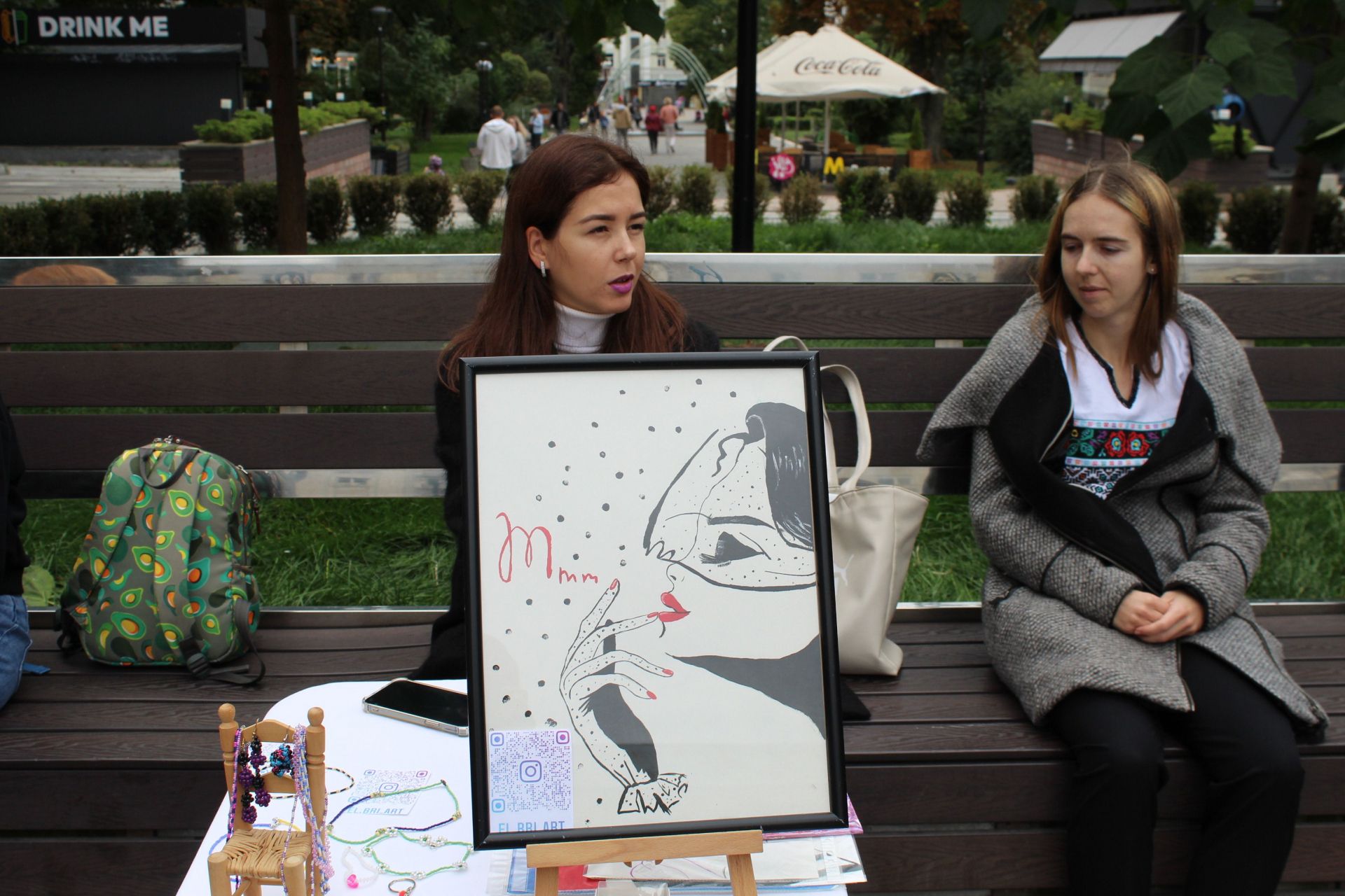 – За професією я біолог-хімік, а працюю викладаю малювання і є фотографом. Ще створюю сережки, браслети та підвіски, розписую шопери й подушки. Професійно займаюсь малюванням понад шість років. Минулоріч мала власну виставку в одній з місцевих кав’ярень. Одну з картин я принесла сьогодні, щоб продати її і виручені кошти перерахувати армії. Ми от-от розклались, та тішить, що люди вже підходять, цікавляться, купують щось, – говорить Еля.