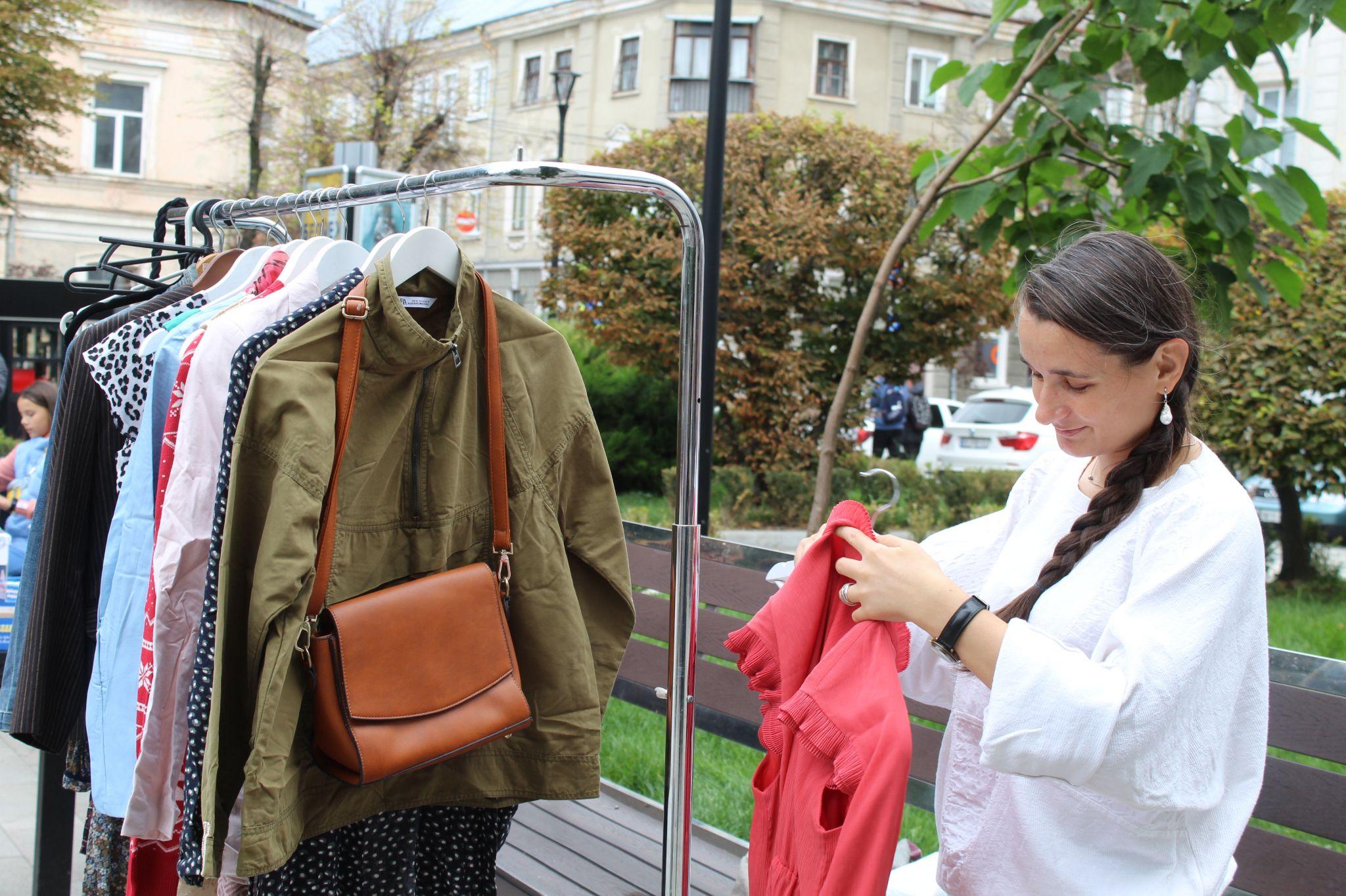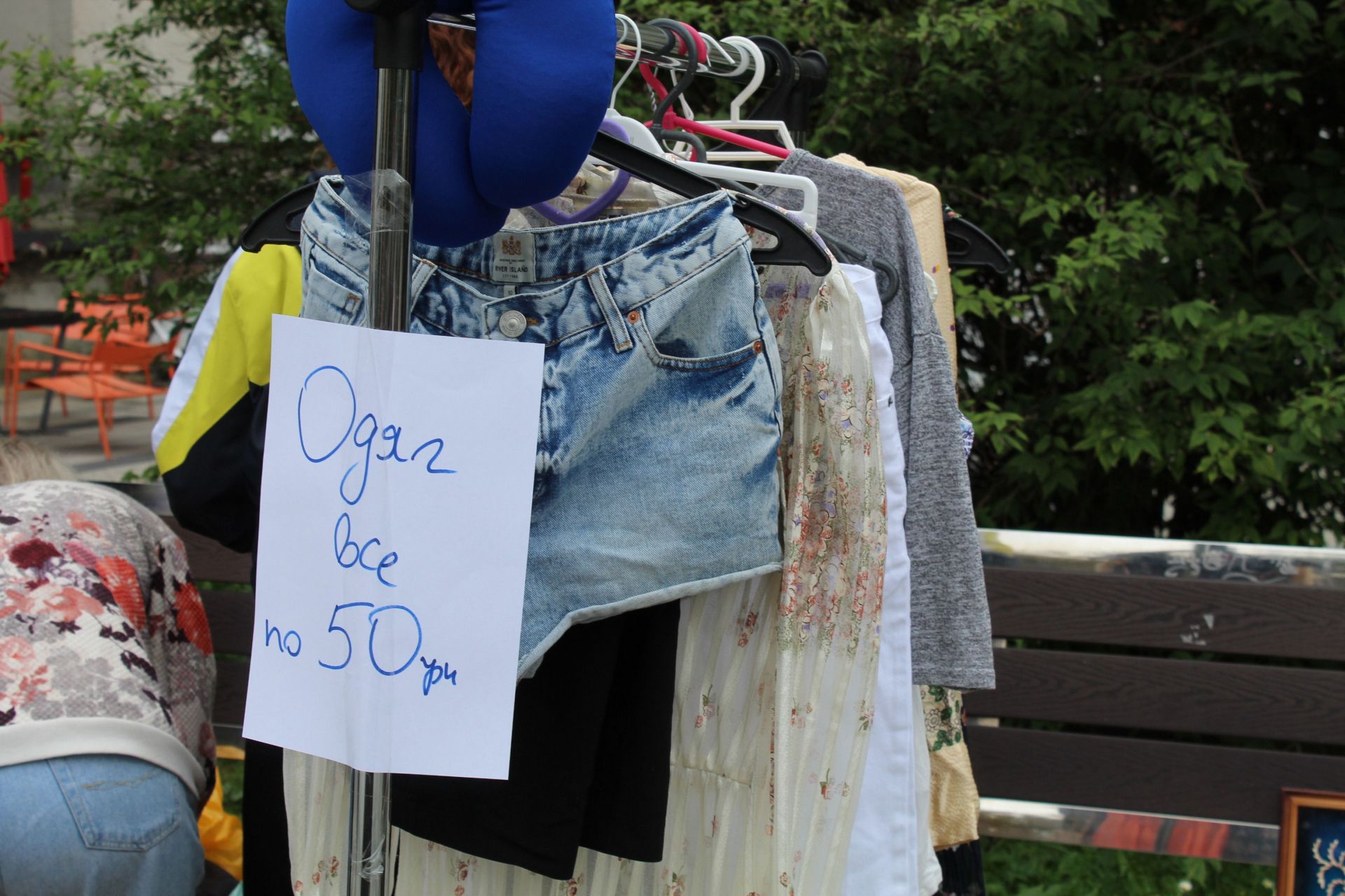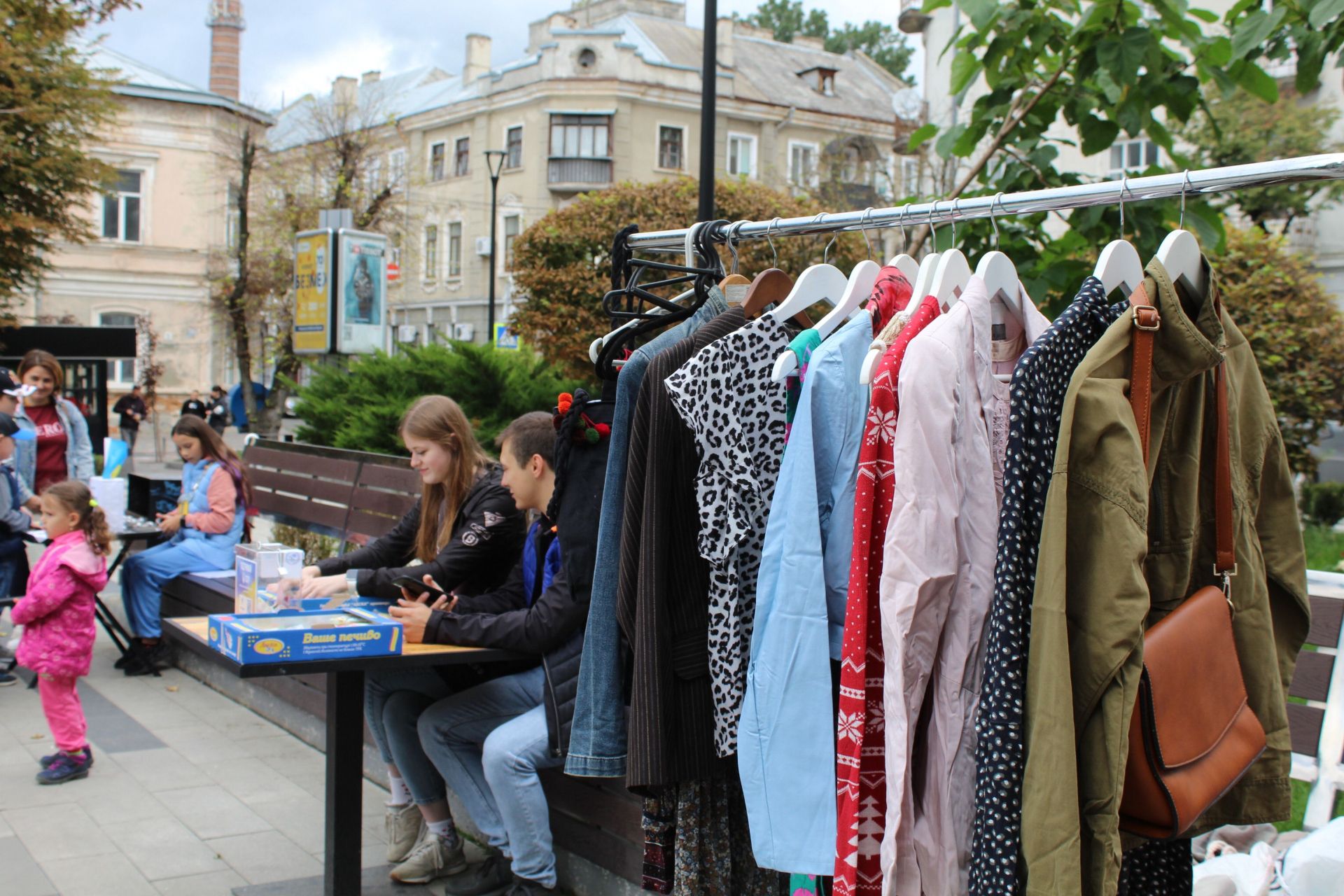 За одяг просили небагато – все коштувало по 50 гривень. Окремо стояла стійка з дитячими речима. Також охочі могли купити тут сезонне взуття, косметику, парфуми тощо. Лежали патріотичні шопери, дипломати й сумки.