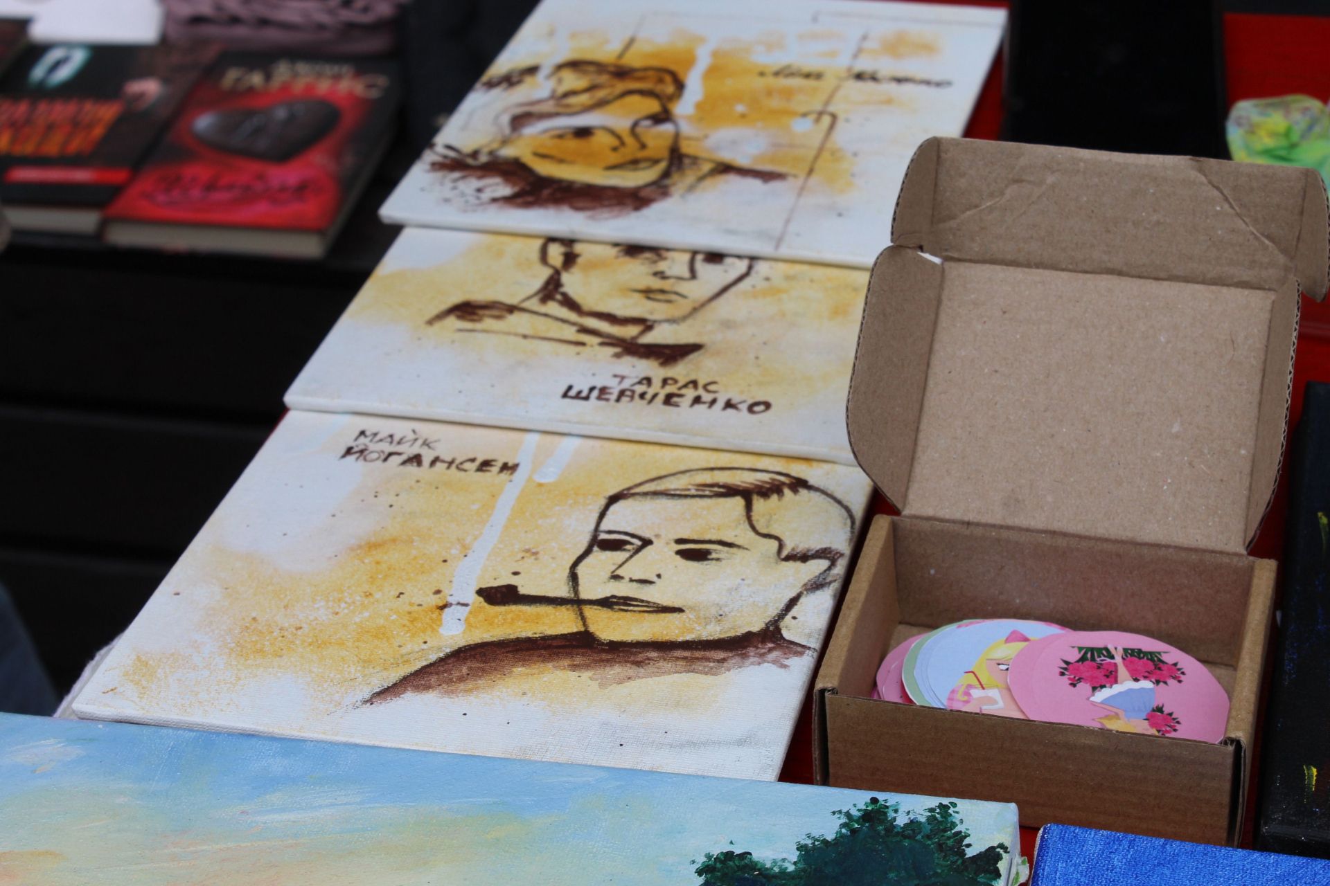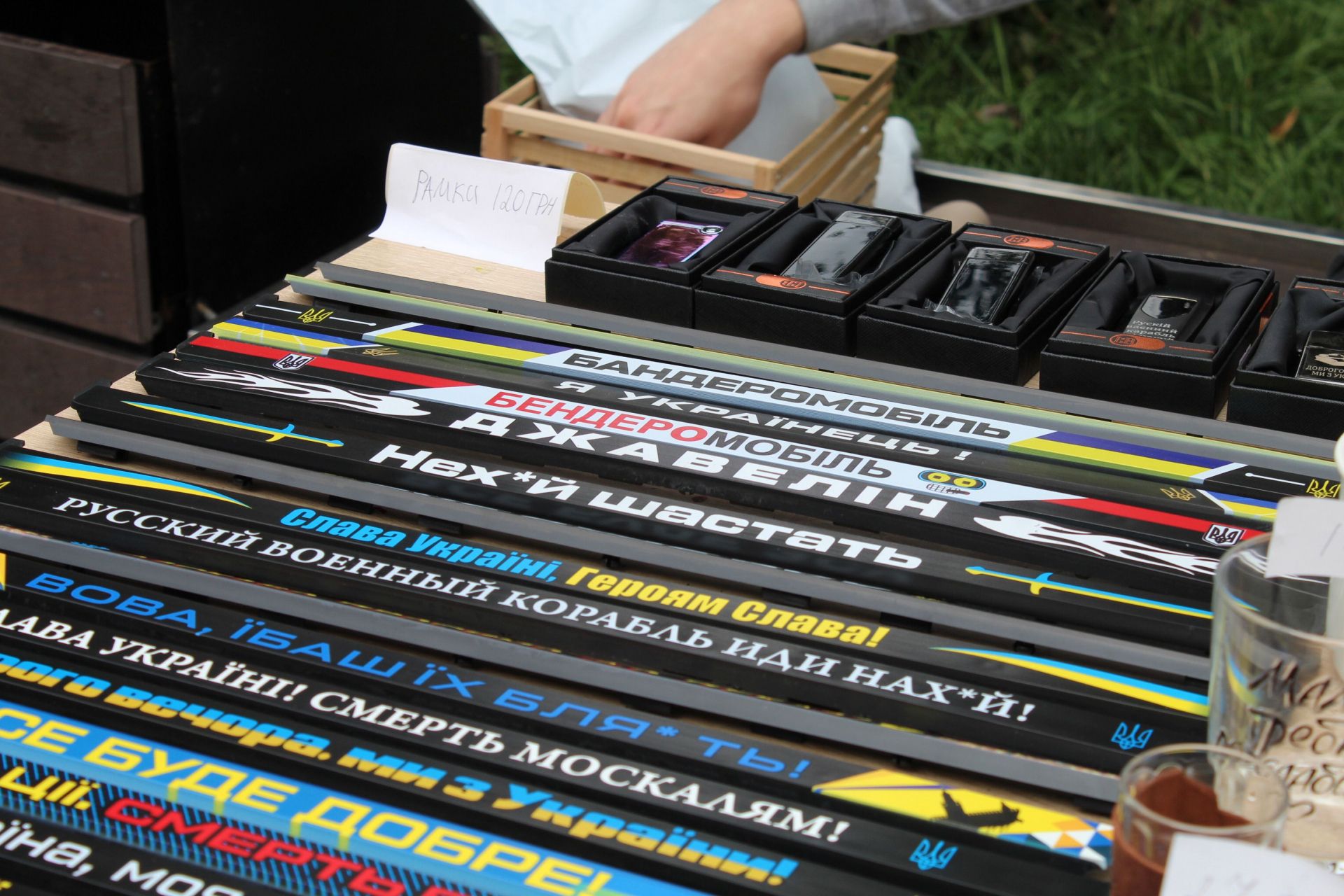 Знайти на своєрідних прилавках можна було милі листівки, бокали, стакани й чашки з креативними надписами за 170-270 гривень, запальнички із фразами, які давно стали мейнстрімом, типу «Русский корабль, иди…», головні убори.