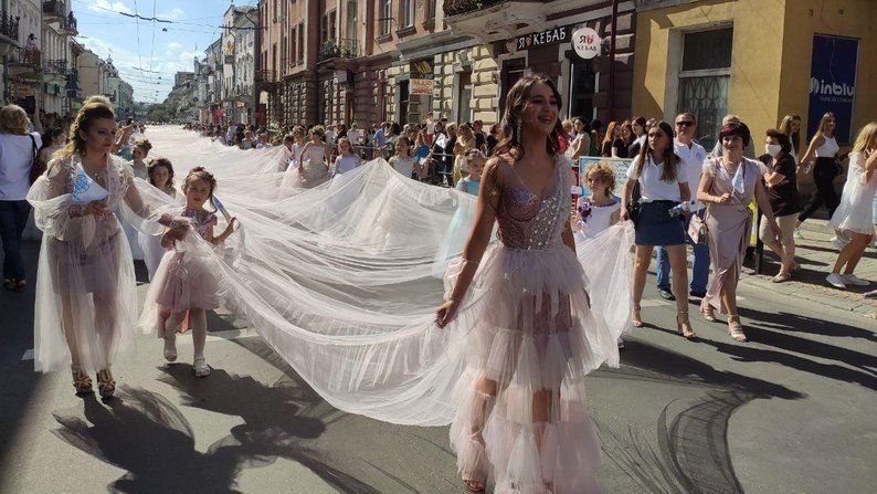 Відомо, що вбрання для неї пошила дизайнерка Наталія Стефанчук. Рекорд підтвердив експерт Національного реєстру рекордів України Павло Горішевський. Він зафіксував 102 метри 80 см довжини шлейфу.