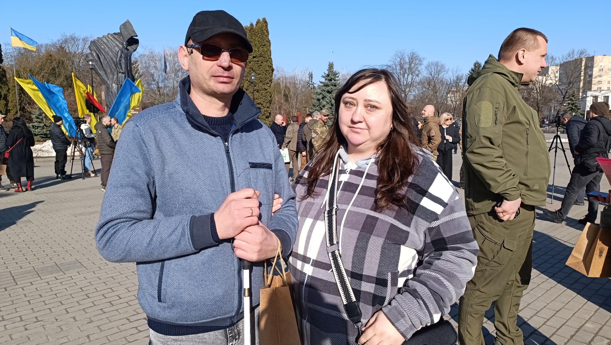 «Звичайно, для нього приємно, що його не забули, що його згадали. Що сказати... сльози навертаються», — каже Юлія, дружина добровольця Анатолія Смика. Захищаючи країну чоловік втратив зір, тому Тетяна усюди його супроводжує. Вона поруч і на урочистих заходах до Дня добровольця, де Анатолій отримав почесну відзнаку.