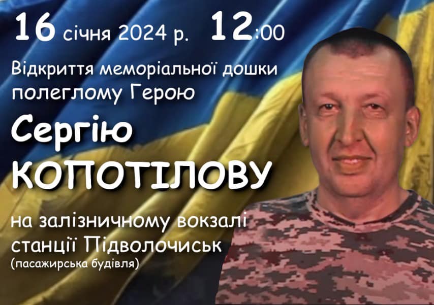 16-го січня, о 12 годині у Підволочиській громаді відкриють меморіальну дошку на знак пам’яті та пошани полеглому захиснику Сергію Копотілову. Про це повідомляють у Підволочиській селищній раді.