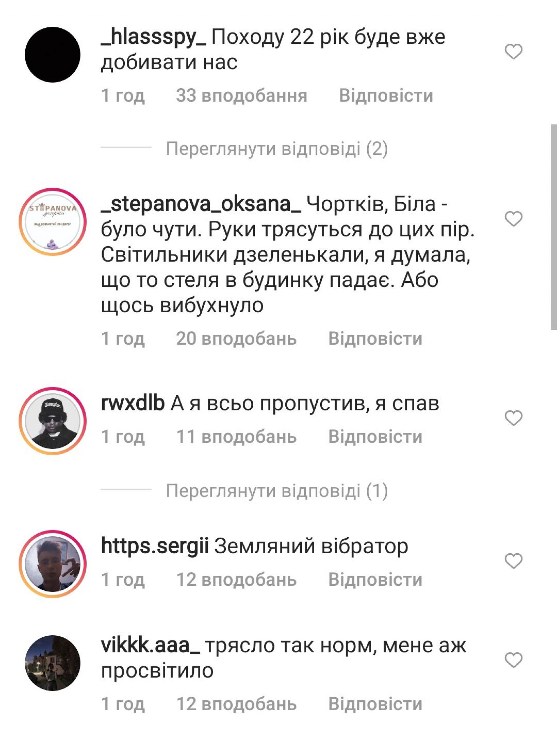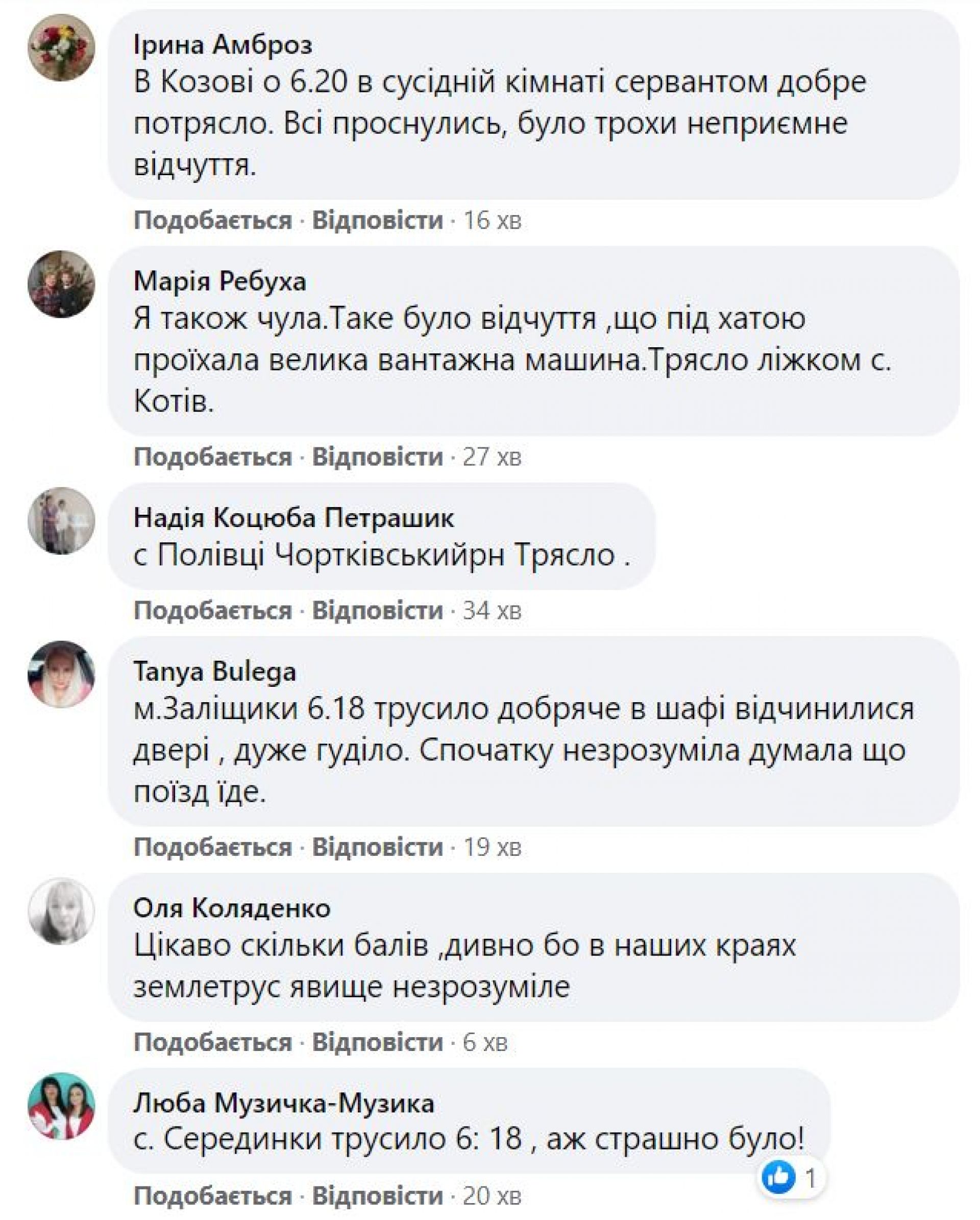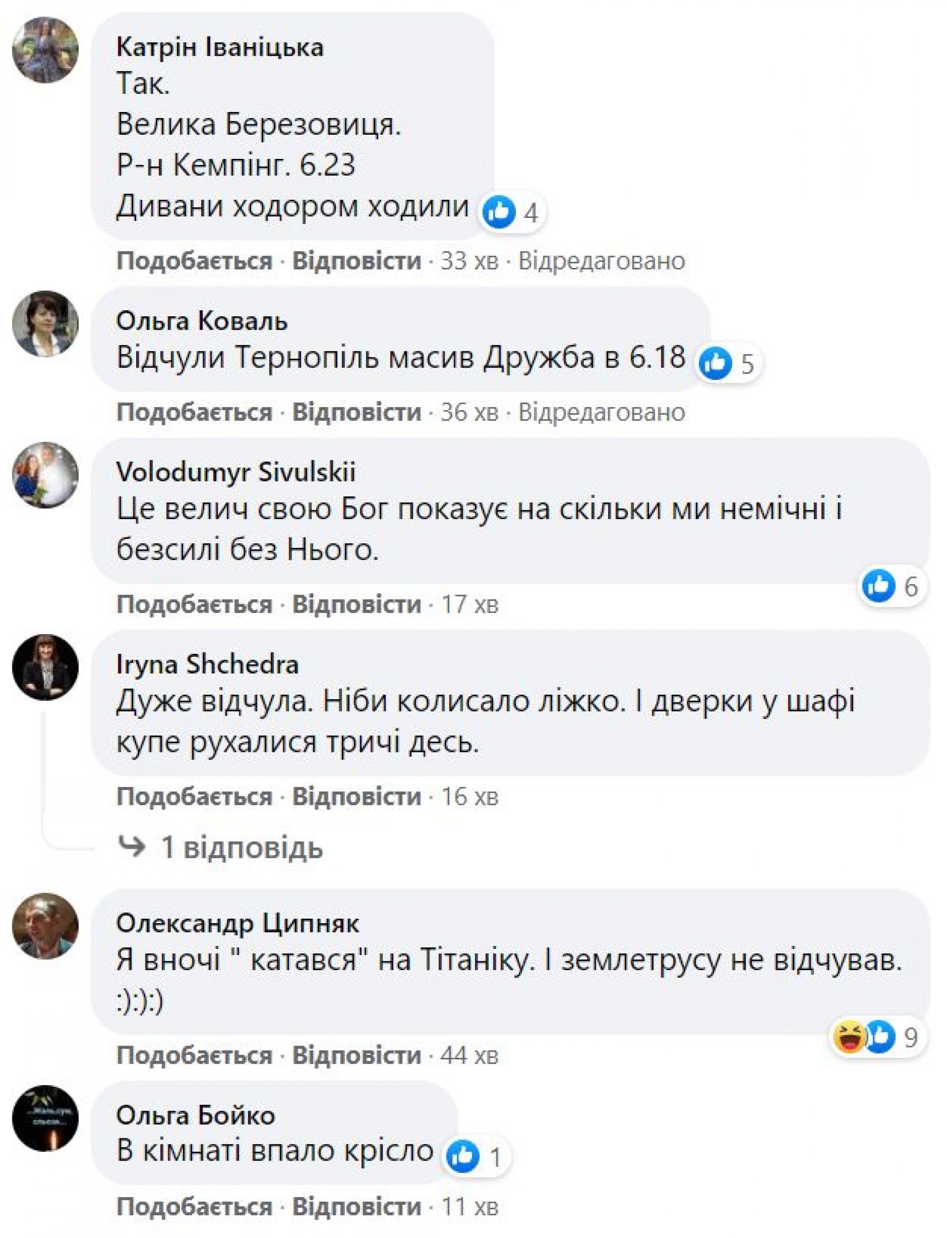 Чимало тернополян та жителів області пишуть, як у їх будинках в якусь мить почали трястися речі. Люди налякалися від такого потрясіння. Поштовхи було відчутно одразу в кількох областях: Тернопільській, Хмельницькій, Вінницький і Чернівецькій.