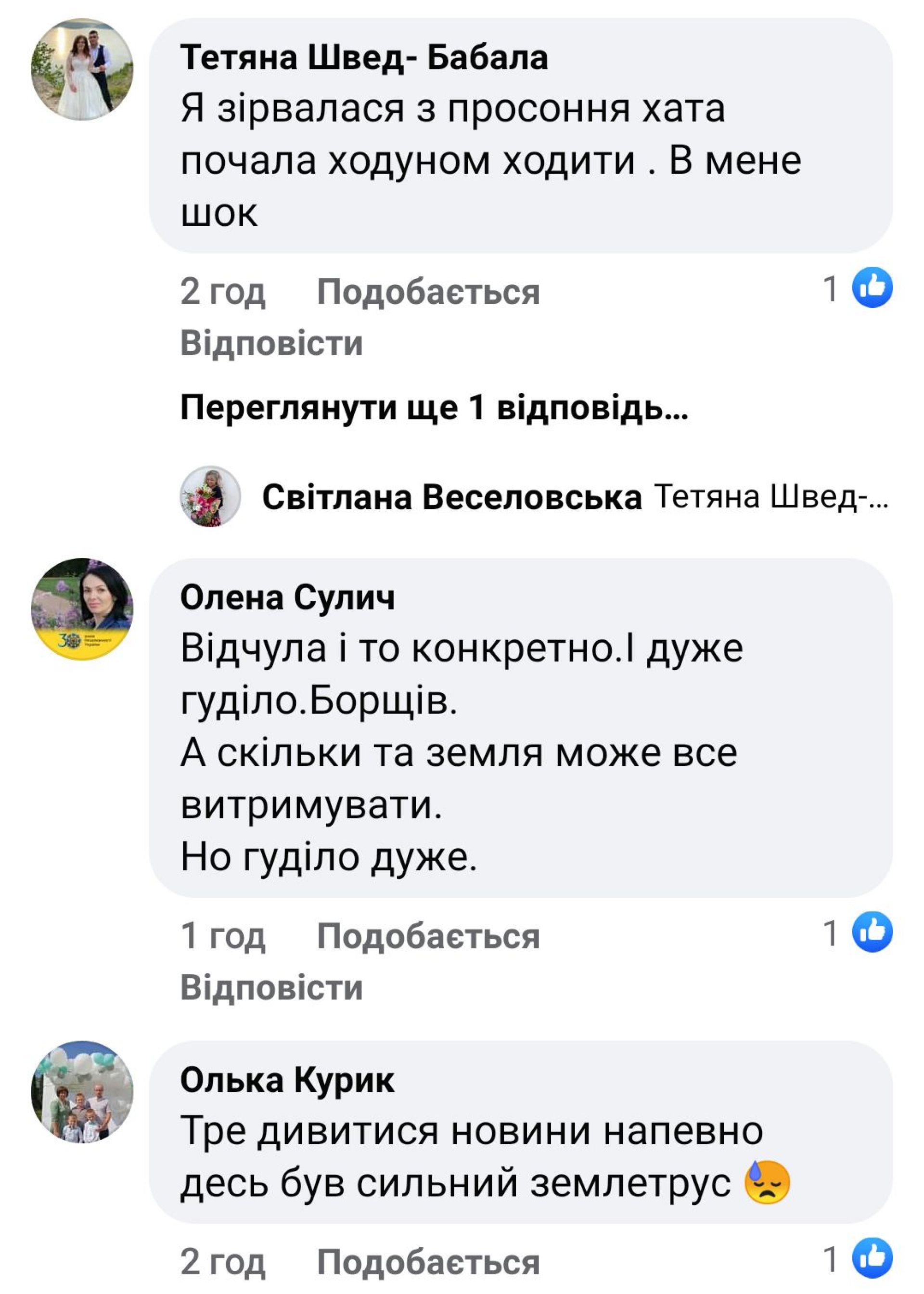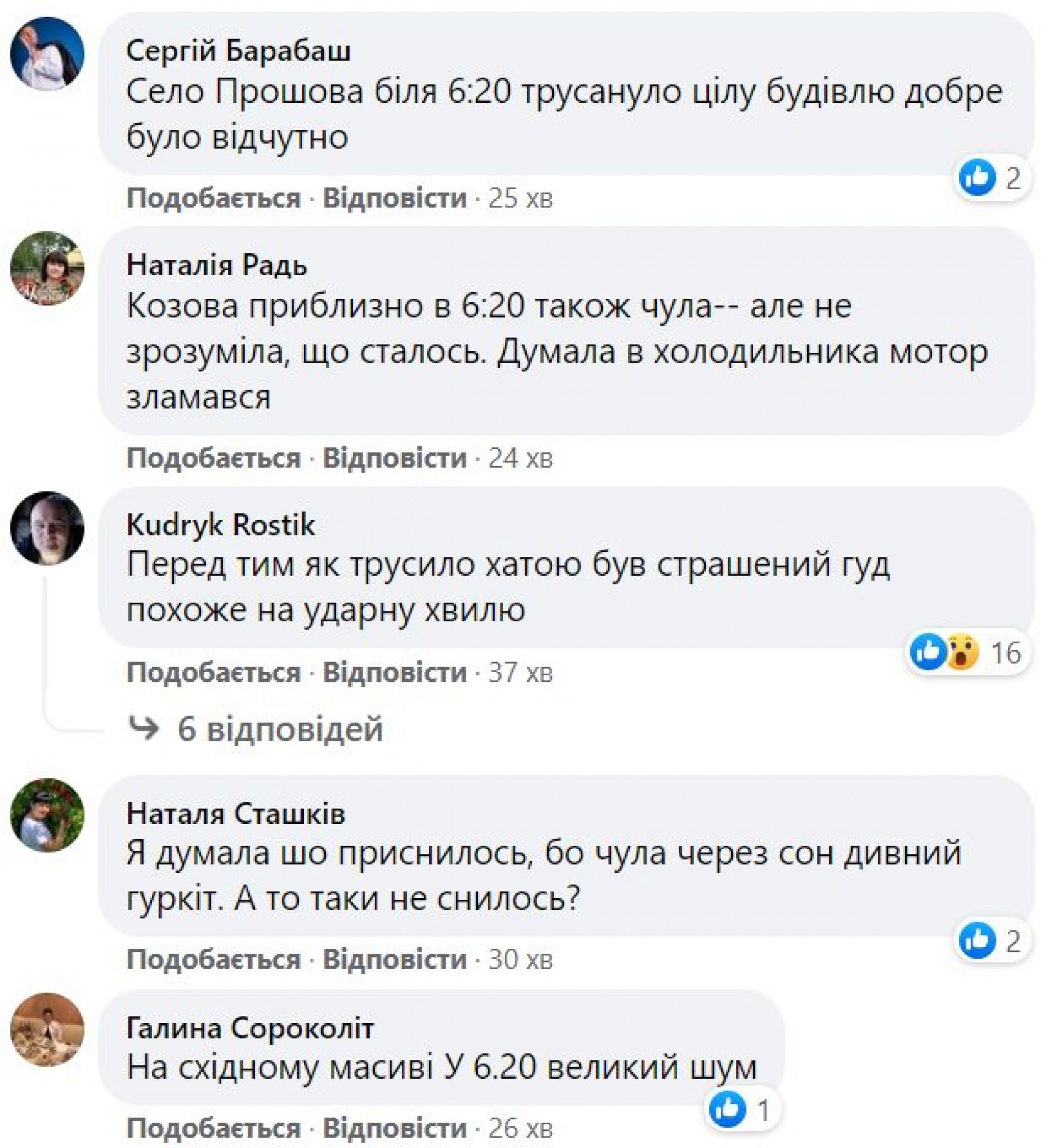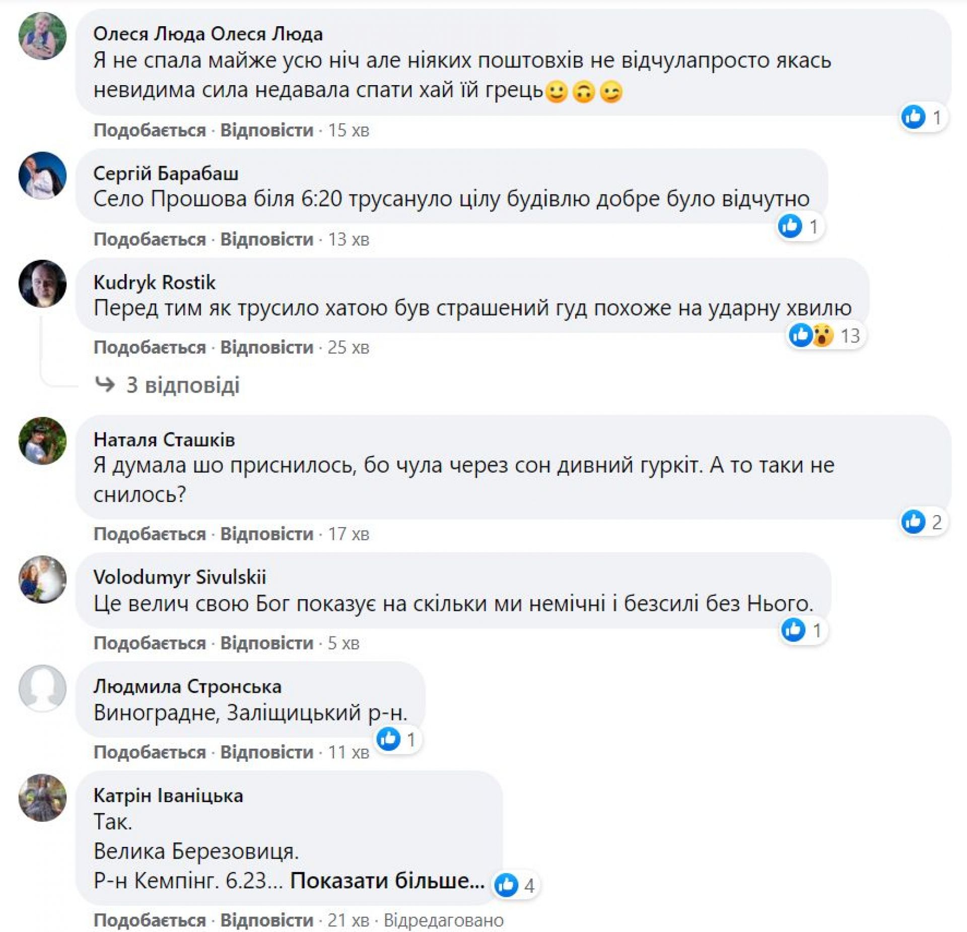 – Я також чула. Таке було відчуття, що під хатою проїхала велика вантажна машина. Трясло ліжком, с. Котів, – пише Марія Ребуха.