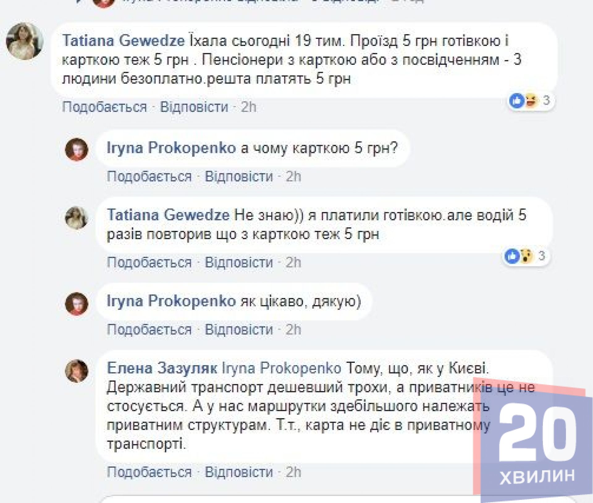 "Їхала сьогодні 19- тим. Проїзд 5 грн готівкою і карткою теж 5 грн . Пенсіонери з карткою або з посвідченням - 3 людини безоплатно, решта платять 5 грн", - пише Тетяна Геведзе.