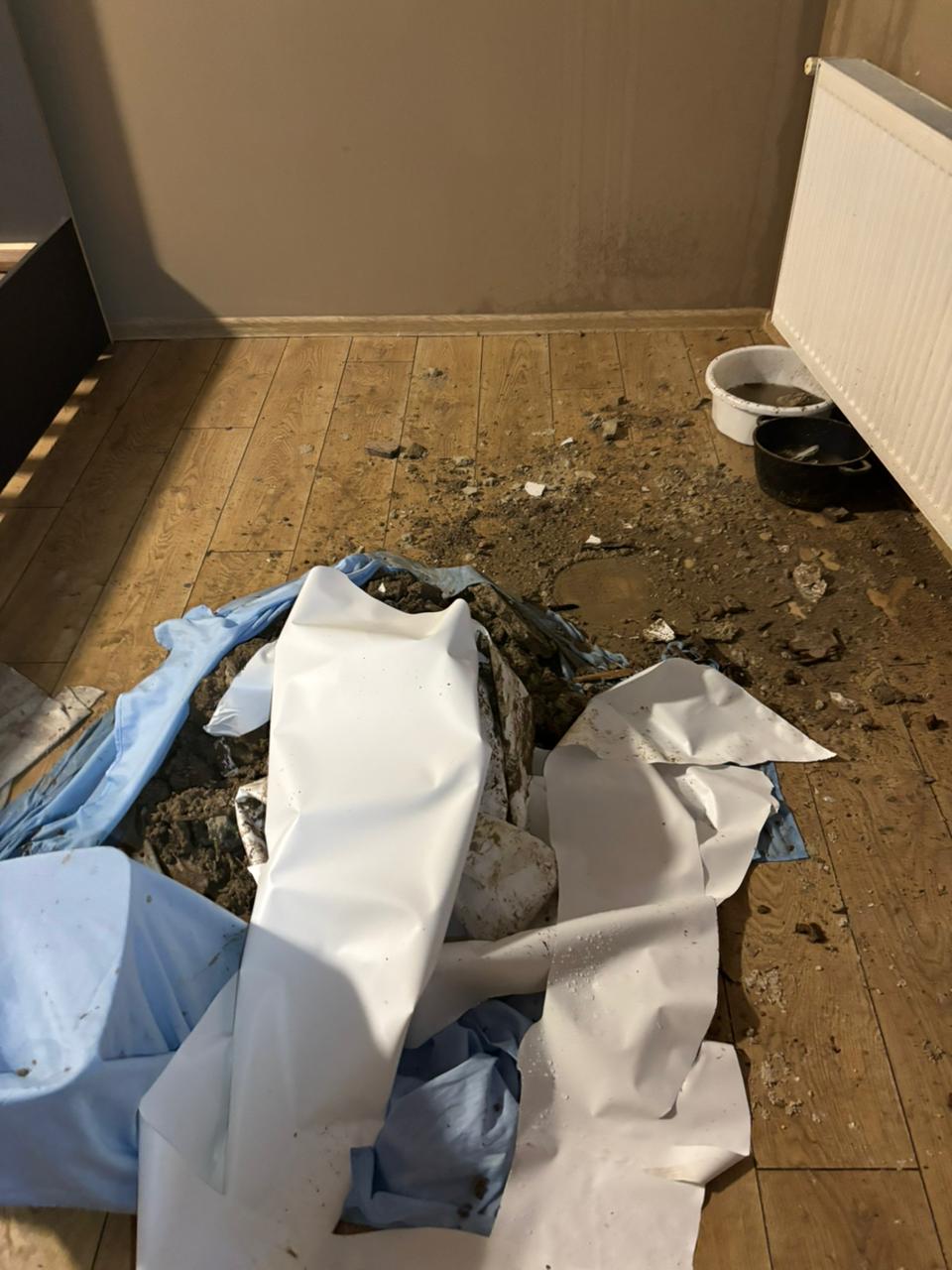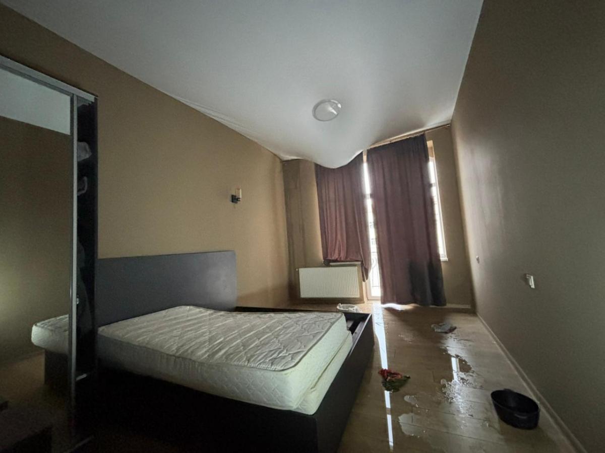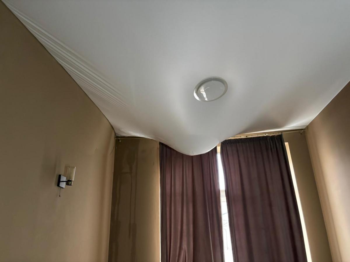 24 лютого орендарка повідомила, що прийшли майстри, оглянули все і пішли на горище. Коли зняли підвісну конструкцію, побачили, що в стелі дірка. За словами орендарки, близько 30-40 кг піску, каміння, штукатурки звалилося на натяжну стелю, а вода, яка стікала з дірявої покрівлі, весь час прибувала і накопичувалася.