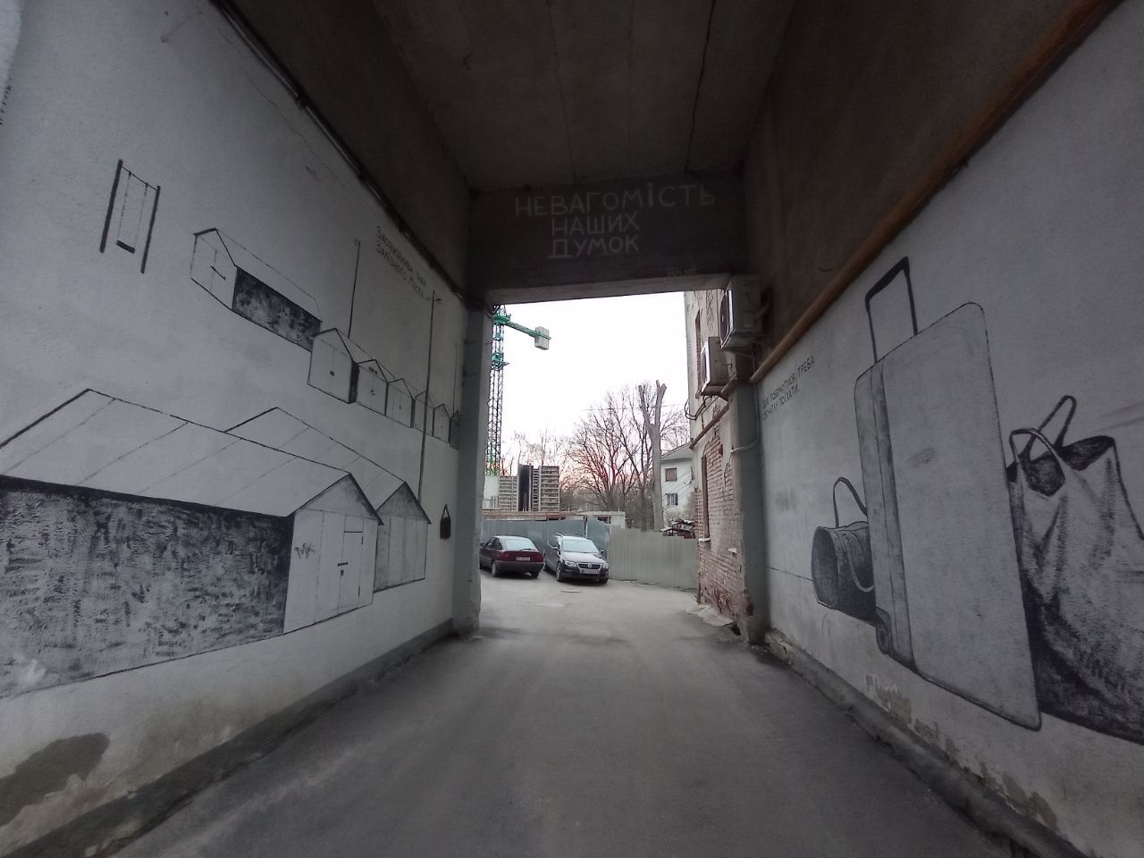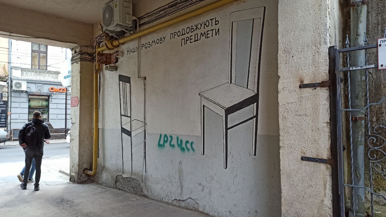 На вході до двору будинку №25 є малюнок стільців та напис «Нашу розмову продовжують предмети».