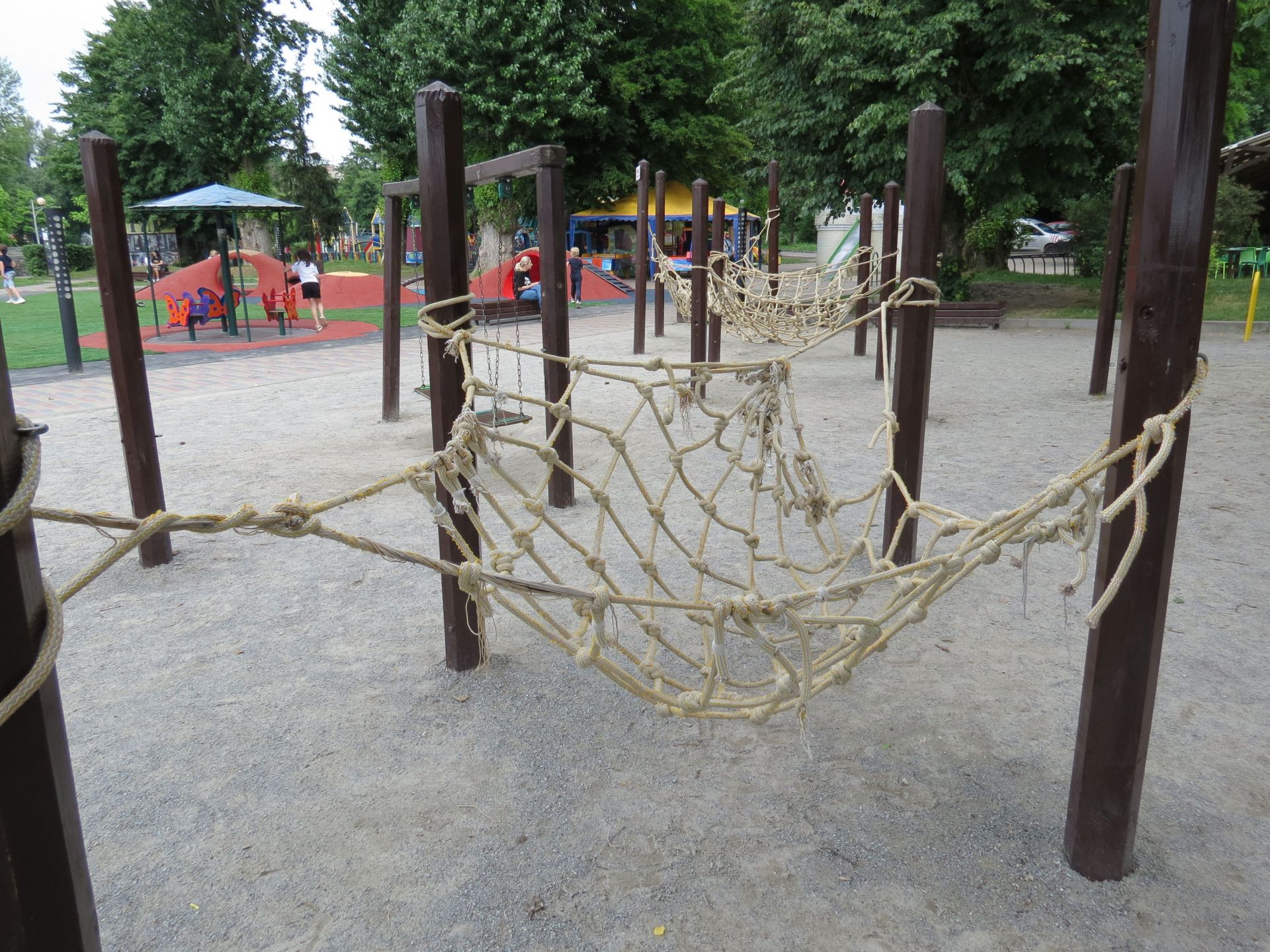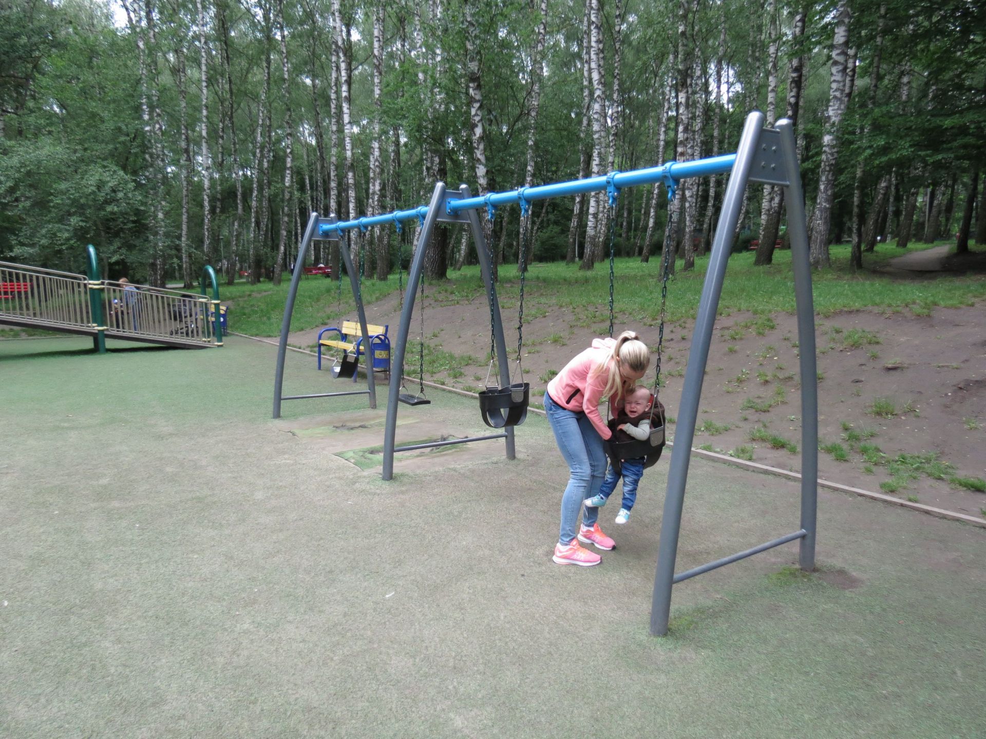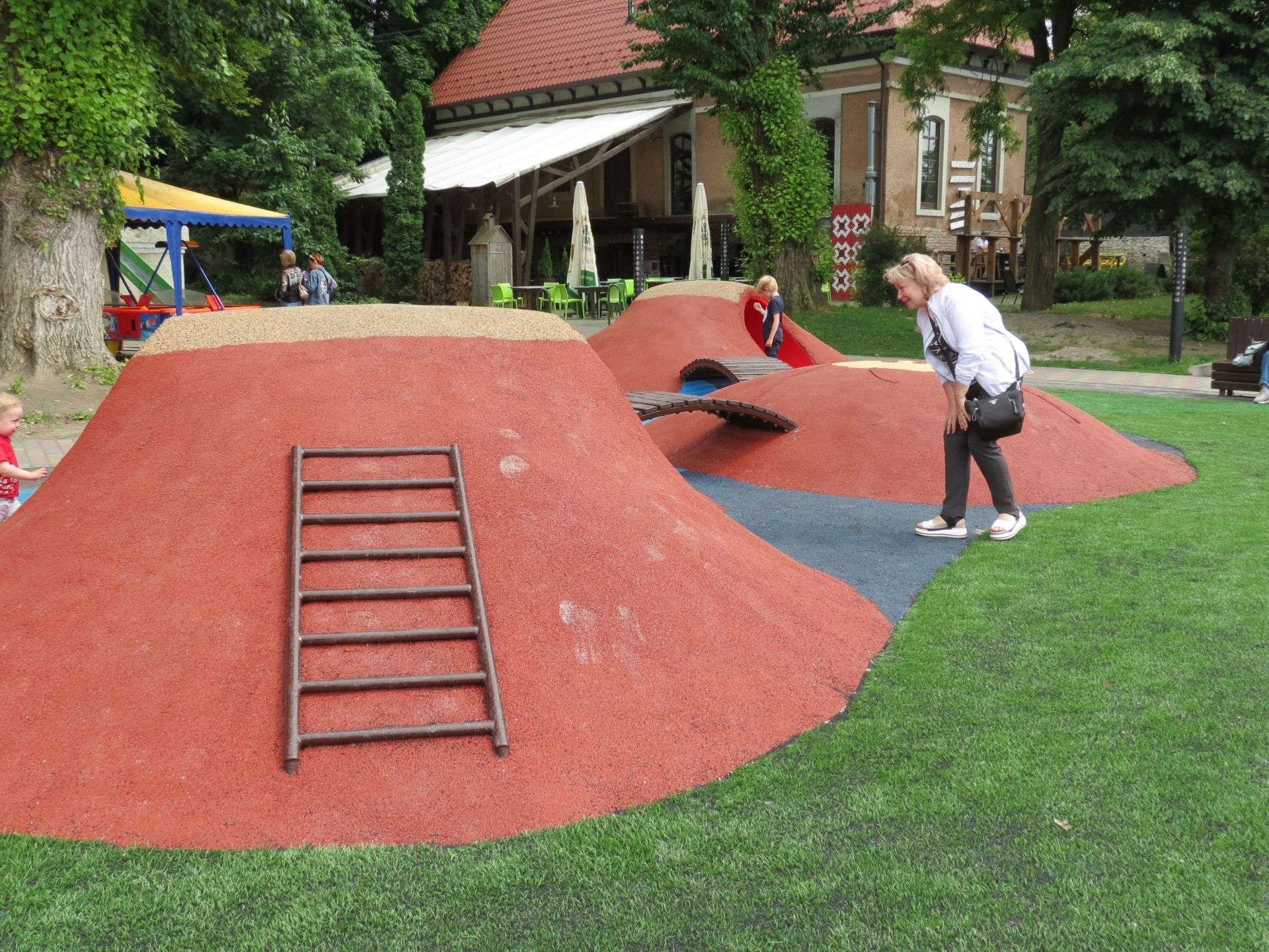 У цьому парку один великий дитячий майданчик. Він загороджений невисоким парканом. Там є локації для дітей різного віку – будиночок. Пісочниці, гойдалки, каруселі. Ми помітили, що пошкоджені дерев’яні елементи замінили. Також пофарбували. А от покриття майданчика не найкраще – земля та дрібна галька. В деяких місцях росте трава.