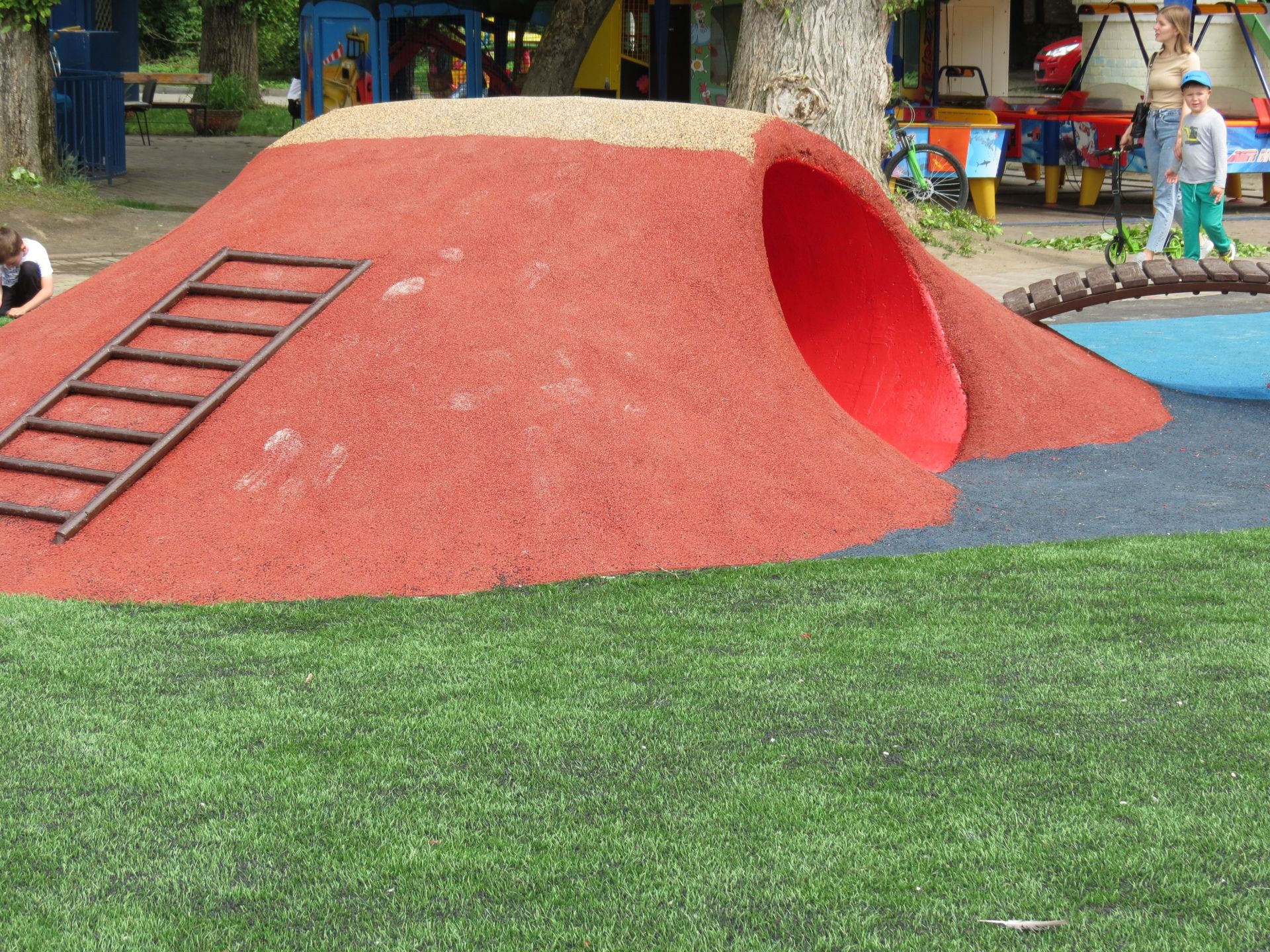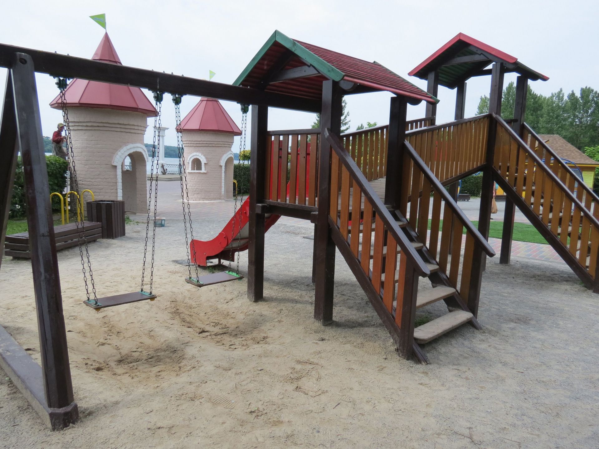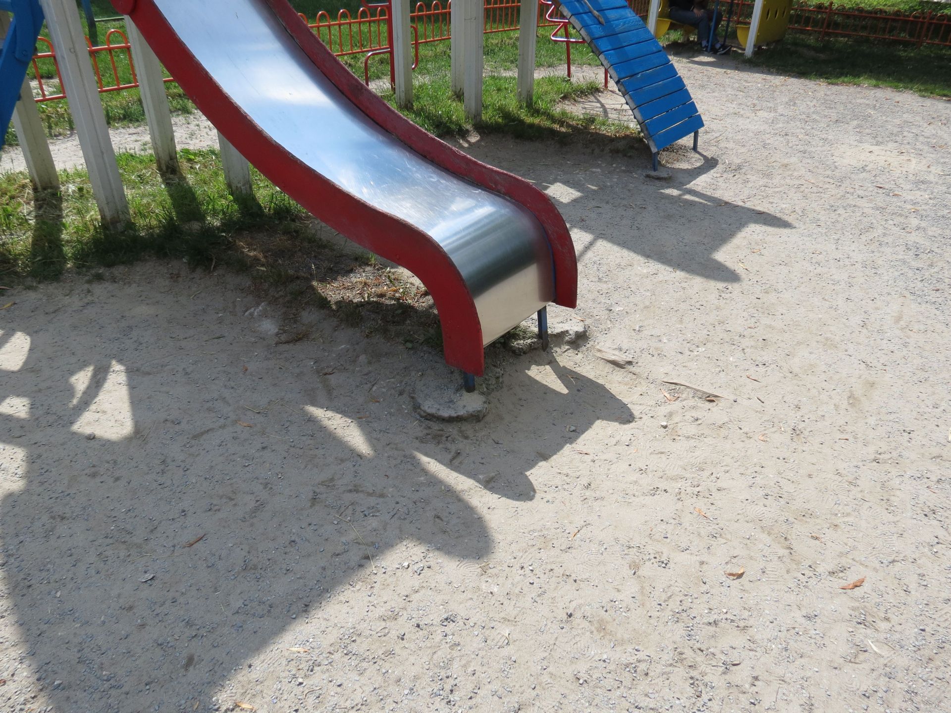 Біля атракціонів є ще один дитячий майданчик. Там – ще гірка, гойдалки, пісочниця. Безпечного м’якого покриття немає. Раніше на майданчику лежало кілька бетонних плит, через які можна було спіткнутися. Їх нарешті забрали.