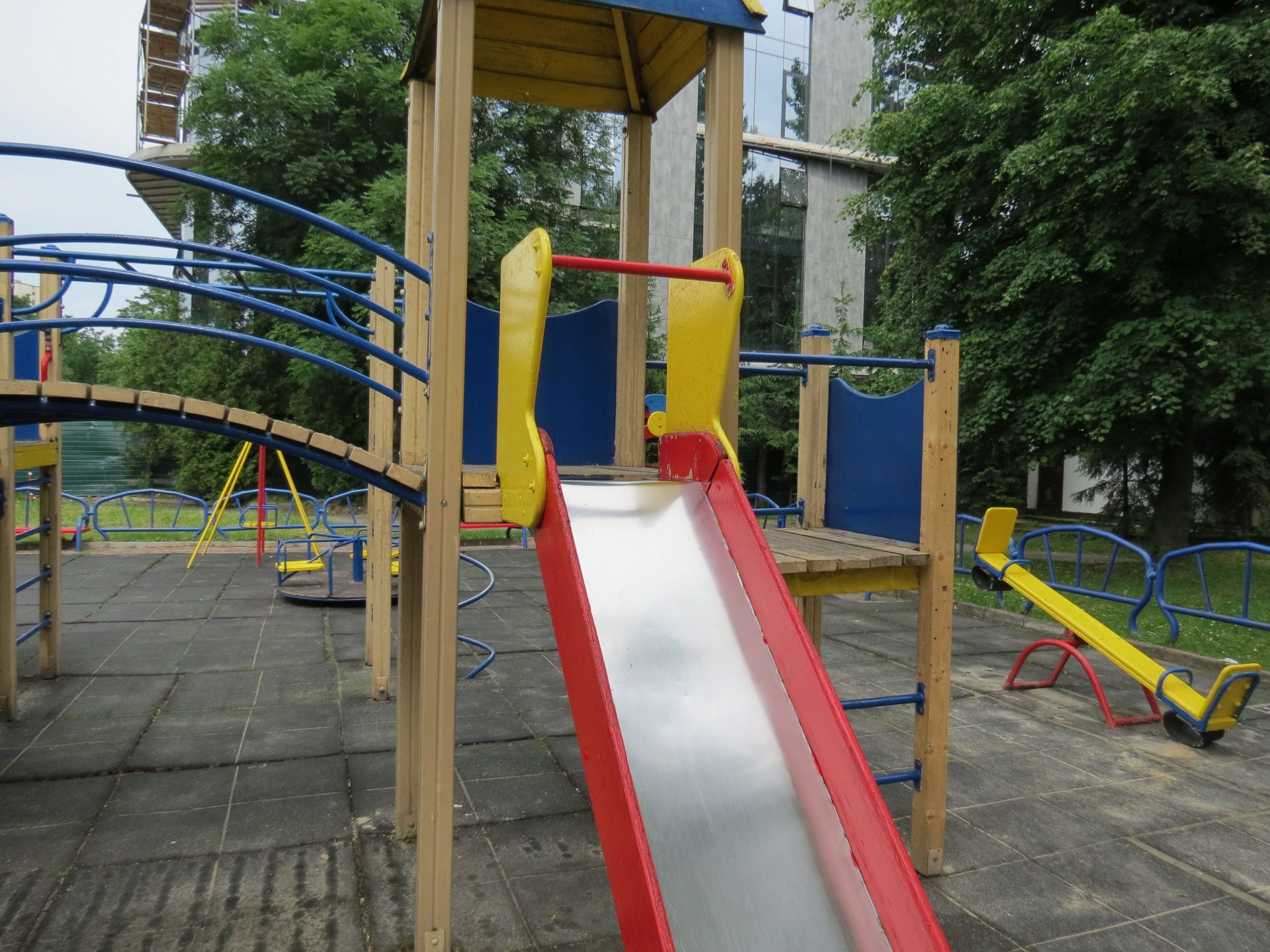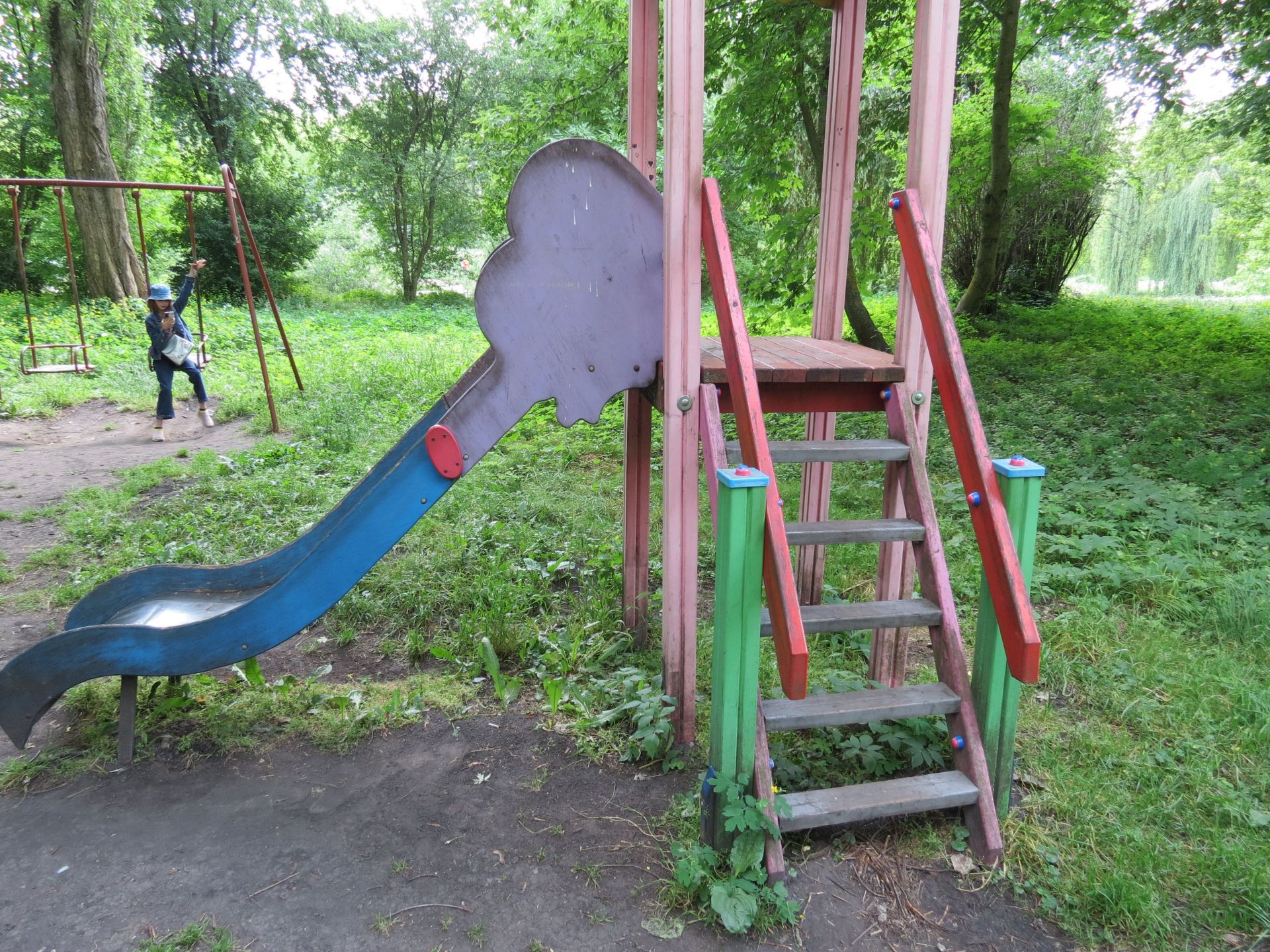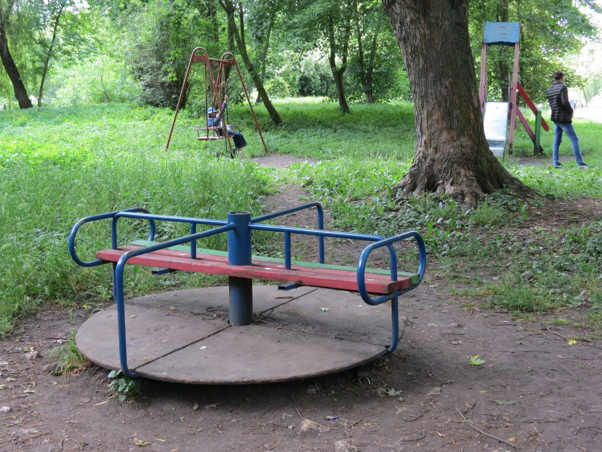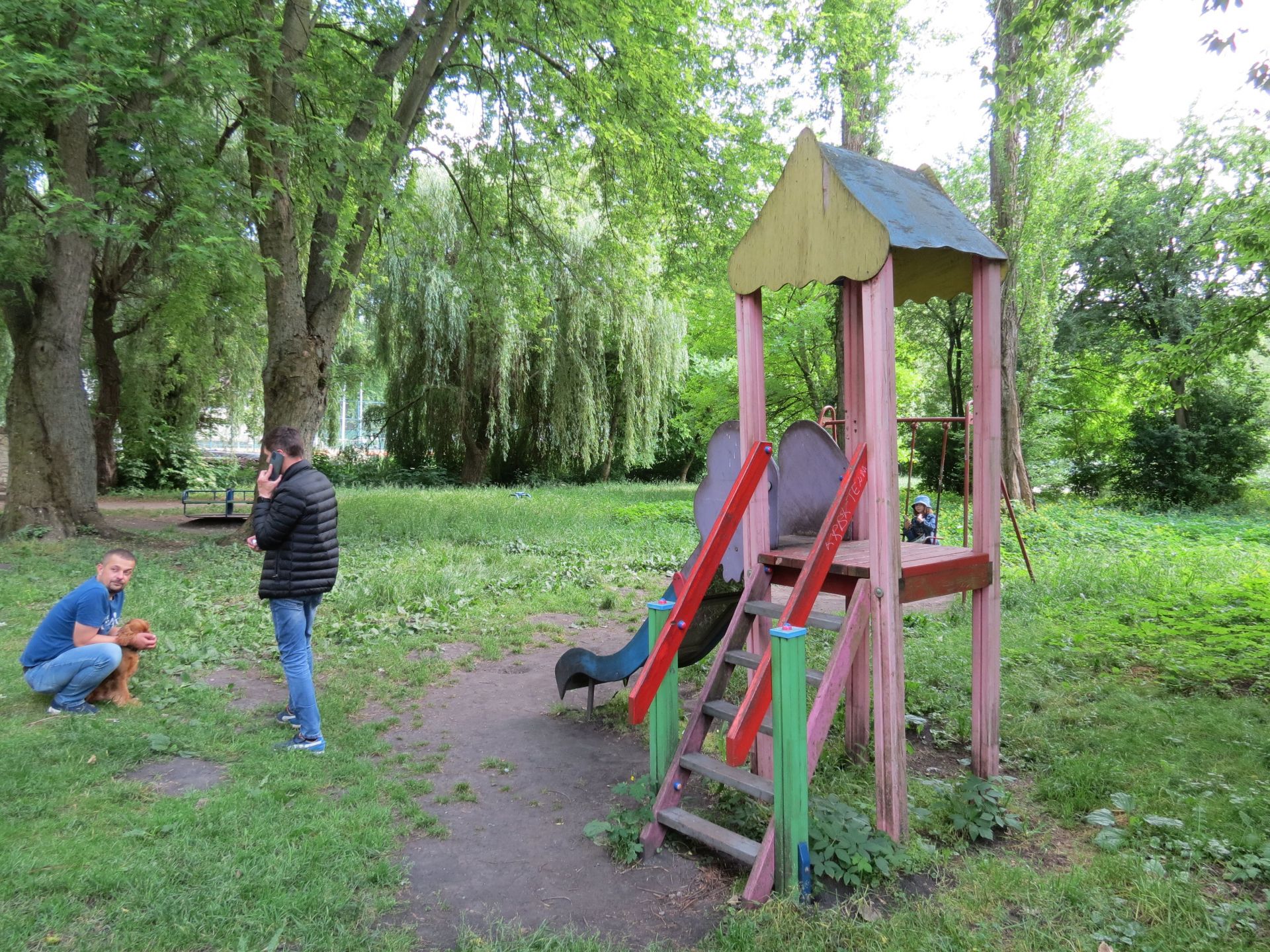Ще одна локація розташована неподалік тренажерів. Дитячим майданчиком це назвати важко, адже тут є лише гірка, карусель та дві гойдалки. Фарба з деревини вже облупилась. У деяких місцях фанерне покриття розшарувалося. Спеціального покриття теж немає – лише земля та трава.