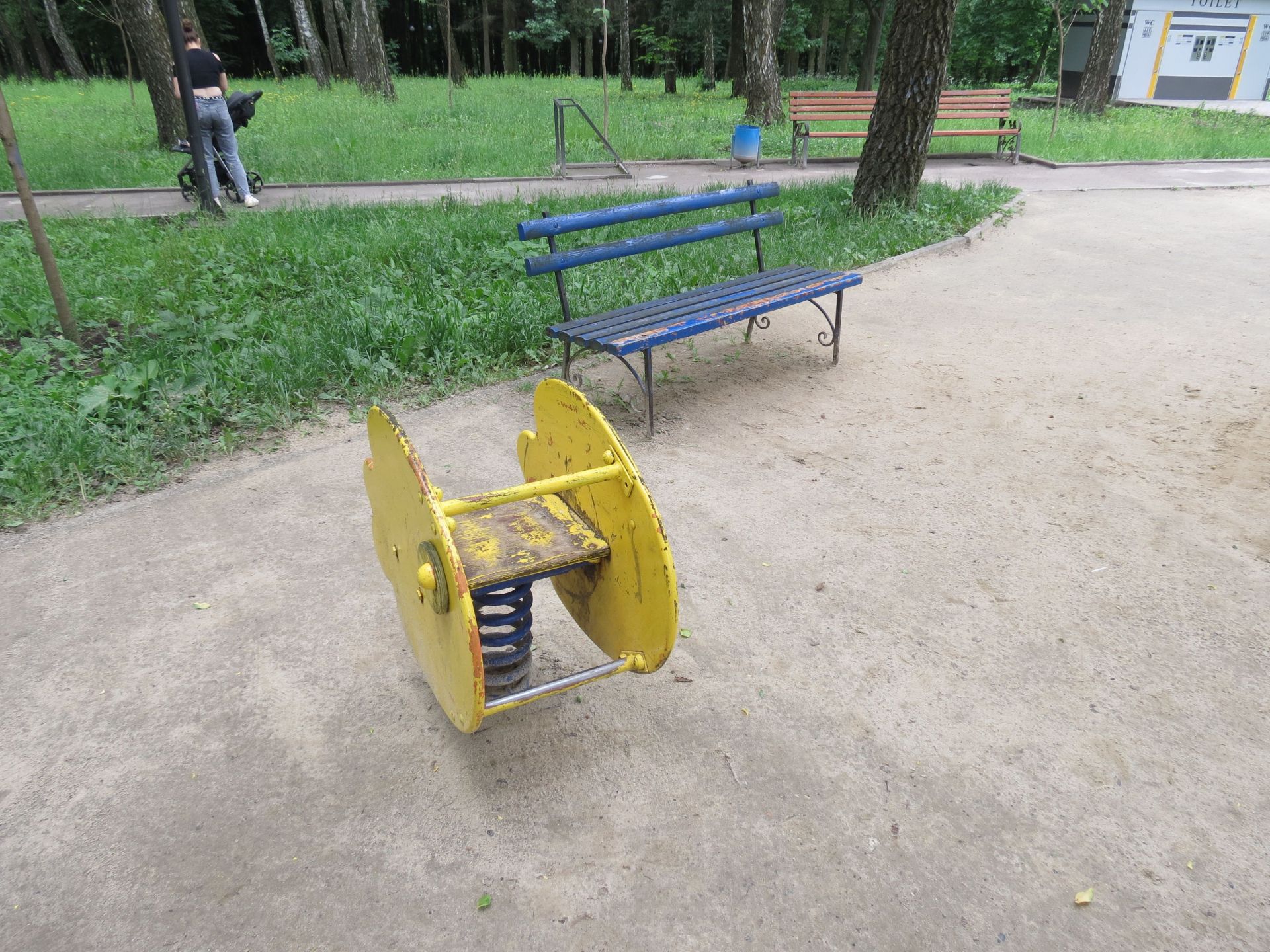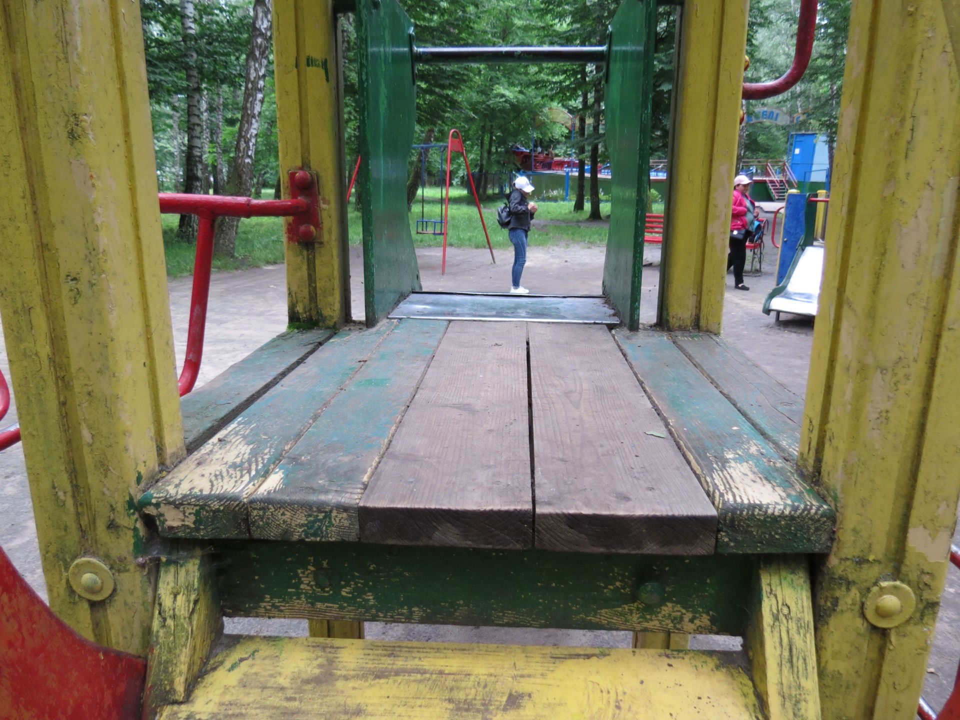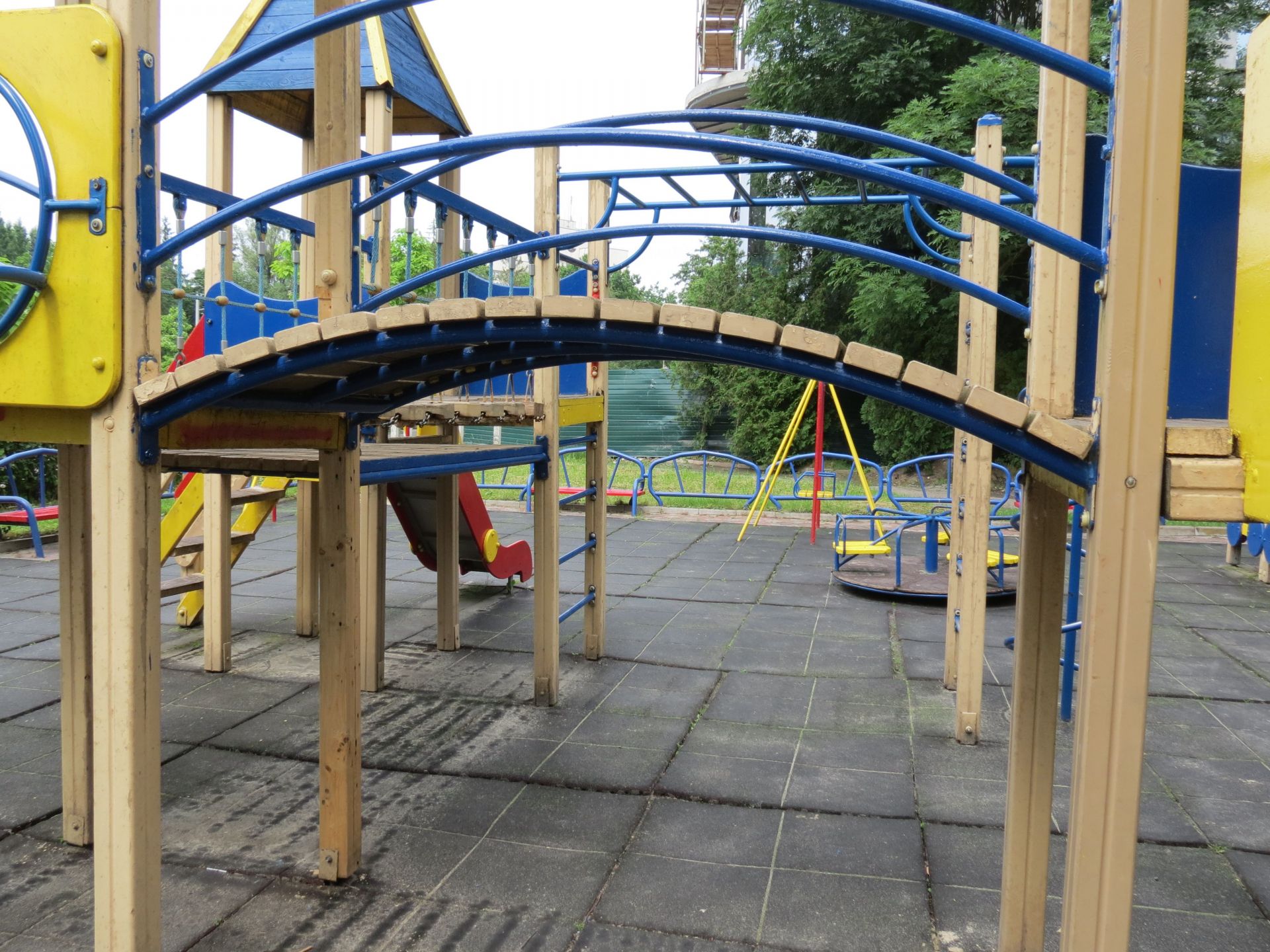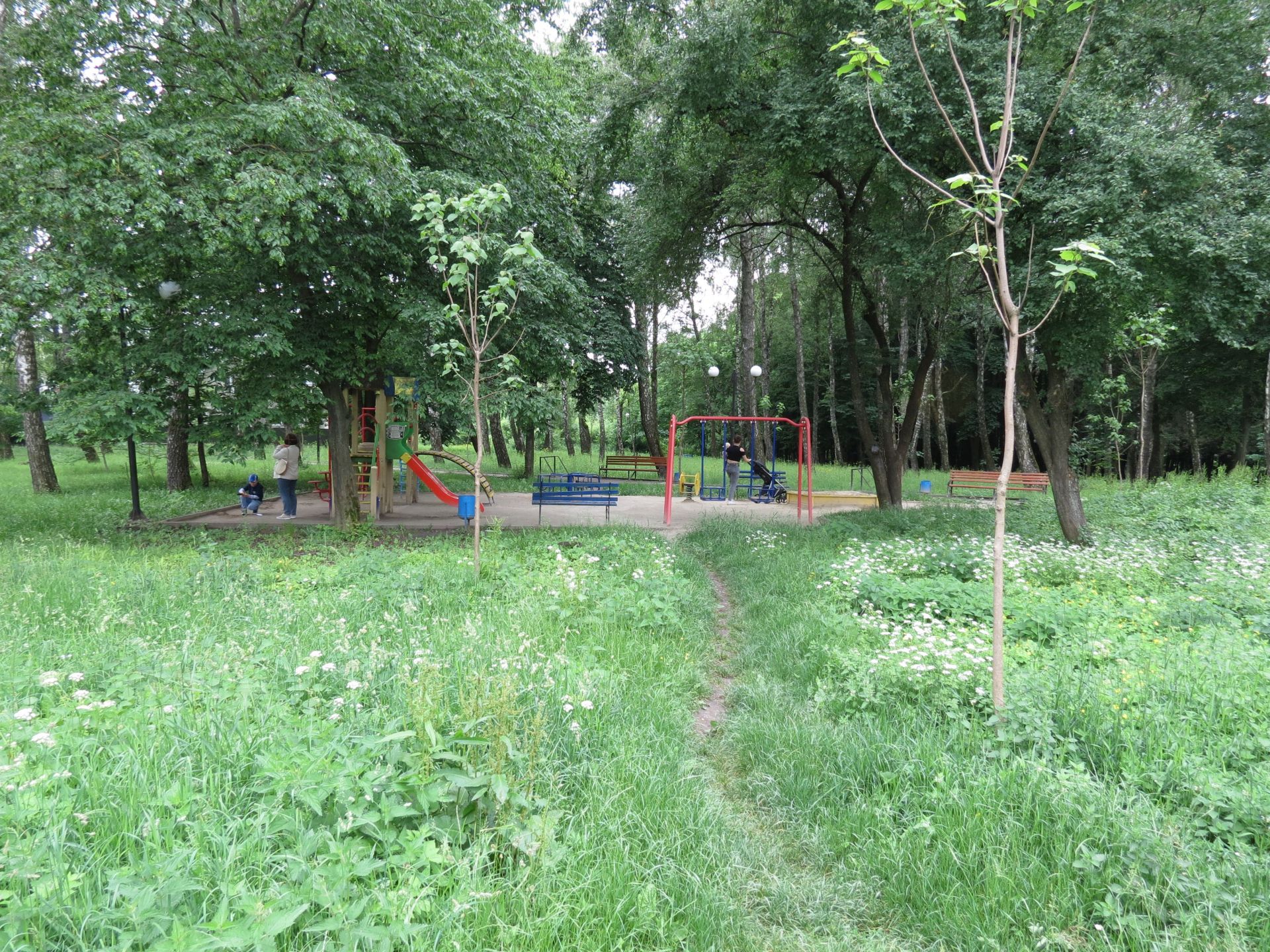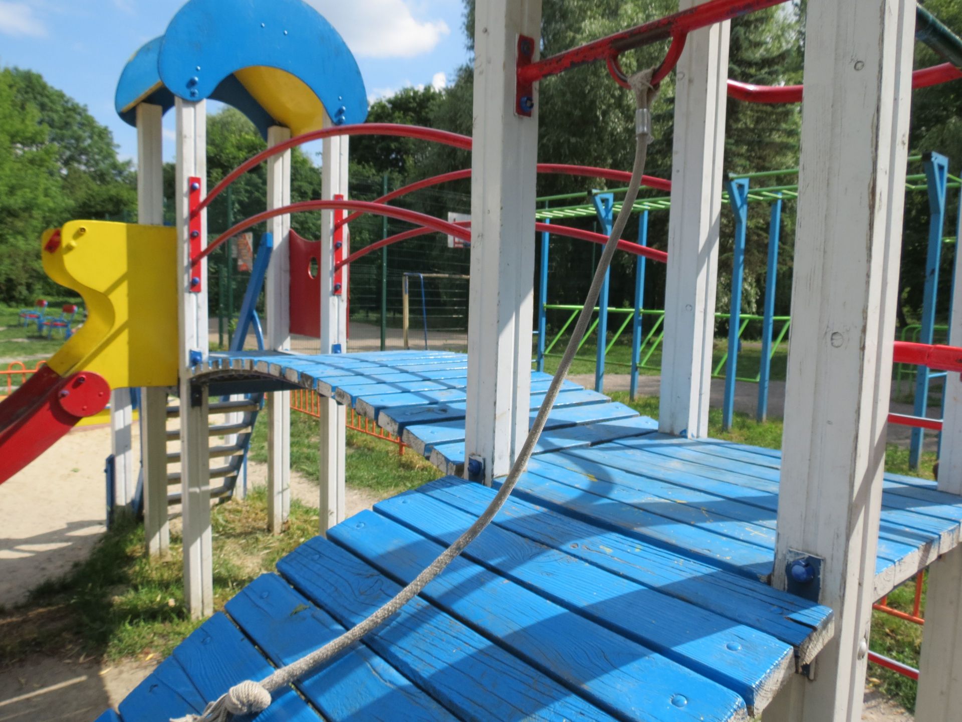 Ще одна локація розташована неподалік тренажерів. Дитячим майданчиком це назвати важко, адже тут є лише гірка, карусель та дві гойдалки. Фарба з деревини вже облупилась. У деяких місцях фанерне покриття розшарувалося. Спеціального покриття теж немає – лише земля та трава.