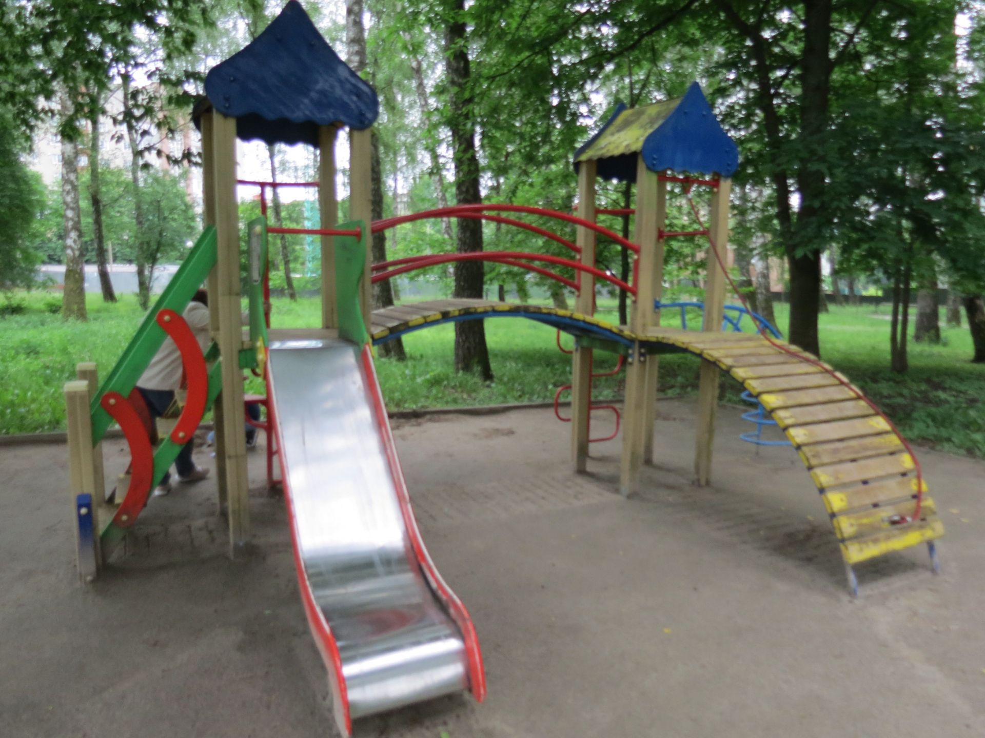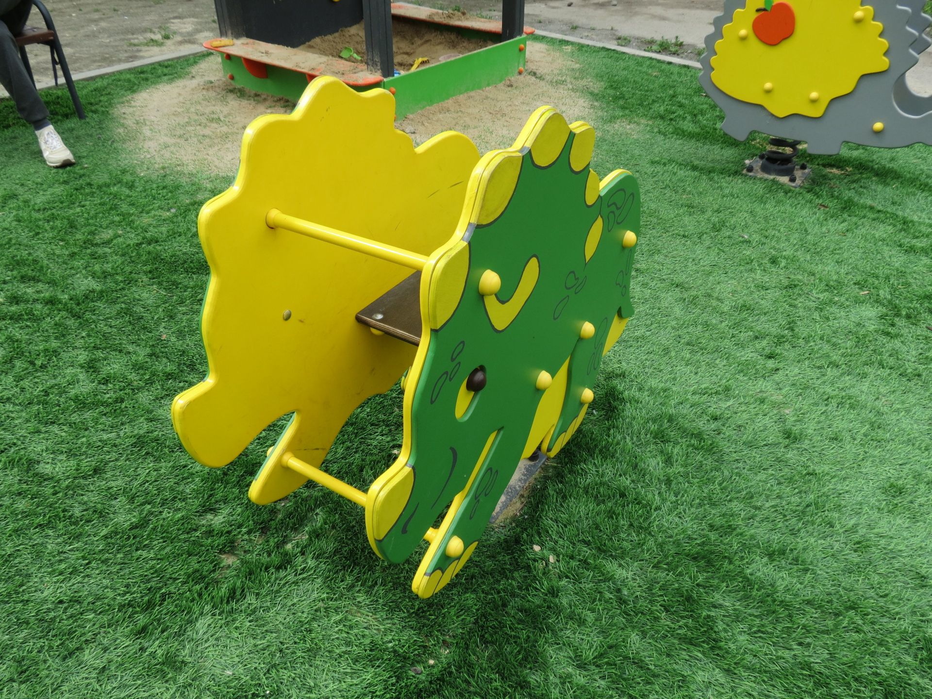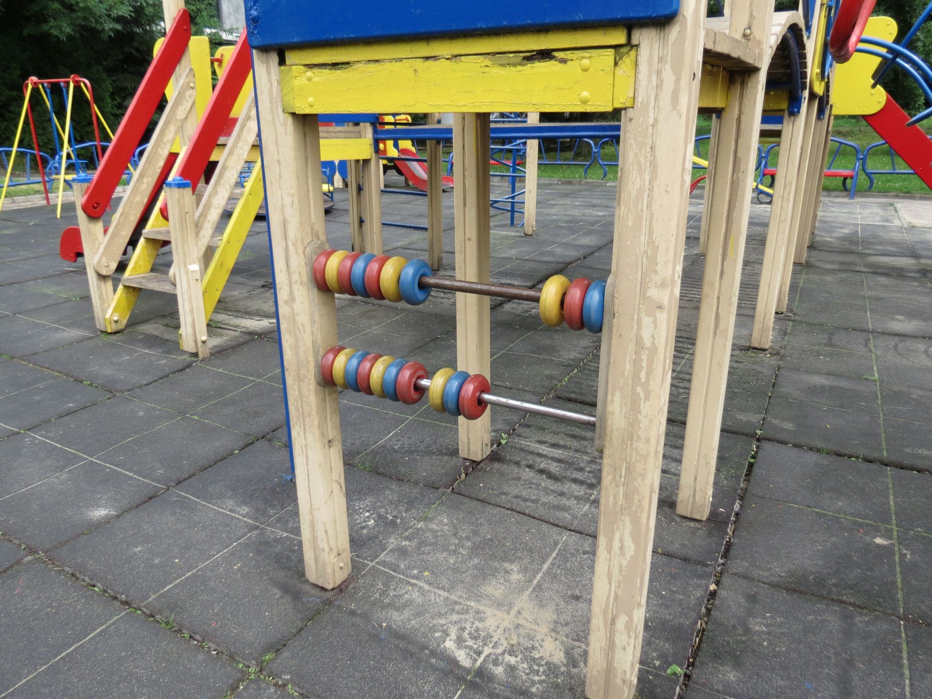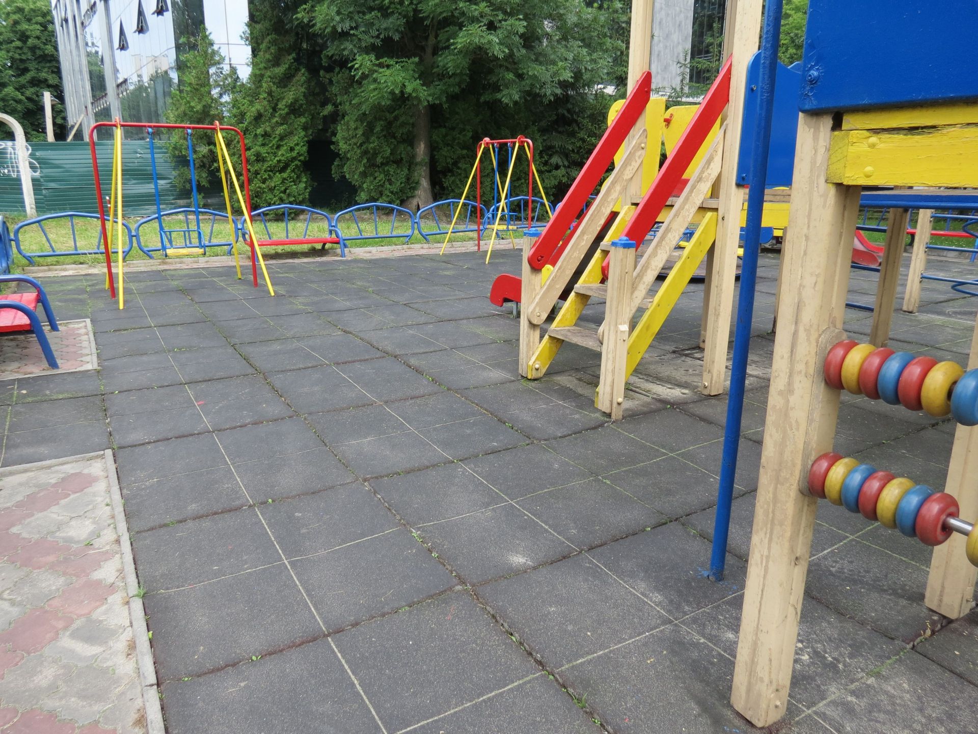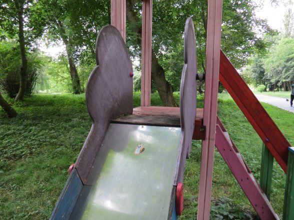 Ще одна локація розташована неподалік тренажерів. Дитячим майданчиком це назвати важко, адже тут є лише гірка, карусель та дві гойдалки. Фарба з деревини вже облупилась. У деяких місцях фанерне покриття розшарувалося. Спеціального покриття теж немає – лише земля та трава.