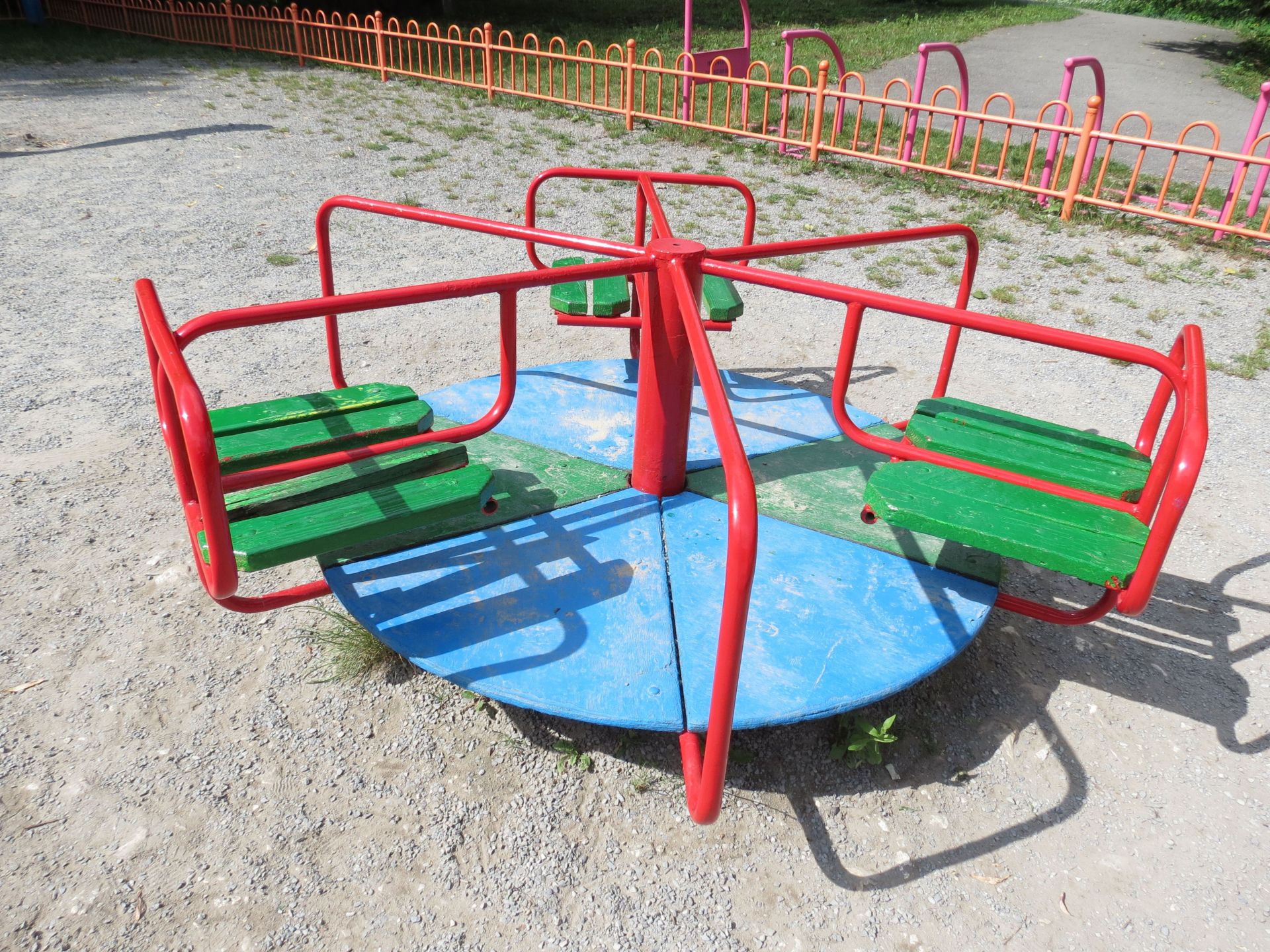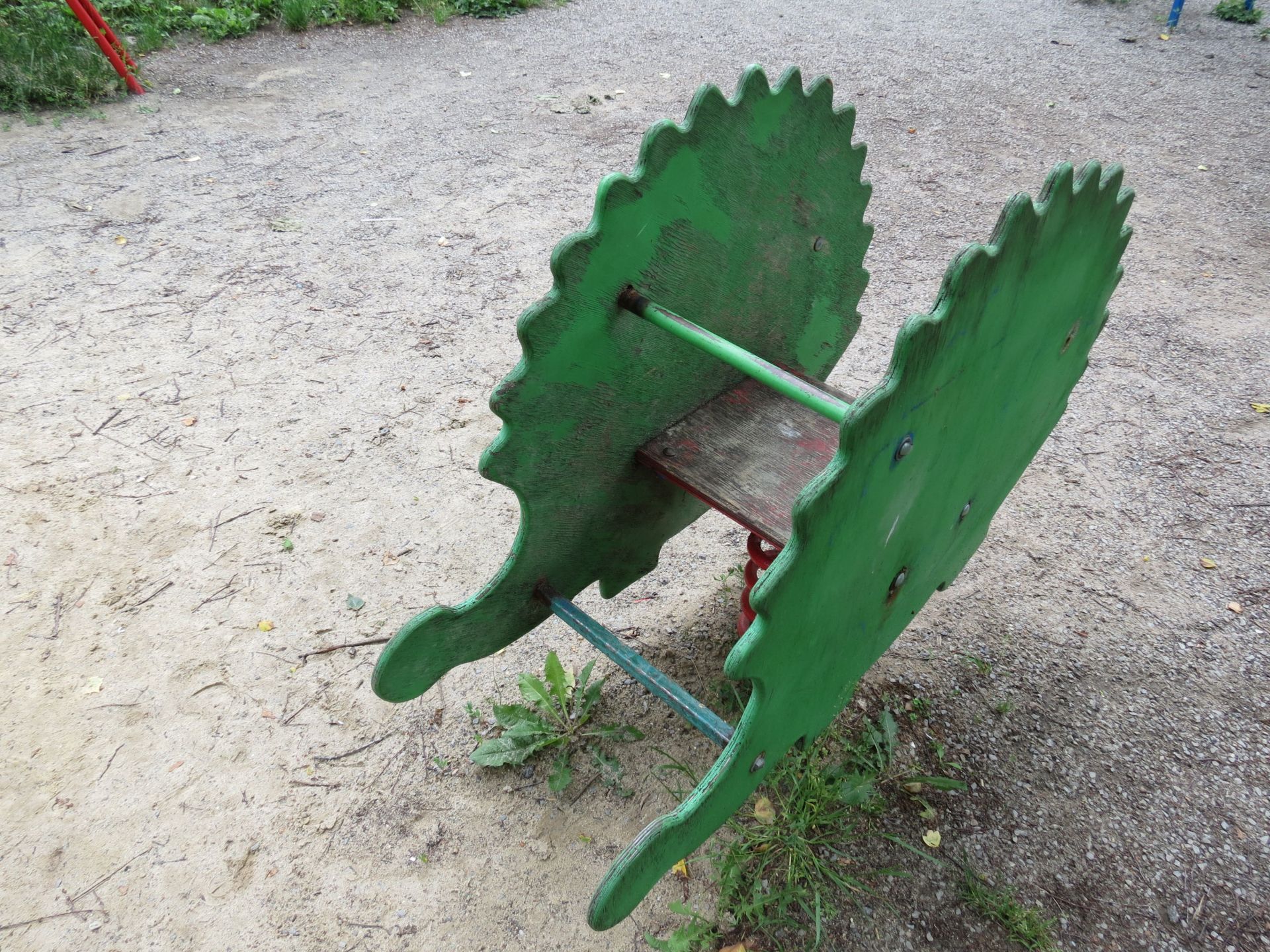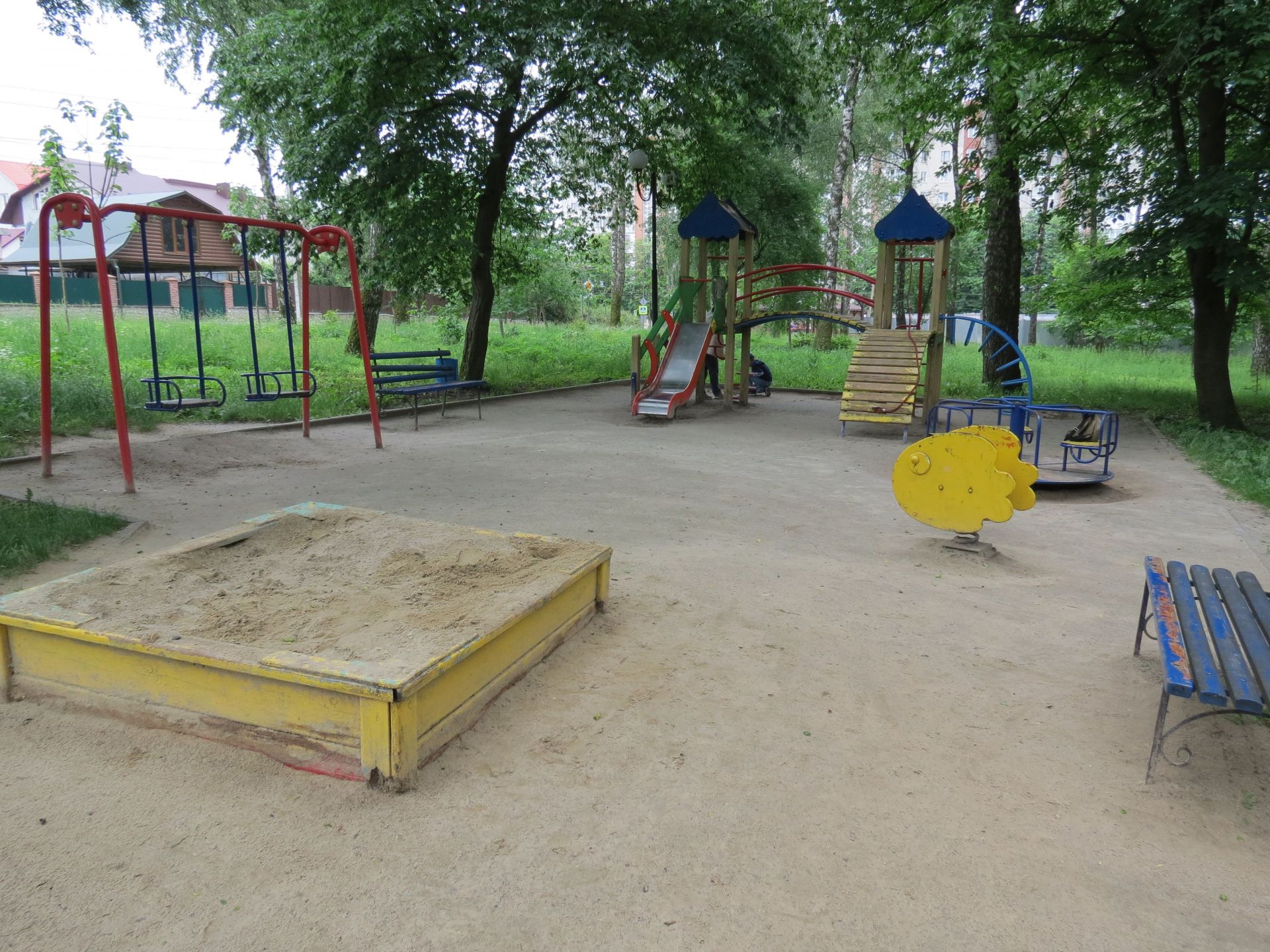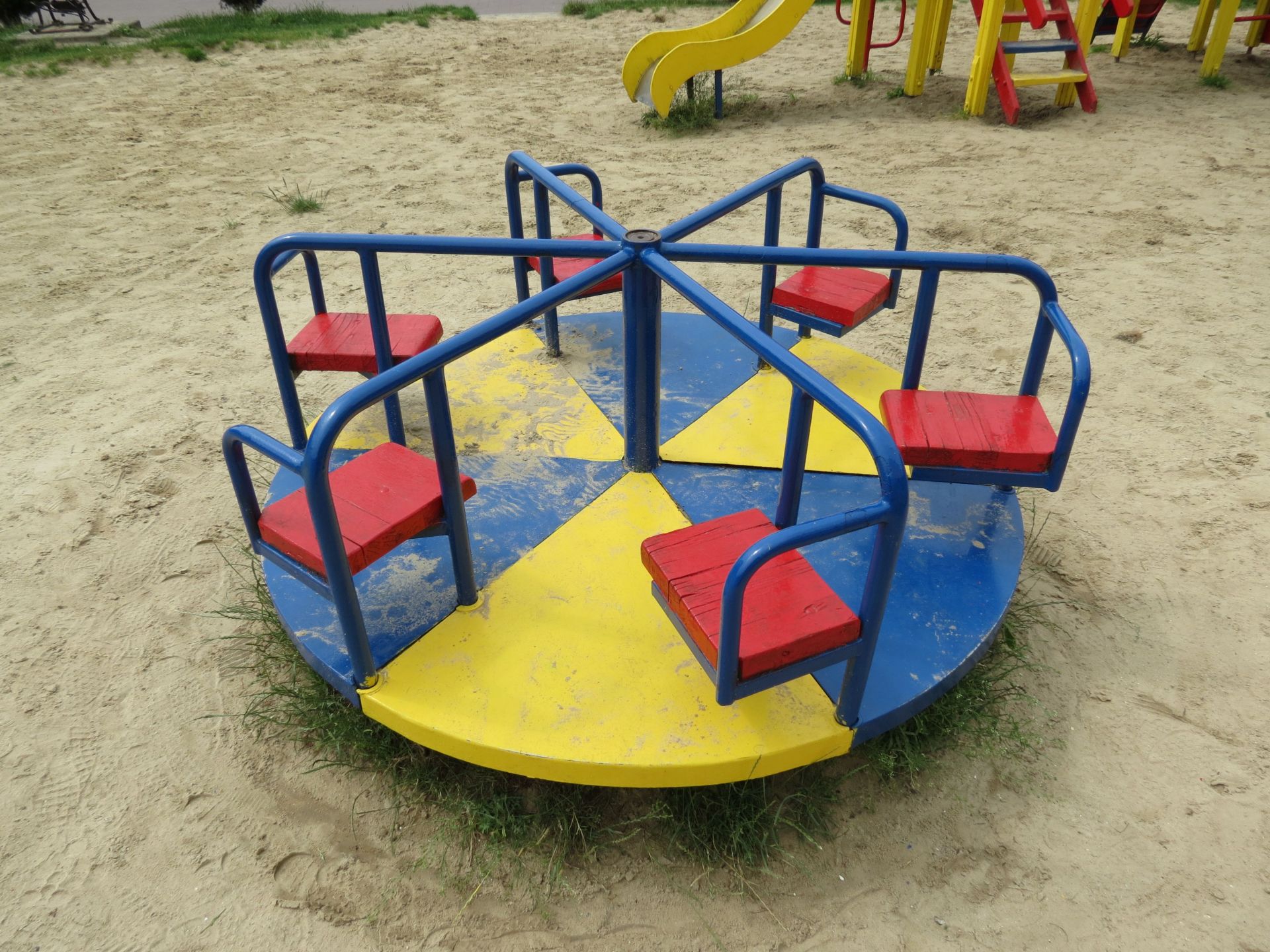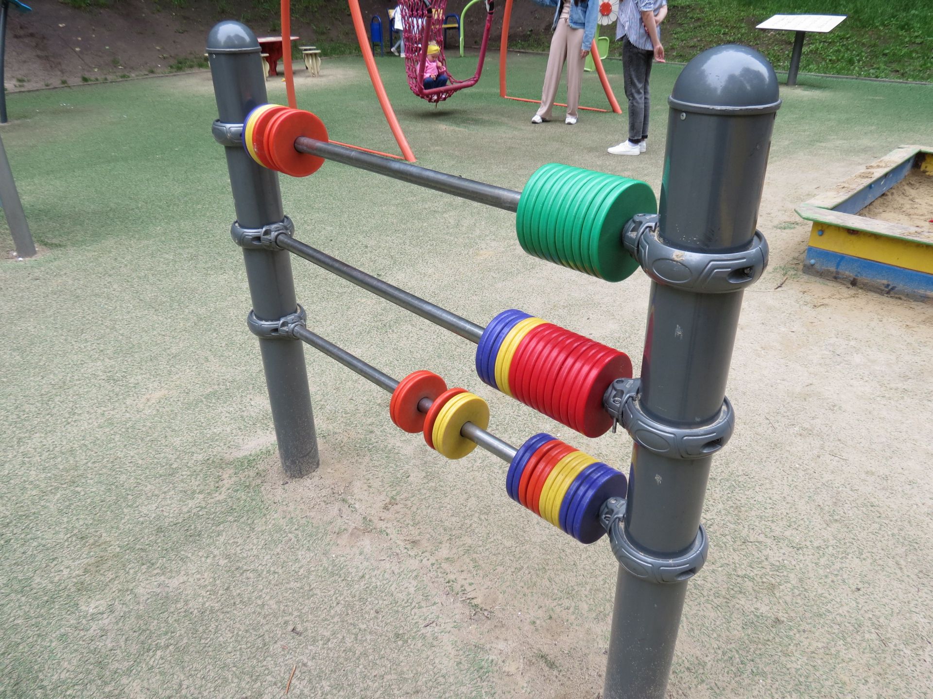 Ще одна локація розташована неподалік тренажерів. Дитячим майданчиком це назвати важко, адже тут є лише гірка, карусель та дві гойдалки. Фарба з деревини вже облупилась. У деяких місцях фанерне покриття розшарувалося. Спеціального покриття теж немає – лише земля та трава.