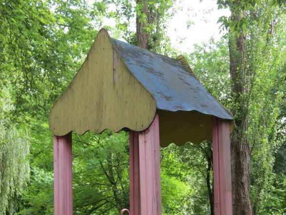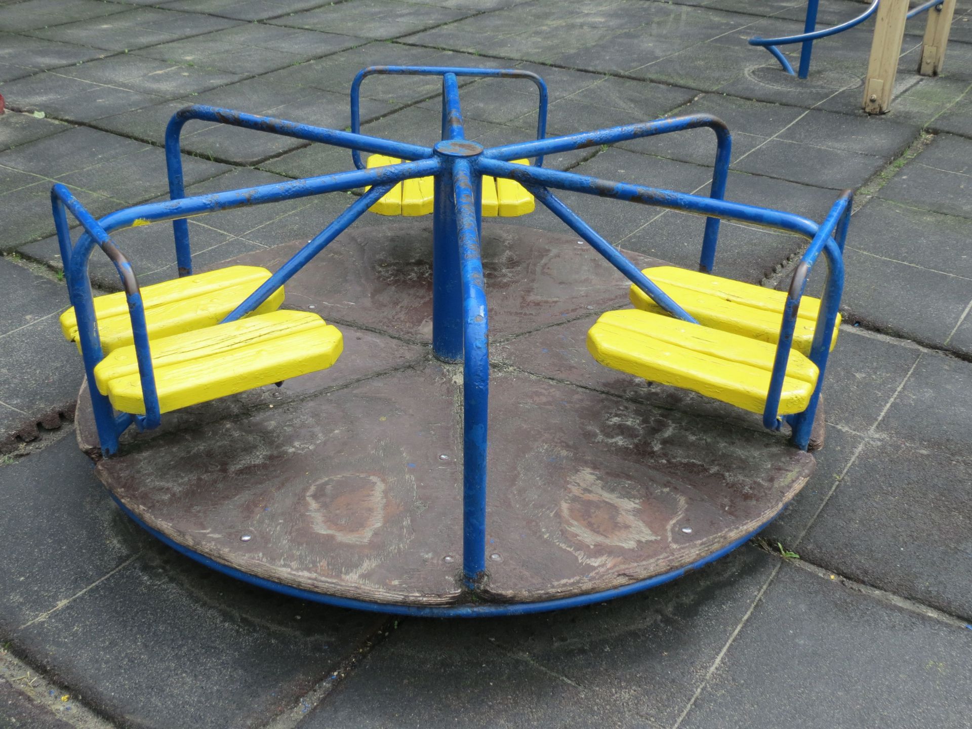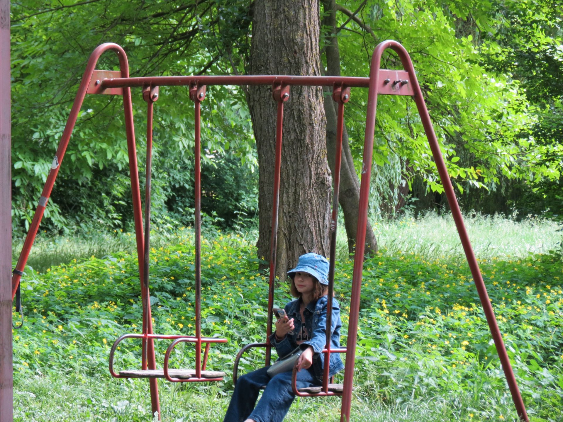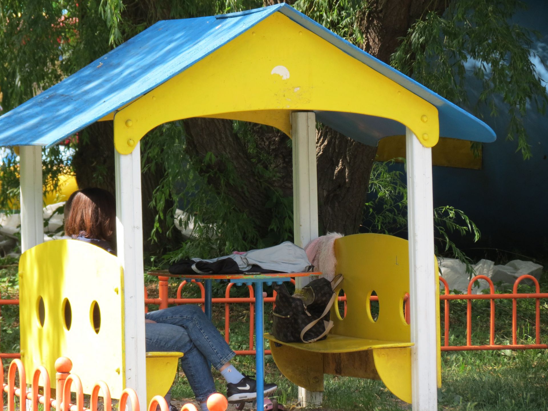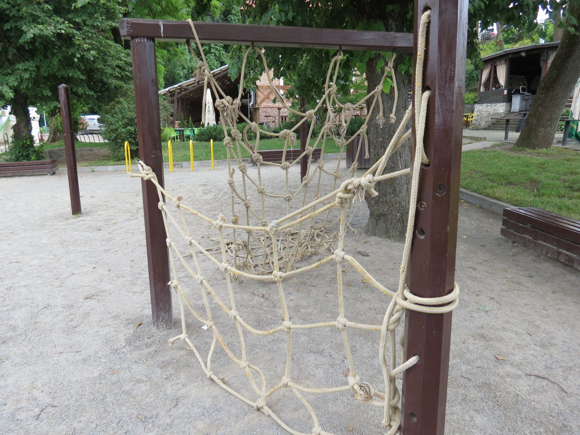 Ще одна локація розташована неподалік тренажерів. Дитячим майданчиком це назвати важко, адже тут є лише гірка, карусель та дві гойдалки. Фарба з деревини вже облупилась. У деяких місцях фанерне покриття розшарувалося. Спеціального покриття теж немає – лише земля та трава.