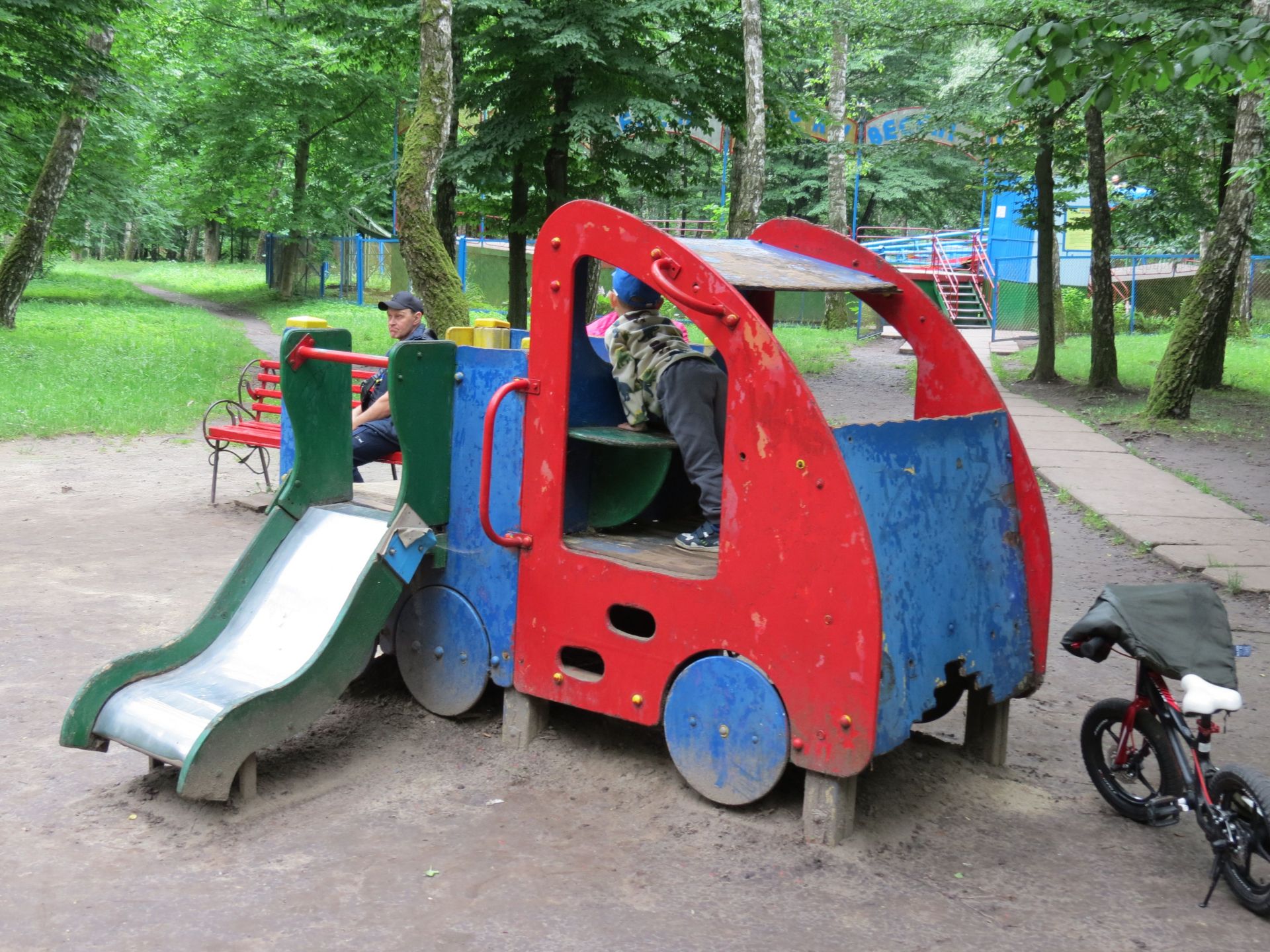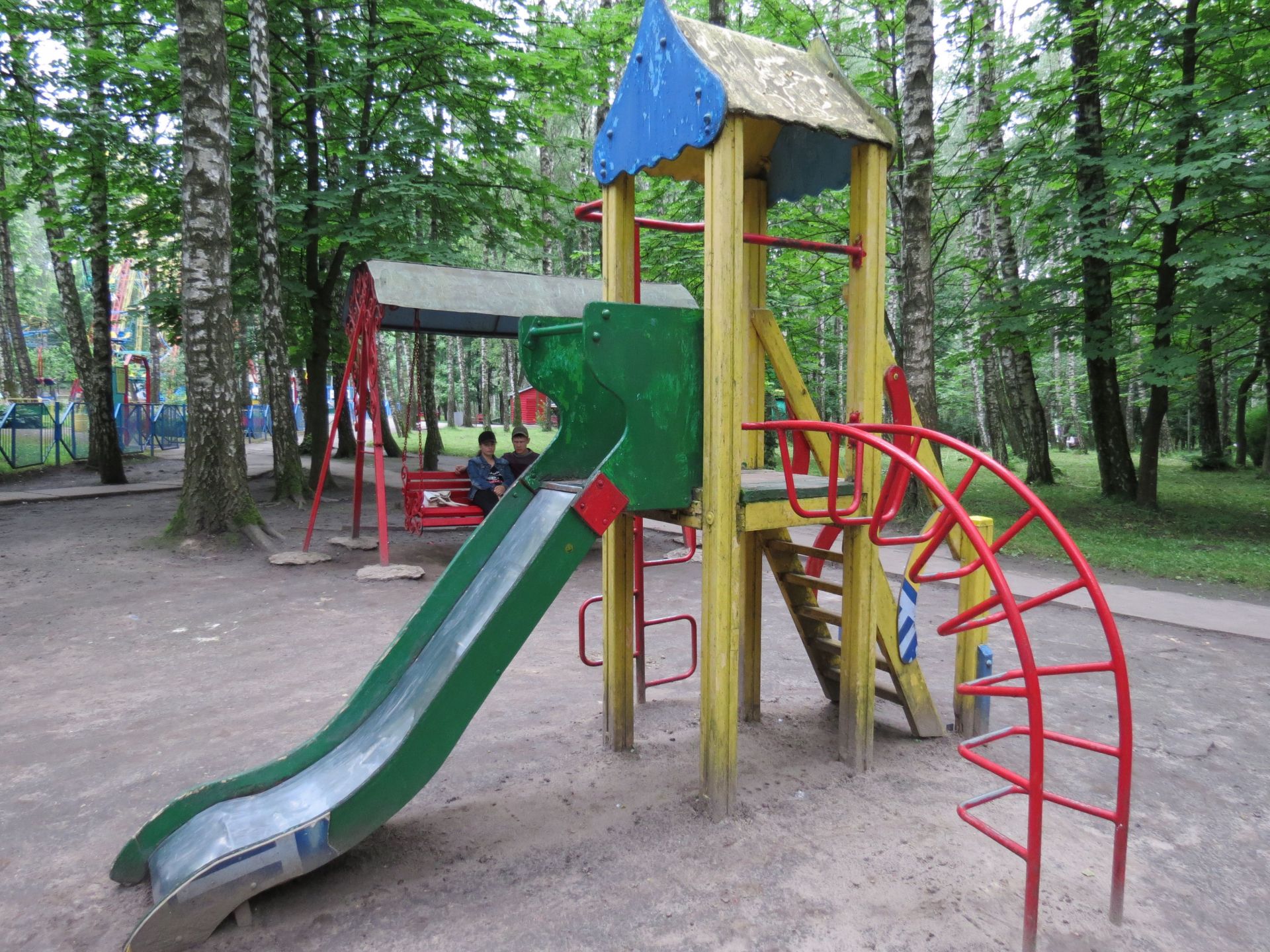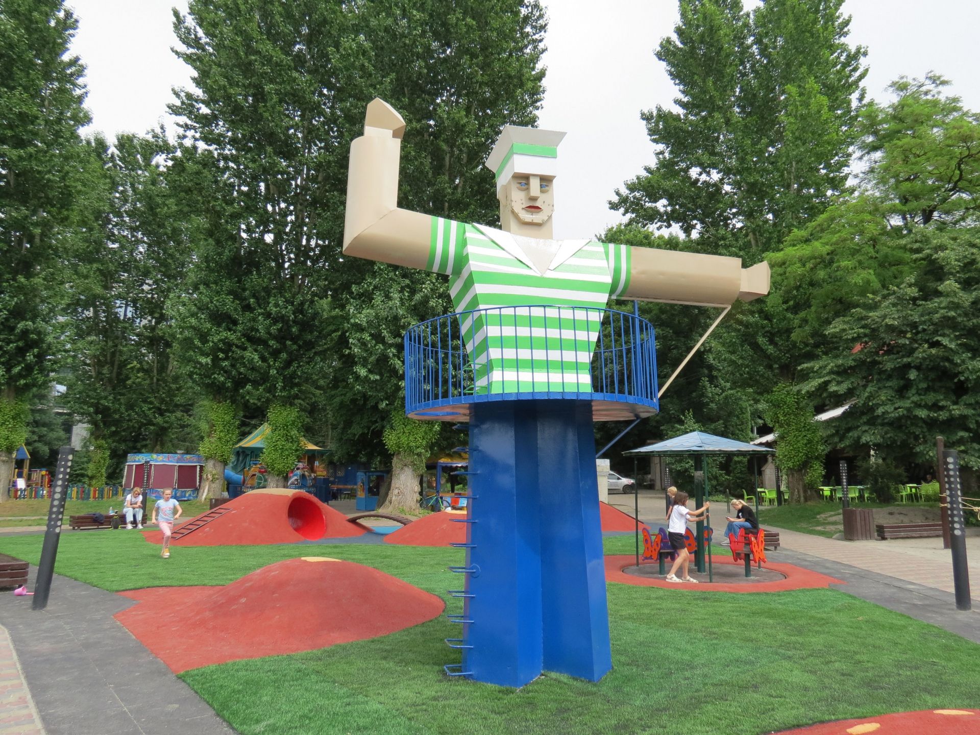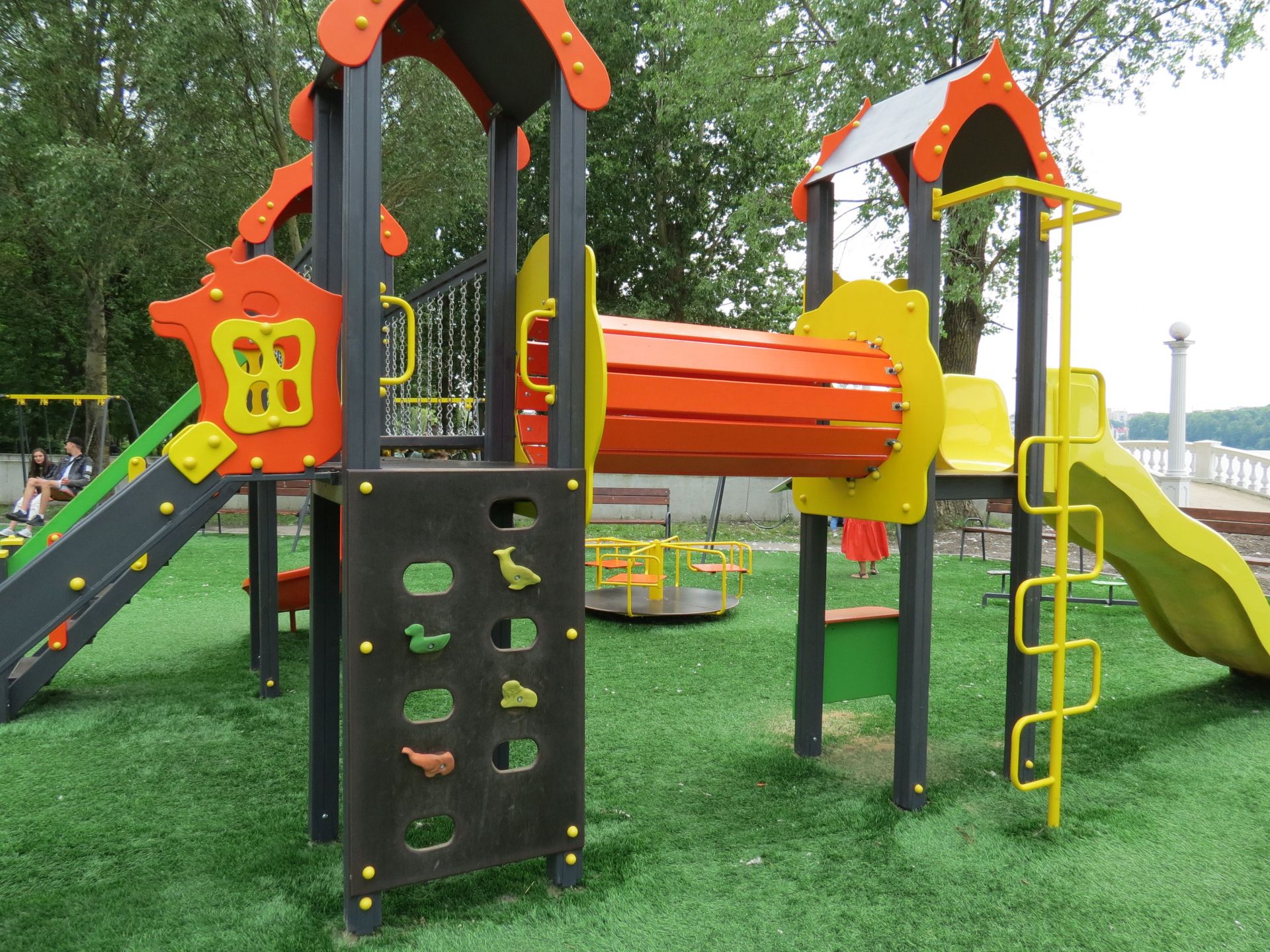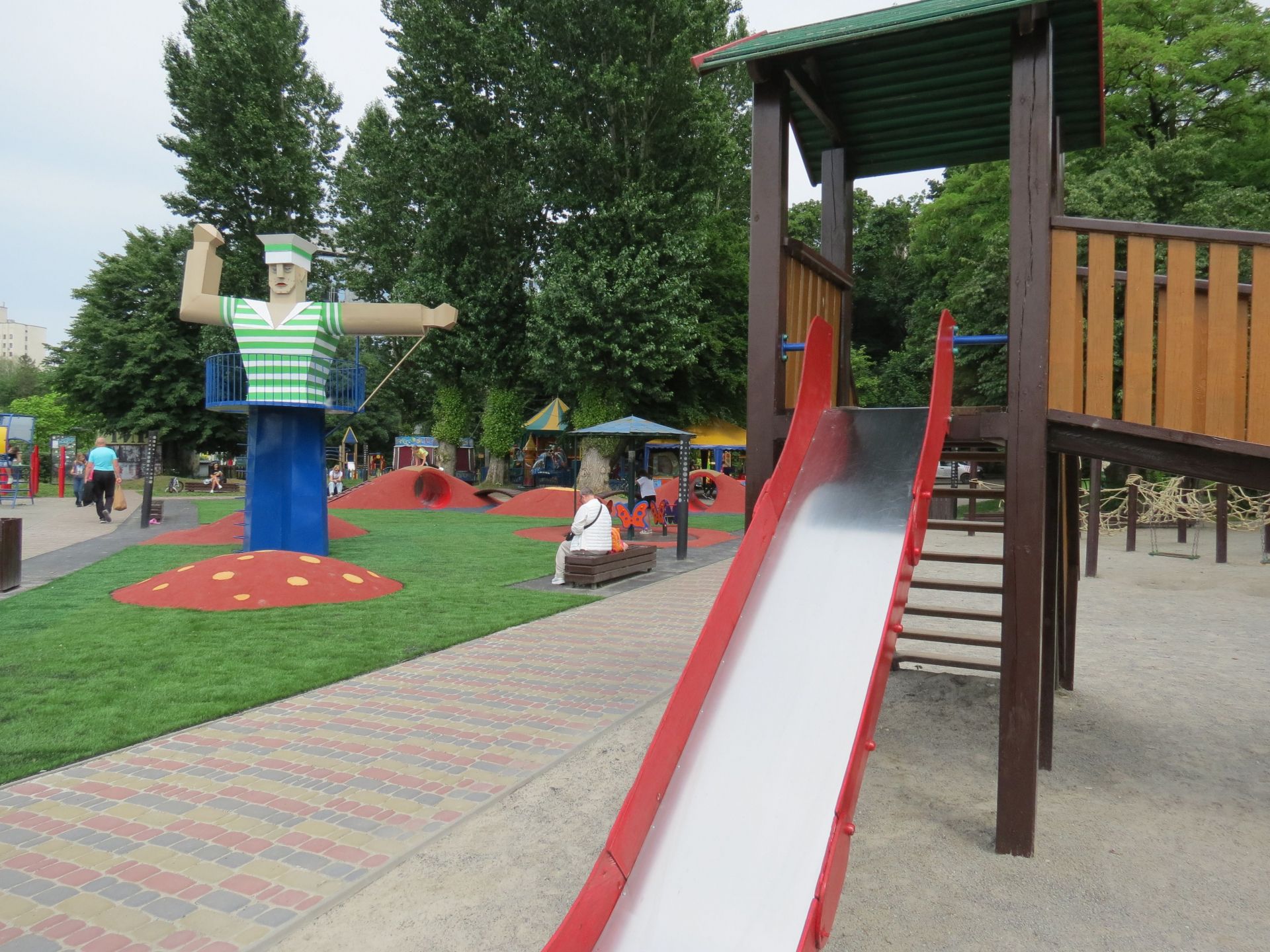 У цьому парку є кілька дитячих майданчиків. Майданчик біля «Дяді Стьопи» відремонтували. Там замінили частину покриття. Стару штучну траву замінили на нову зі спеціальним гумовим прошарком. Атракціони були у хорошому стані. На дитячій «лазанці» ми побачили нові канати. Гойдалки та каруселі були справні.