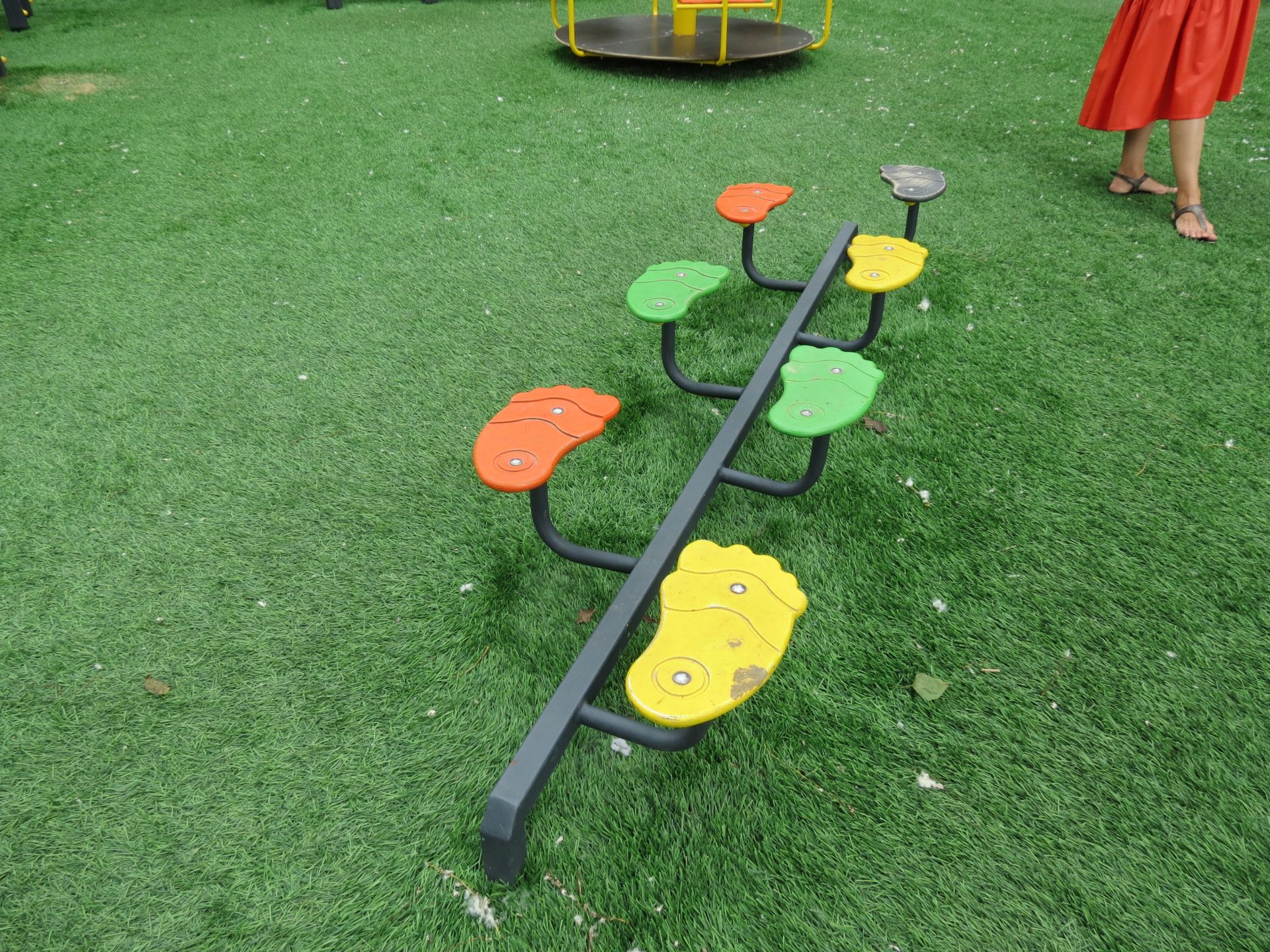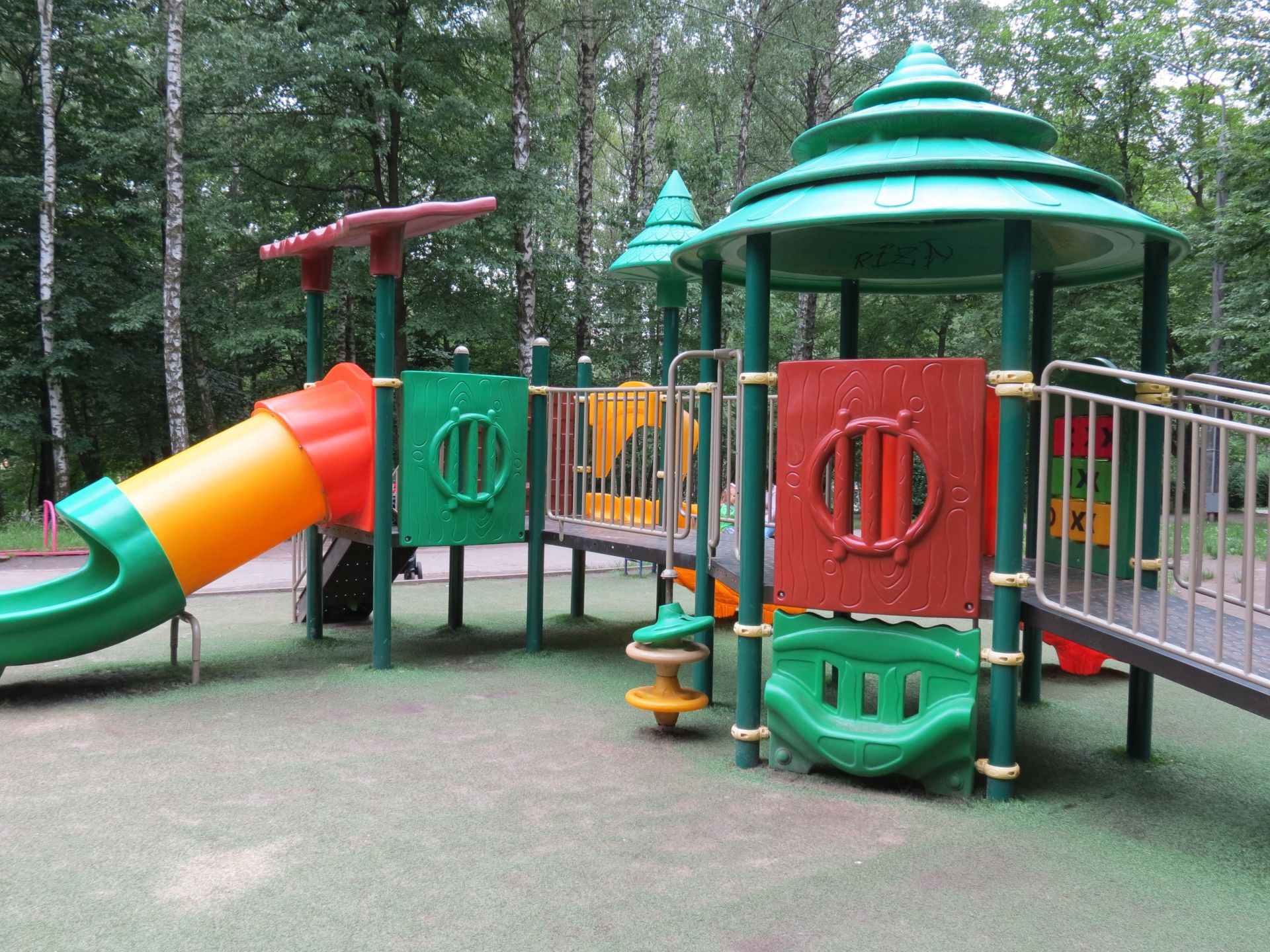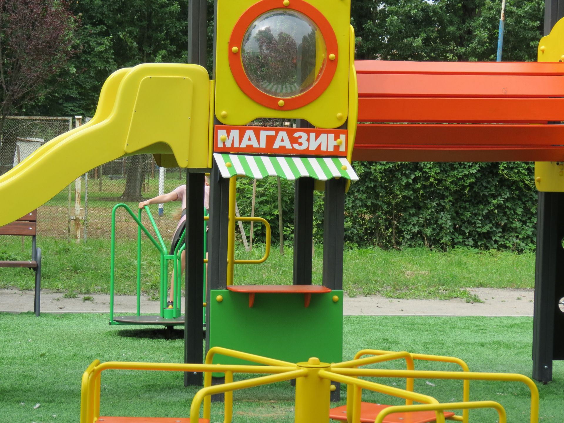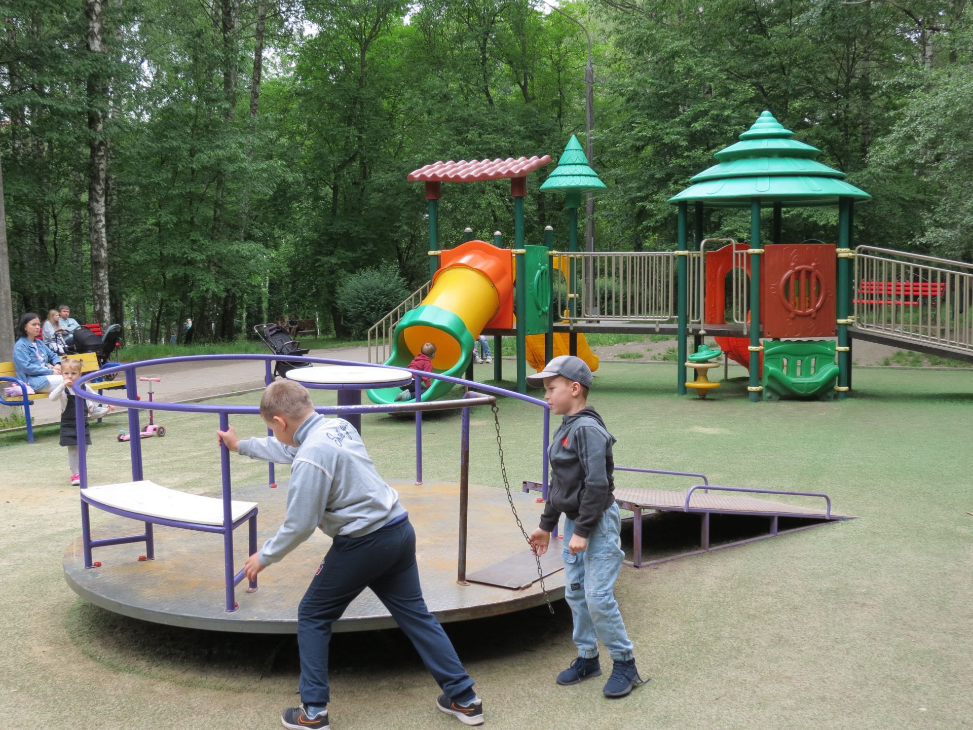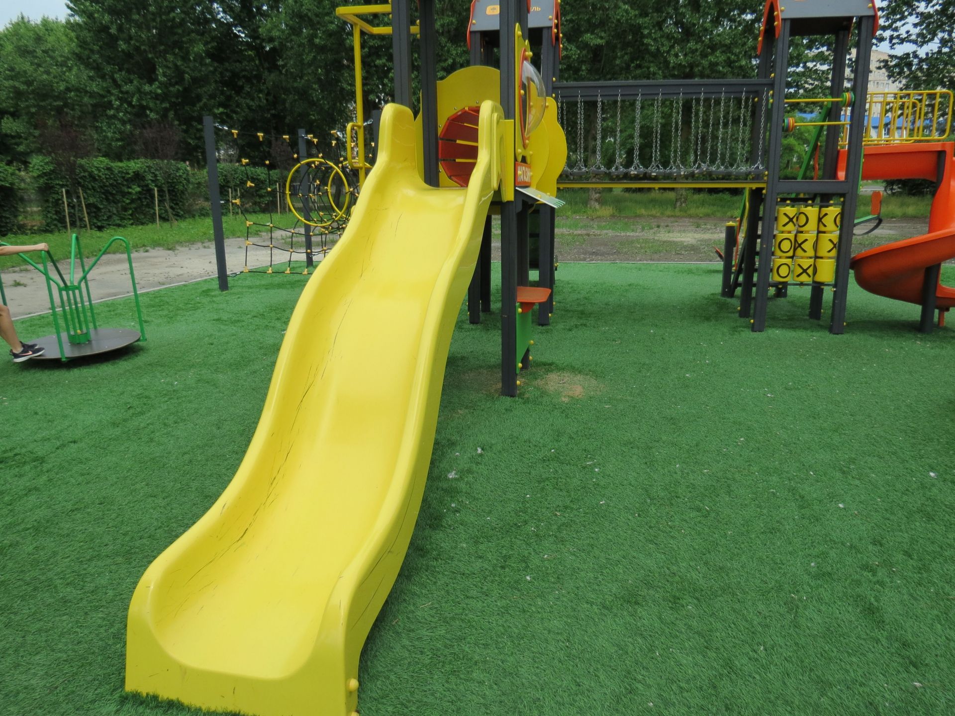 У цьому парку є кілька дитячих майданчиків. Майданчик біля «Дяді Стьопи» відремонтували. Там замінили частину покриття. Стару штучну траву замінили на нову зі спеціальним гумовим прошарком. Атракціони були у хорошому стані. На дитячій «лазанці» ми побачили нові канати. Гойдалки та каруселі були справні.