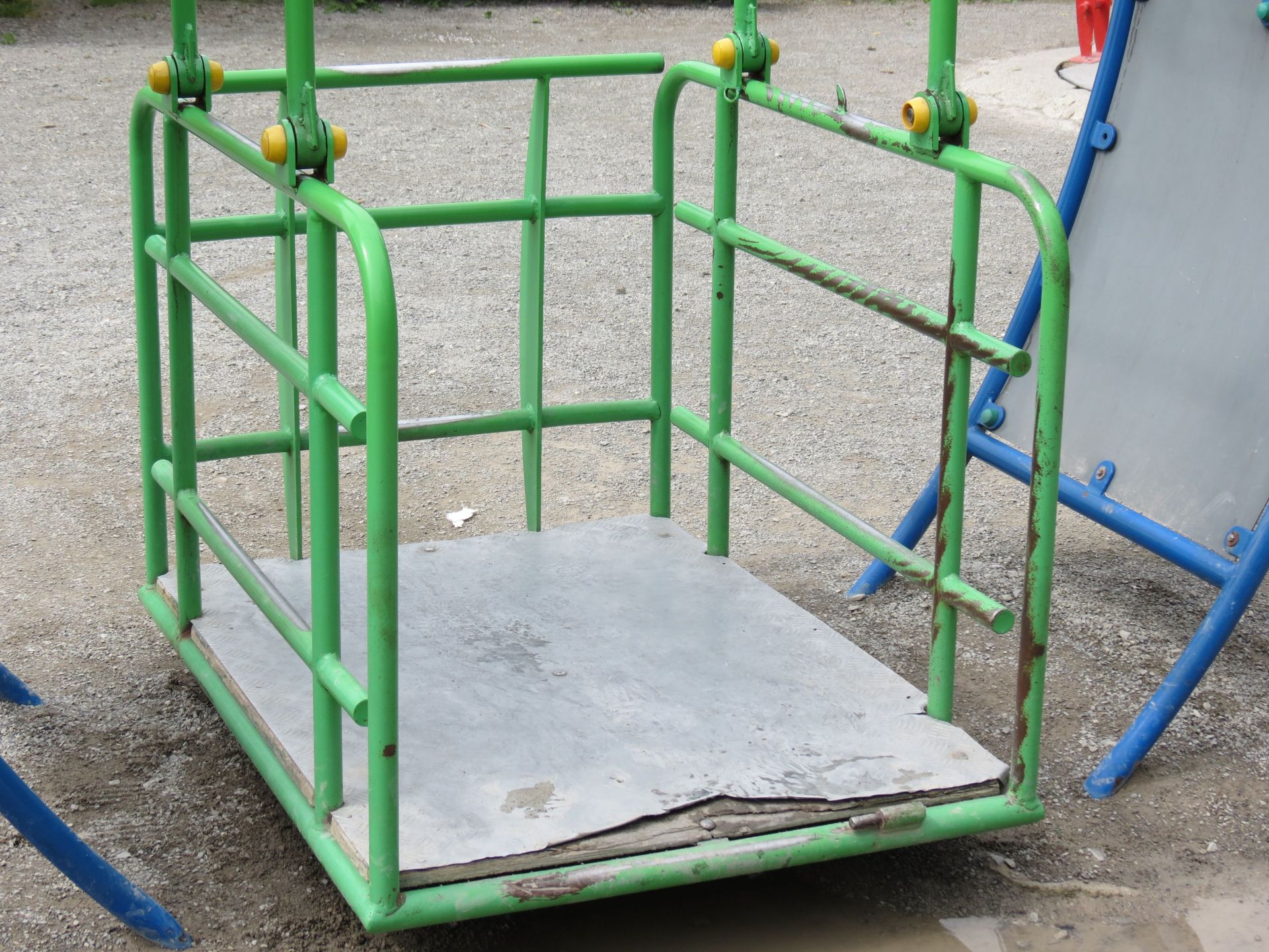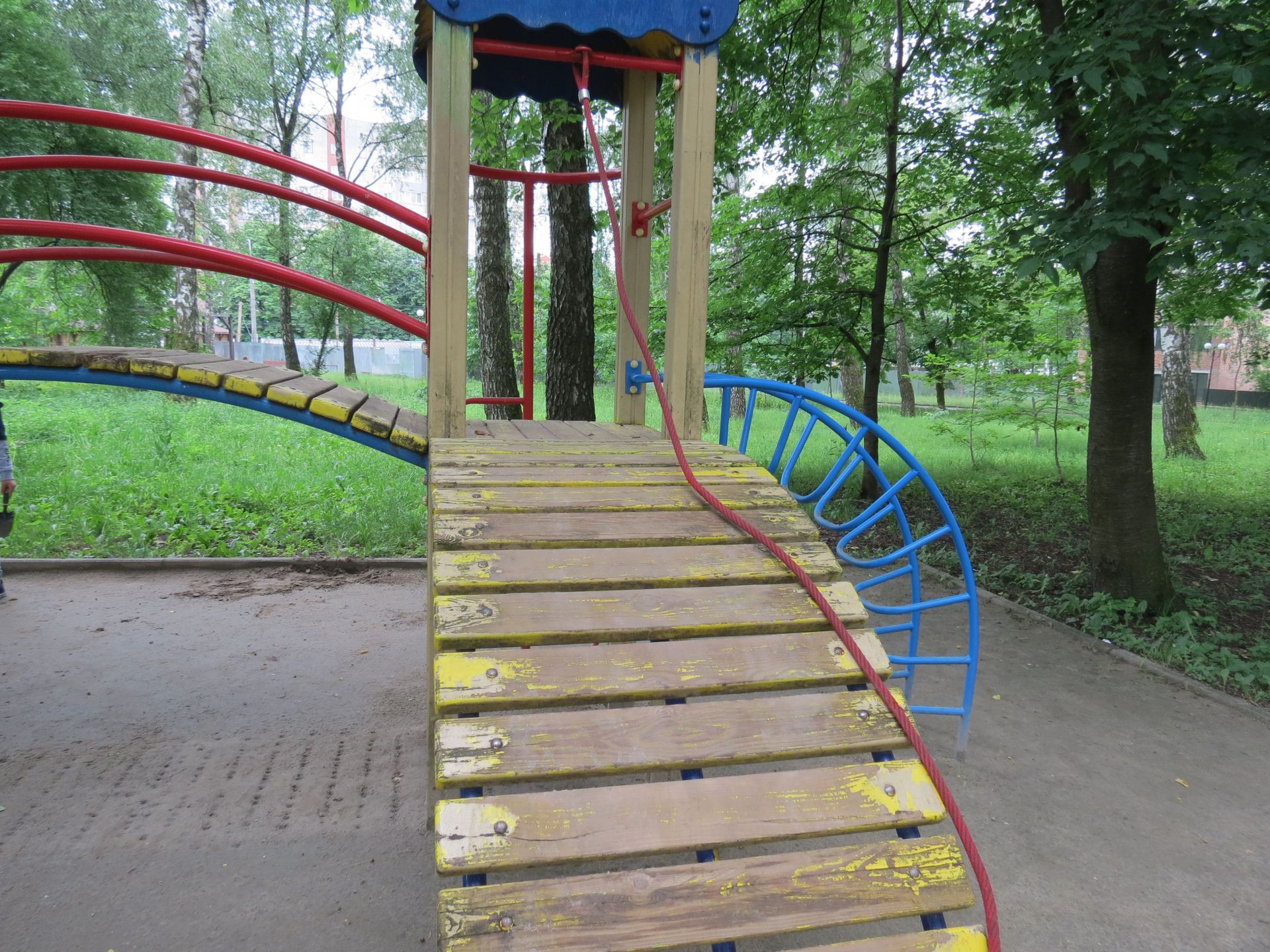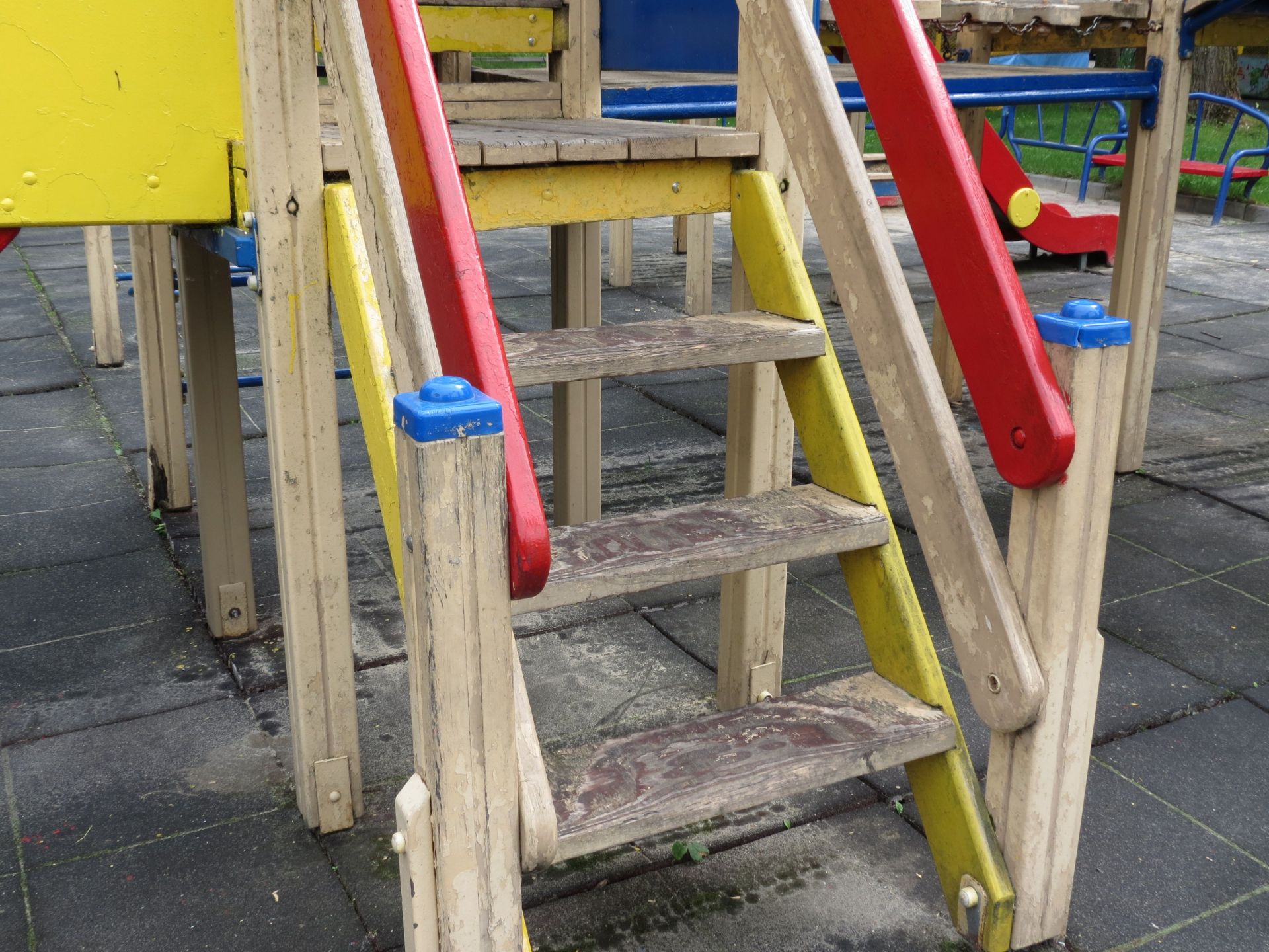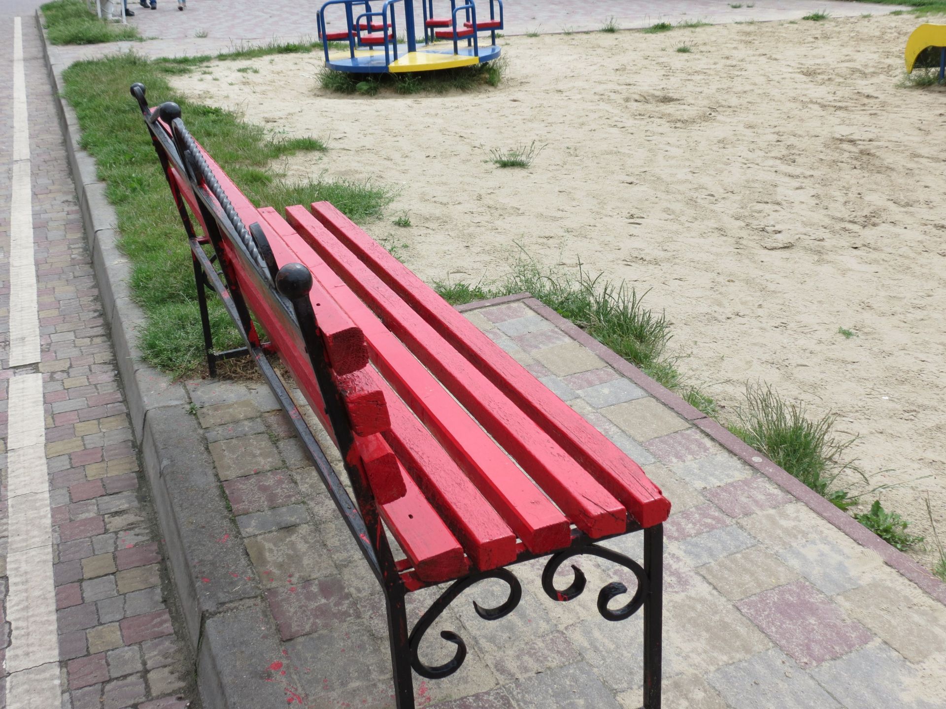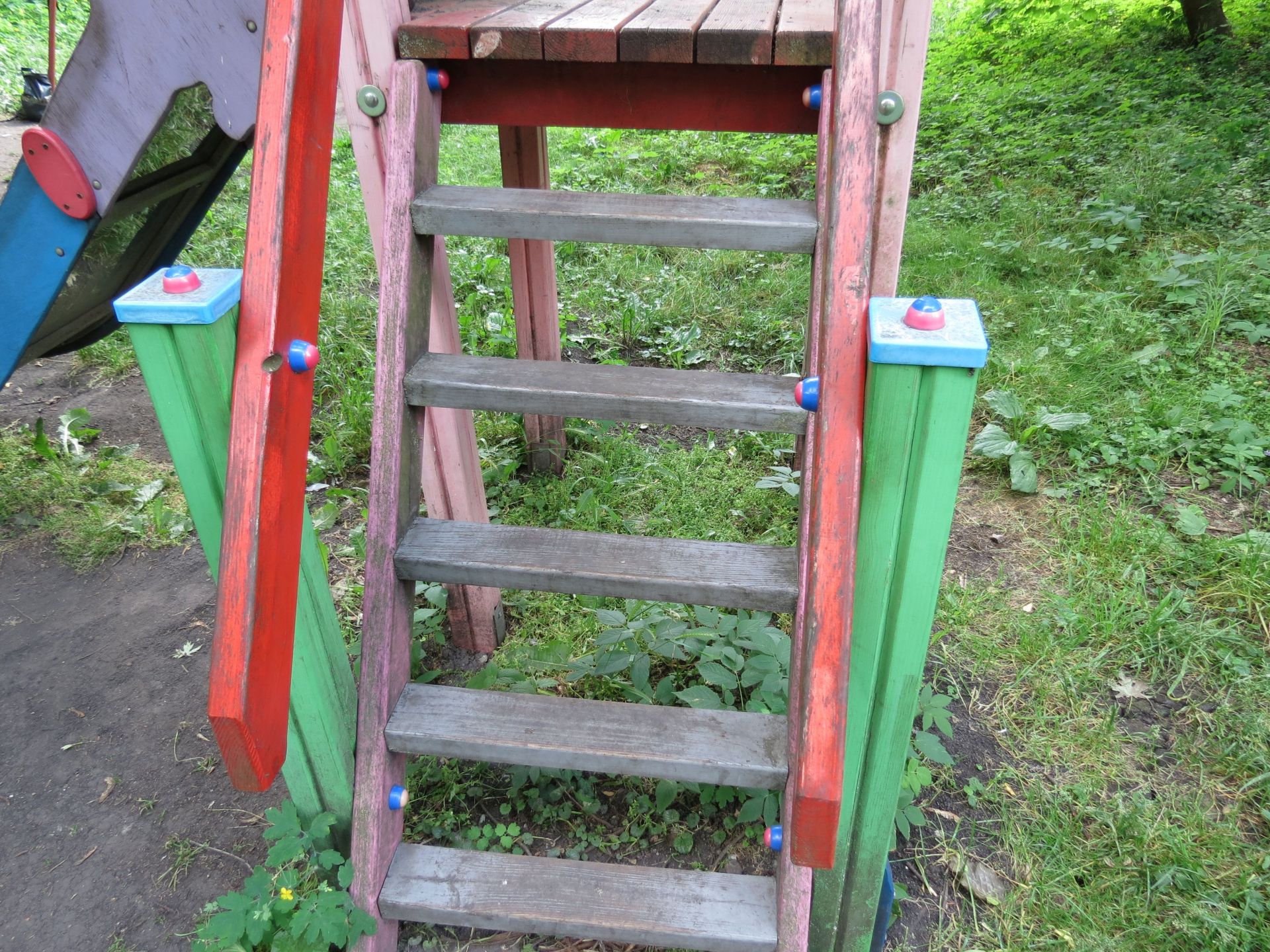 Фарба вже облупилась у багатьох місцях. Але всі елементи майданчика були справні. Спеціального покриття на майданчику немає.