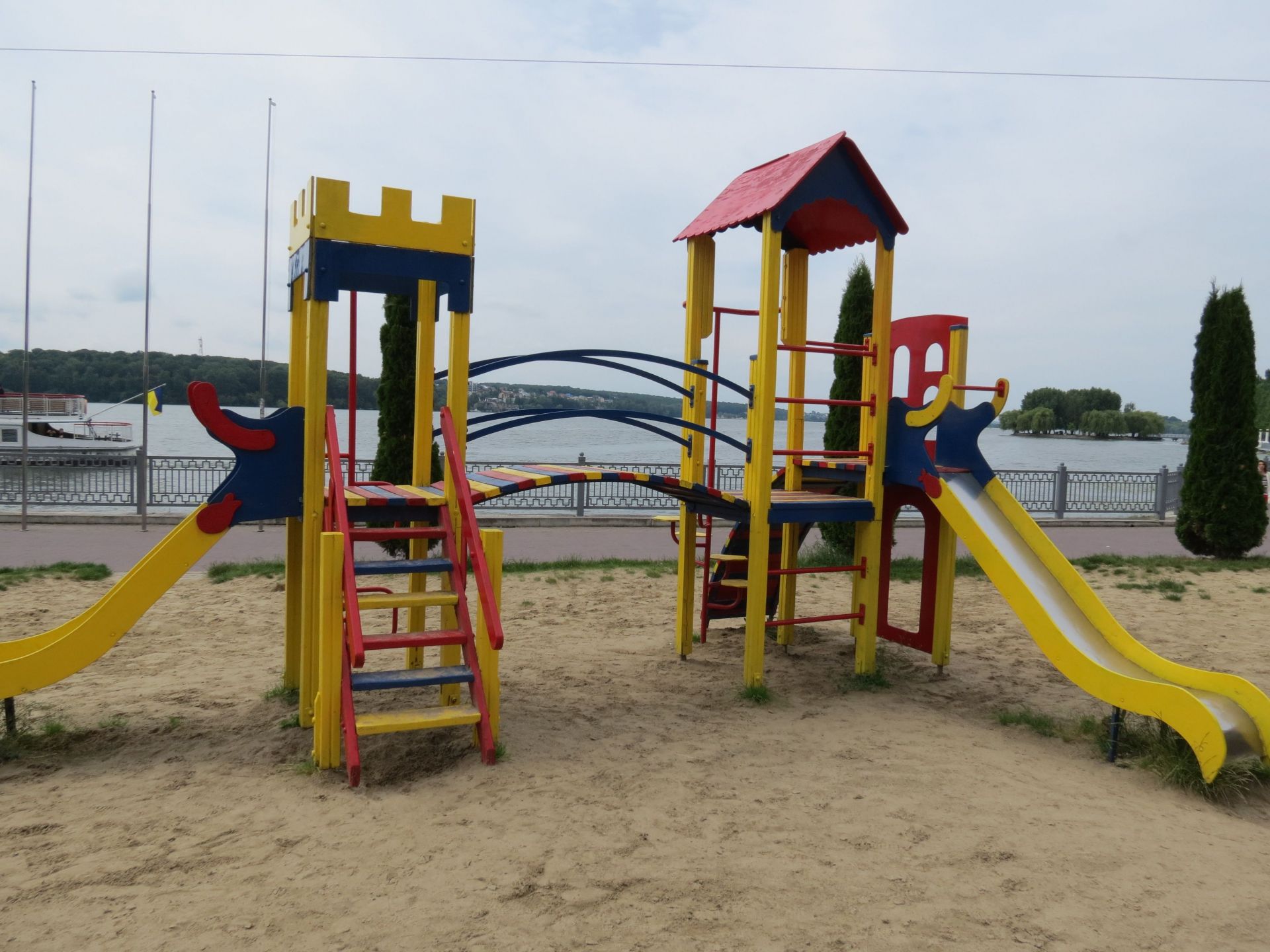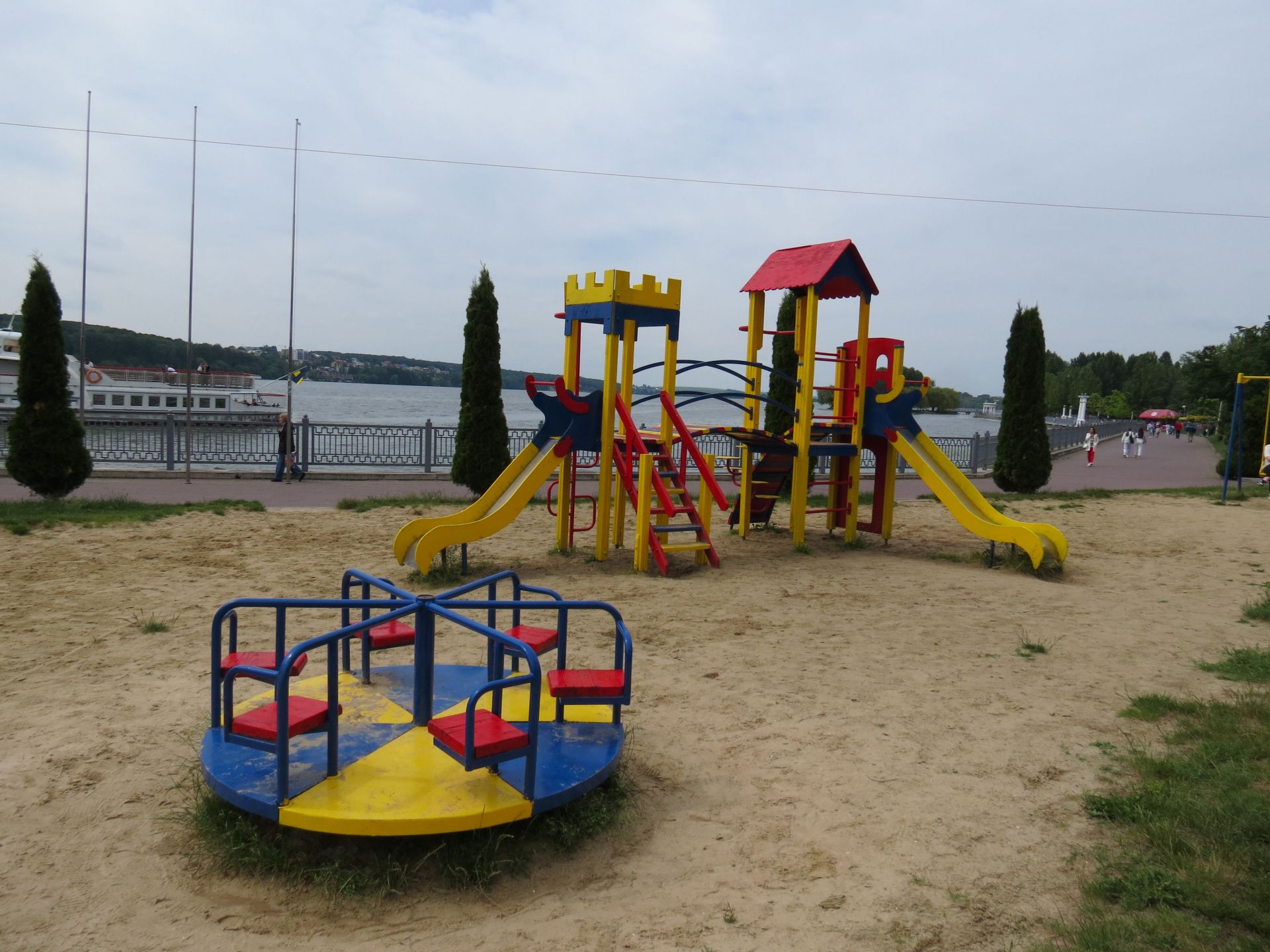Біля причалу є дитячий майданчик з ігровим комплексом, гойдалками. Дерев’яні елементи пофарбовані. Ми не побачили зламаних конструкцій. Поверхня майданчика покрита шаром піску, але він заростає травою. Поруч є лавки. Однак майданчик знаходиться на сонці і затінку фактично немає, тож у спекотні дні там рідко граються діти з батьками.