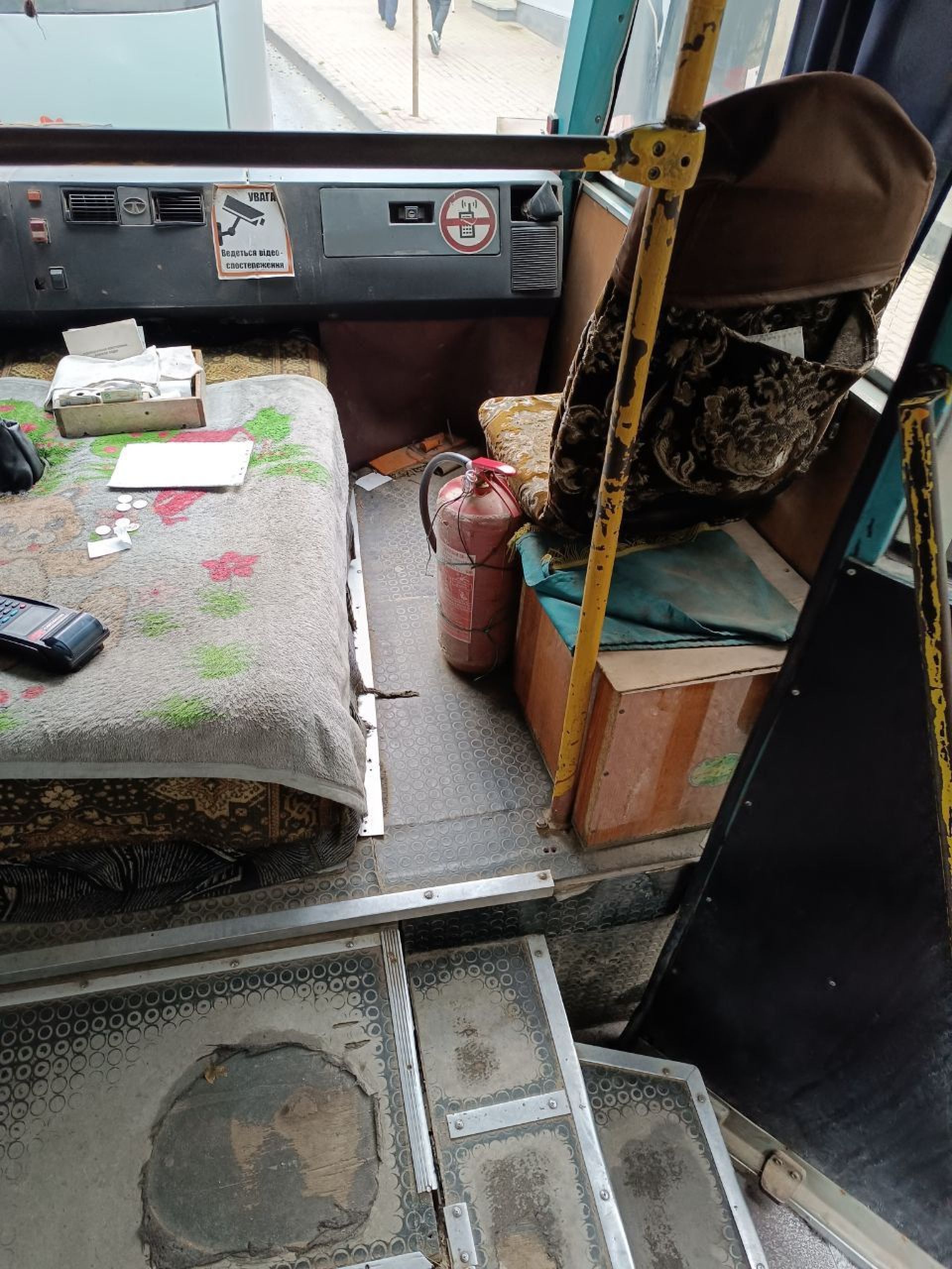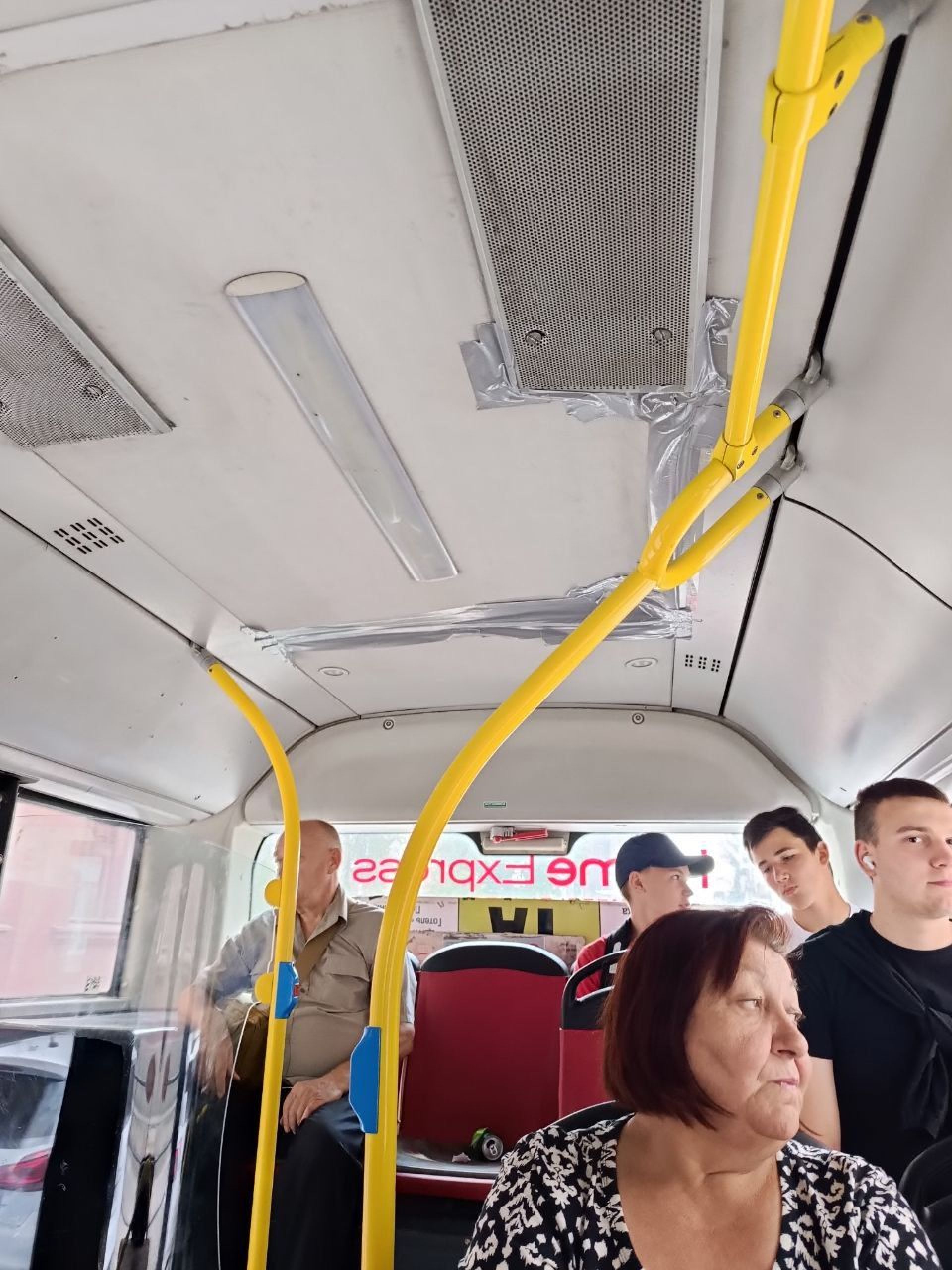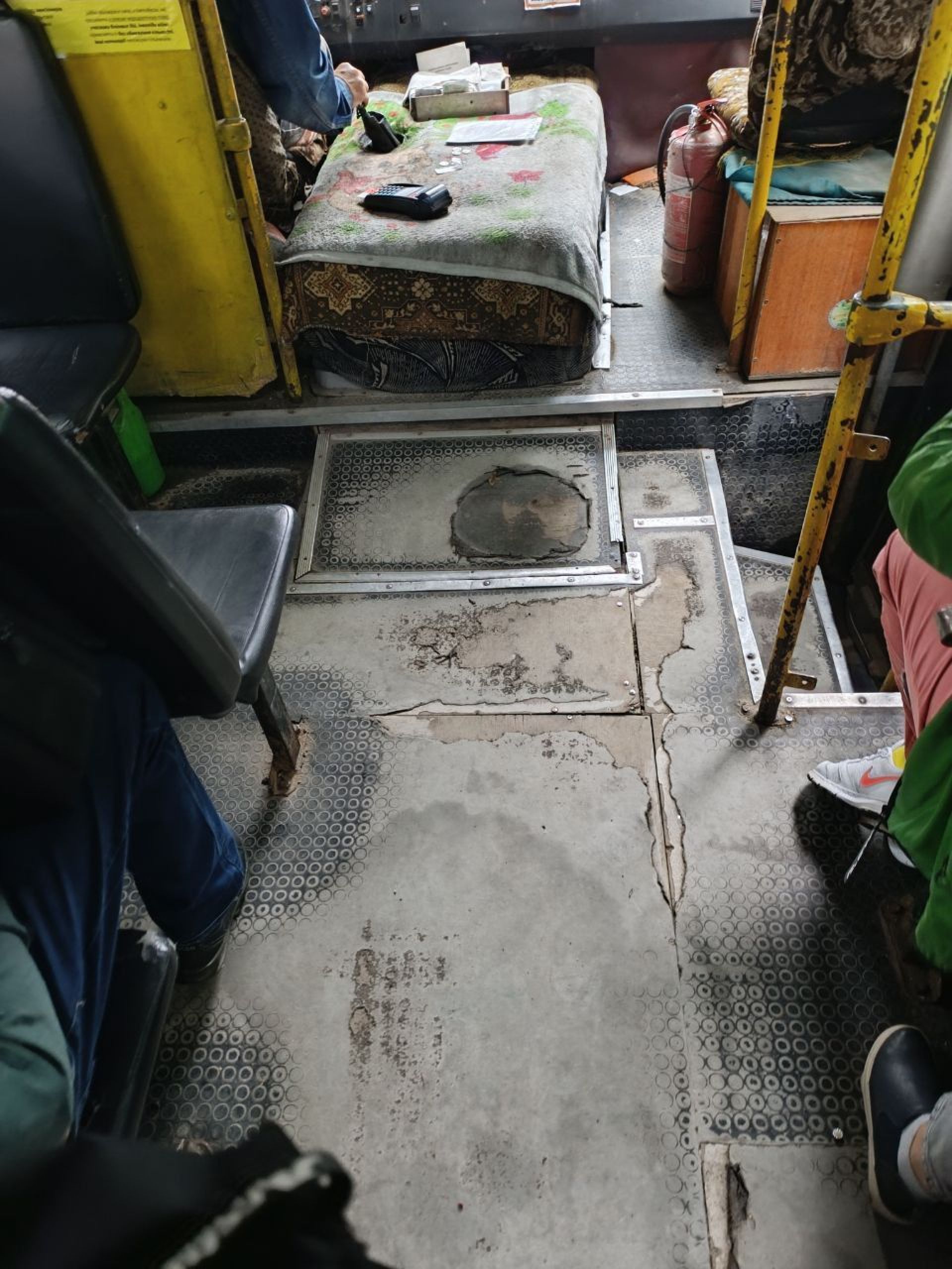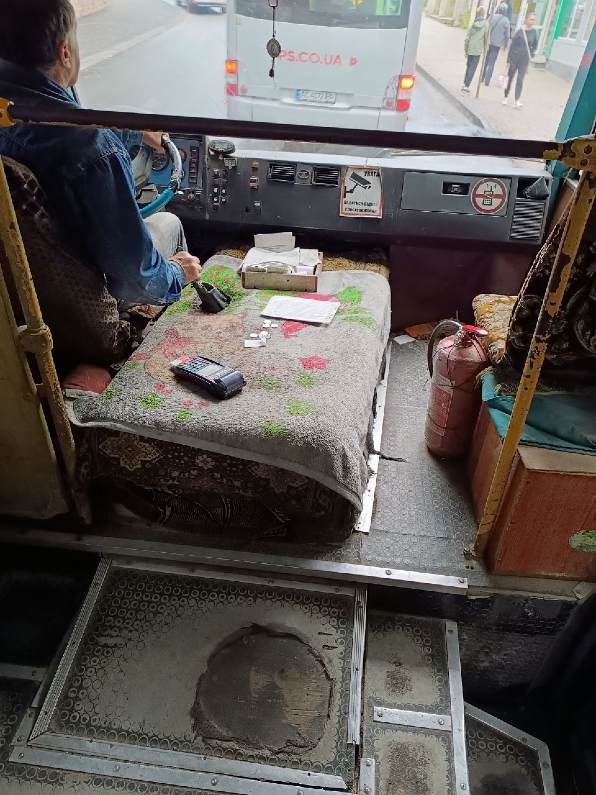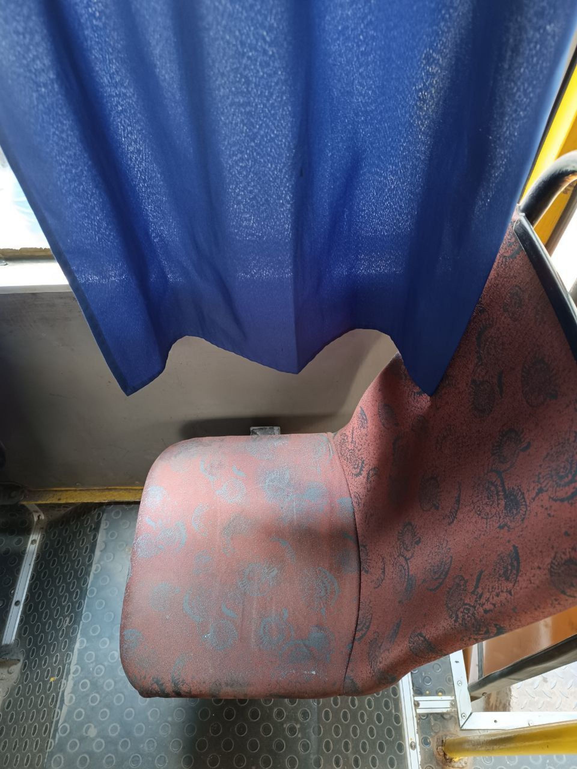 Салон був брудний. Стіни в незрозумілих слідах бризків, потьоках та старому бруду. Деякі ремені для тримання були зламані. Під час поїздки у автобусі гуркотять панелі. Вони погано закріплені та складається враження, що вони можуть відвалитися та впасти на голову пасажирам.