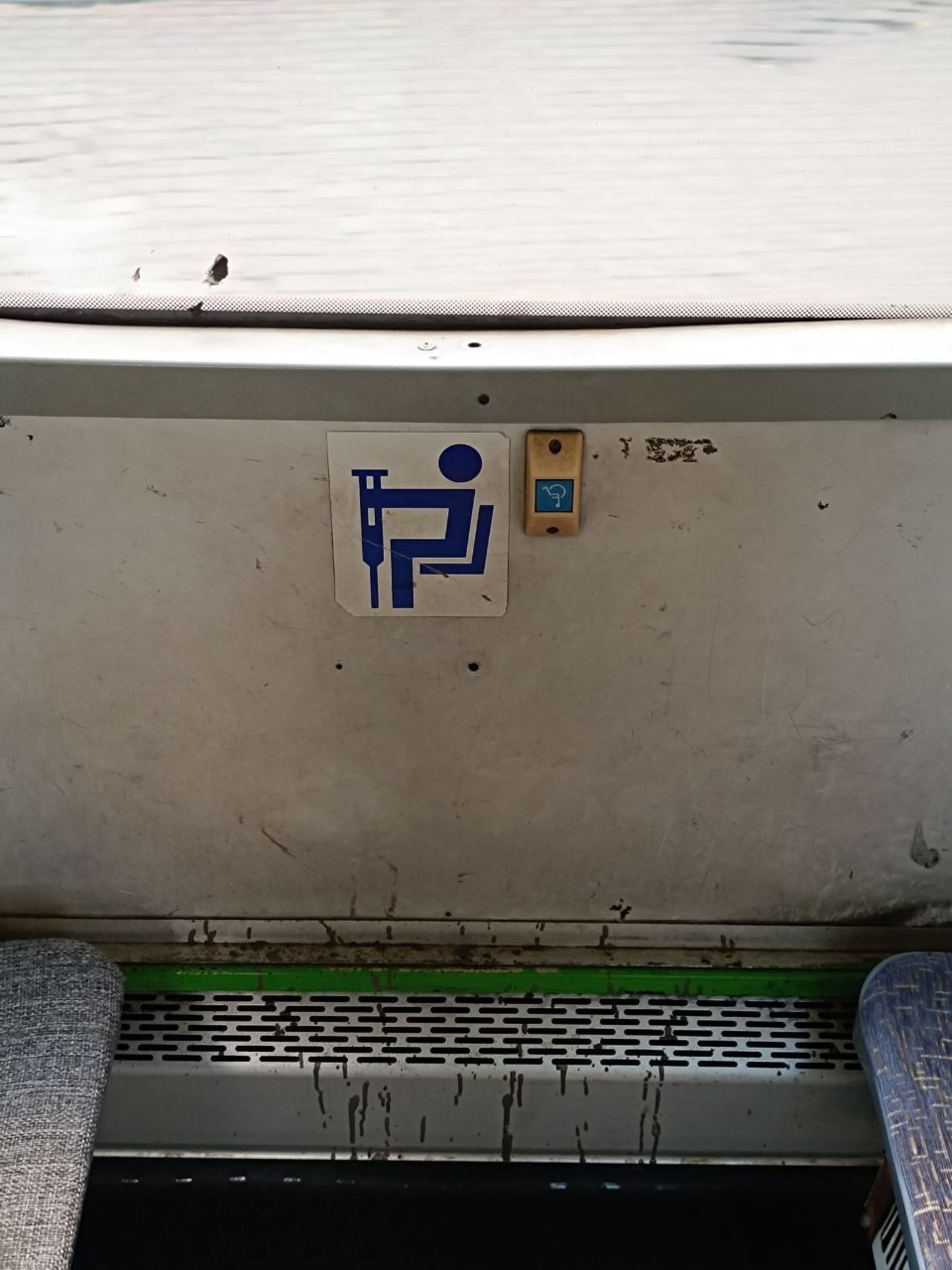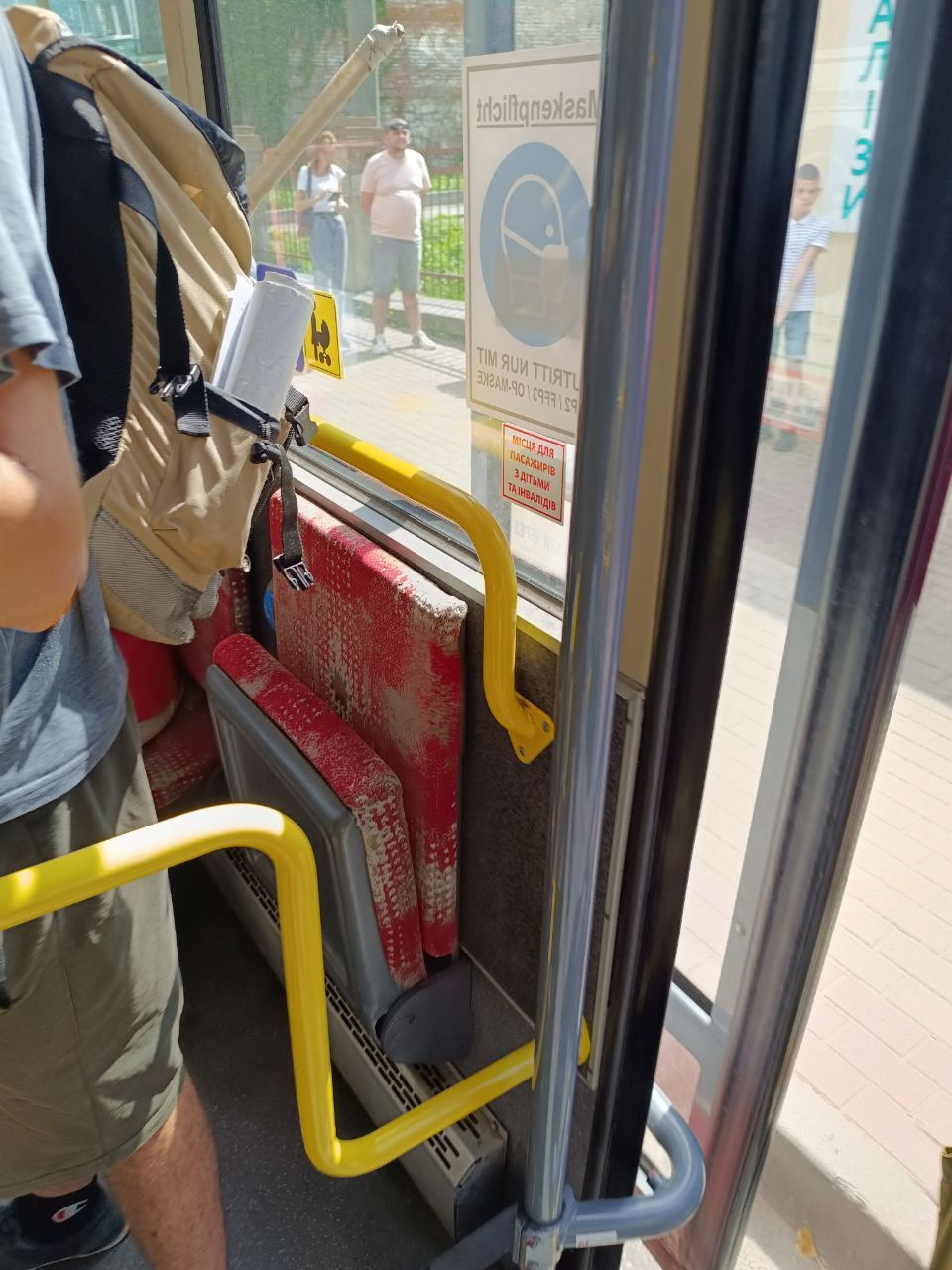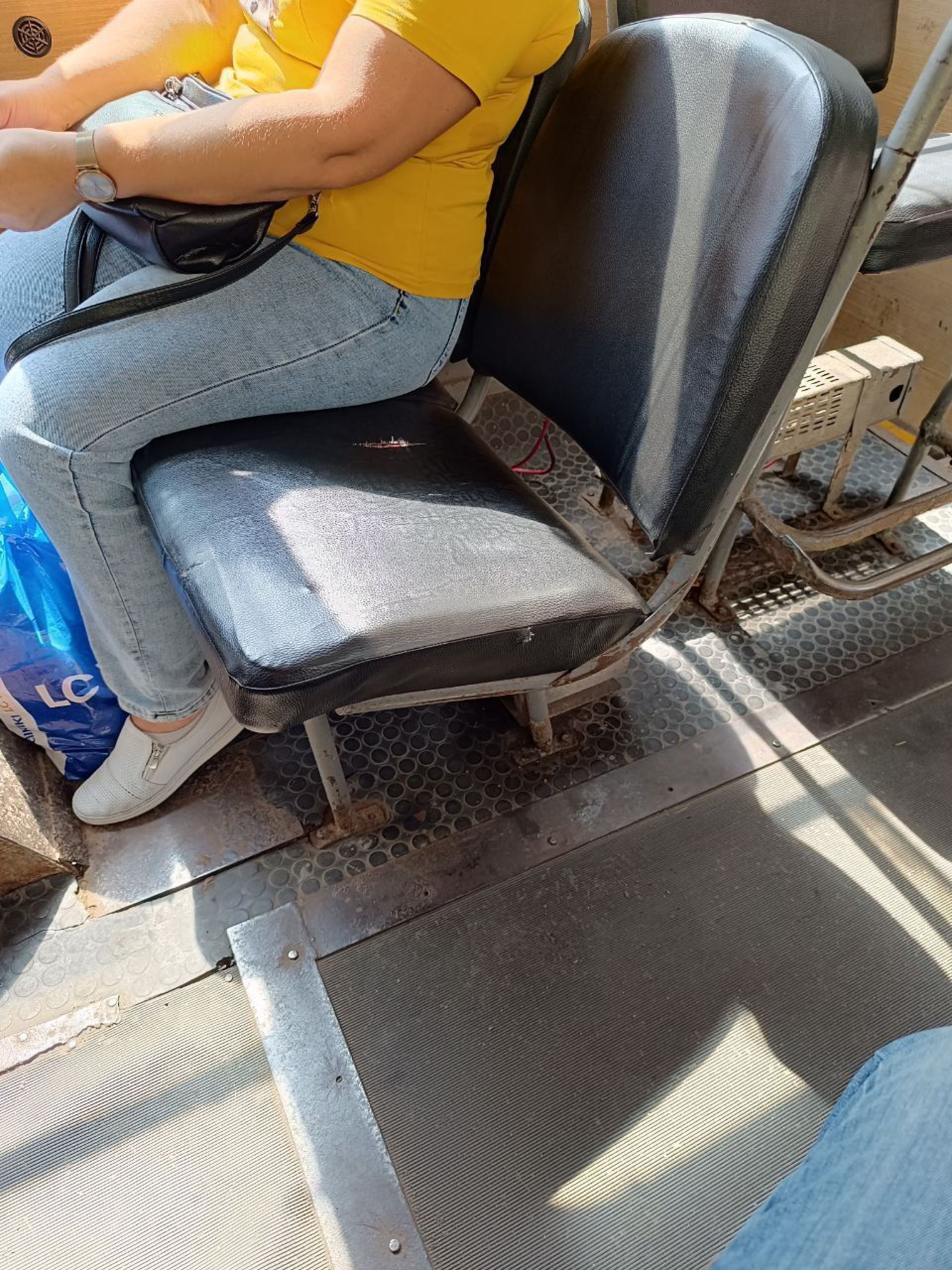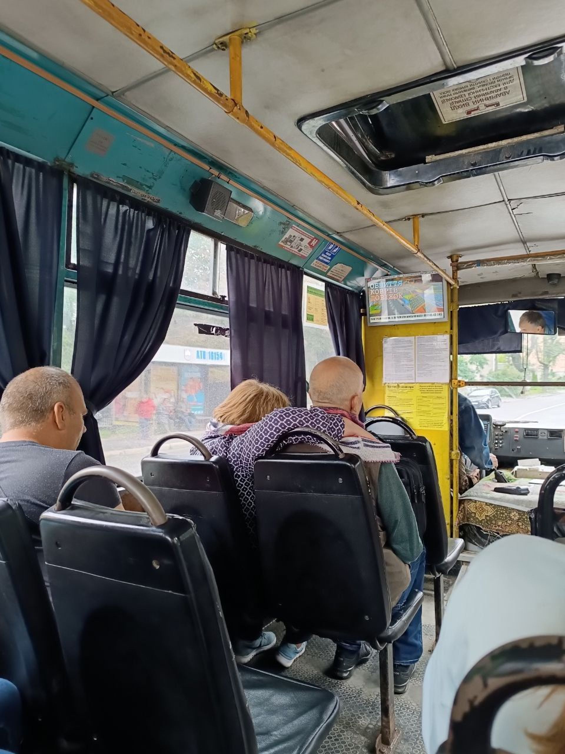 Салон був брудний. Стіни в незрозумілих слідах бризків, потьоках та старому бруду. Деякі ремені для тримання були зламані. Під час поїздки у автобусі гуркотять панелі. Вони погано закріплені та складається враження, що вони можуть відвалитися та впасти на голову пасажирам.