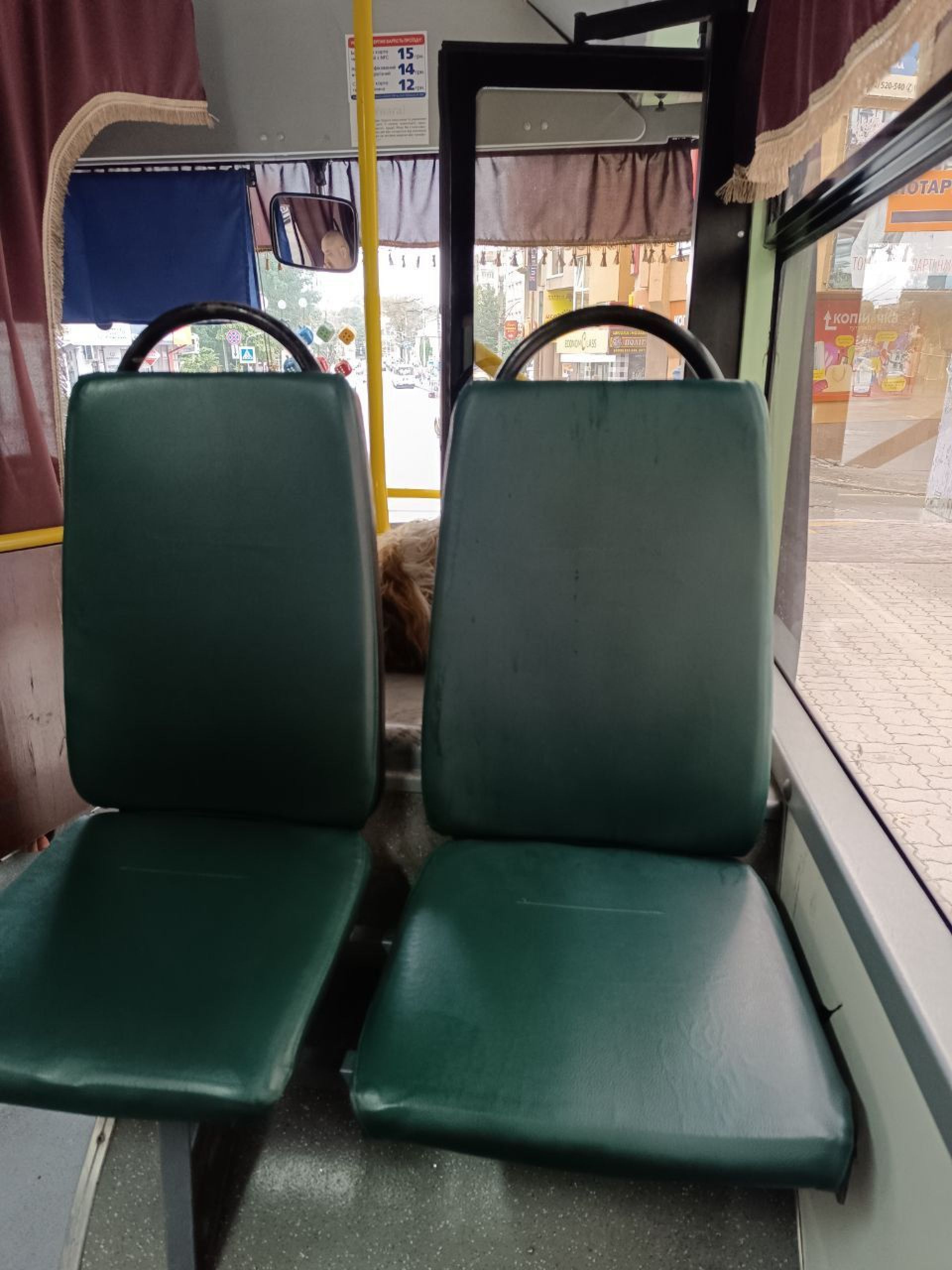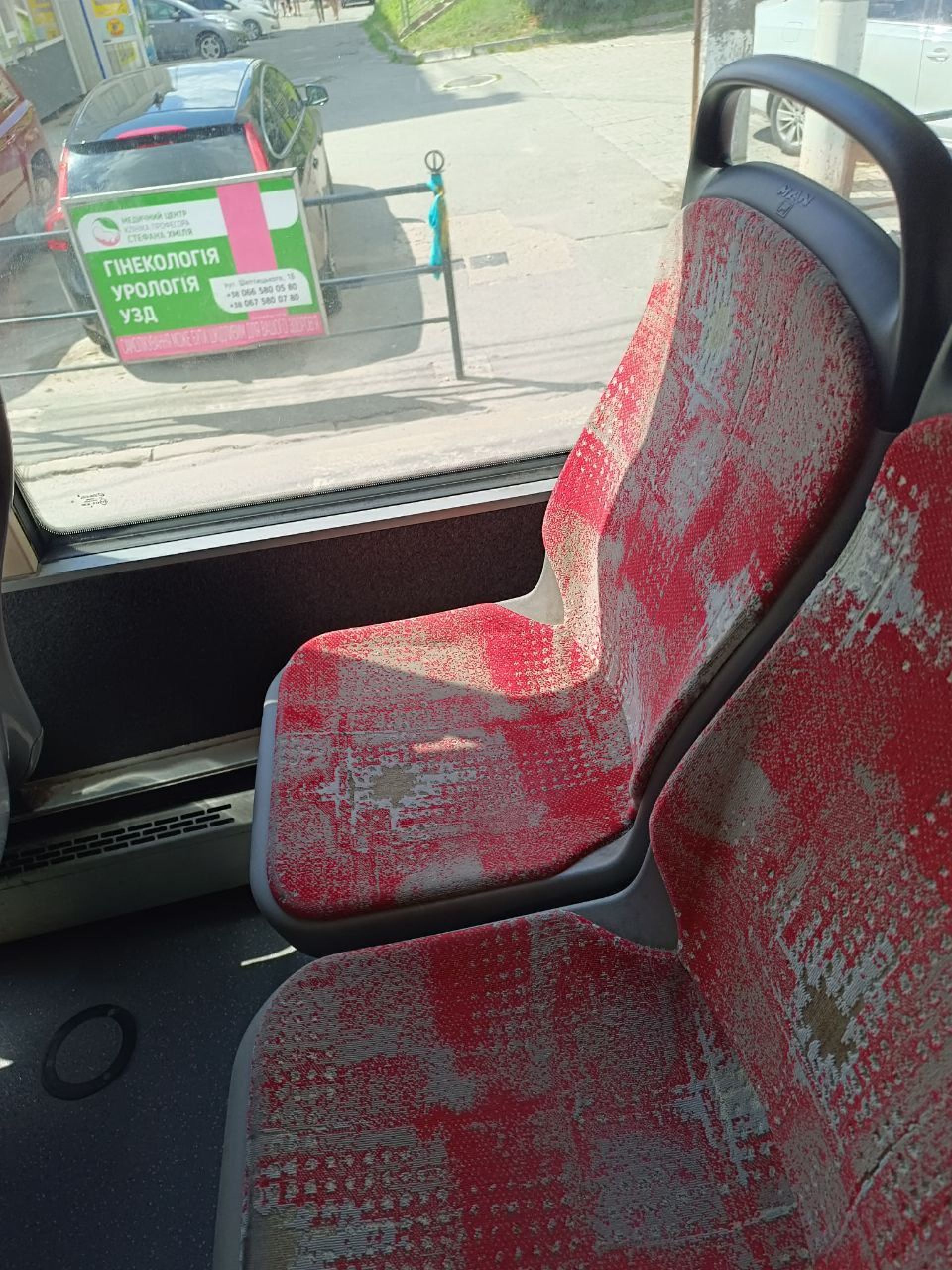 Це білі низькопідлогові автобуси МАЗ. В автобусі є два валідатори – у водія та стаціонарний на центральному вході. В салоні було відносно чисто. На підлозі лише кілька папірців та квитків. Сидіння мають товсту, м’яку оббивку. На такій тканині збирається багато пилу та волосся, яке можна побачити чи не на кожному місці.