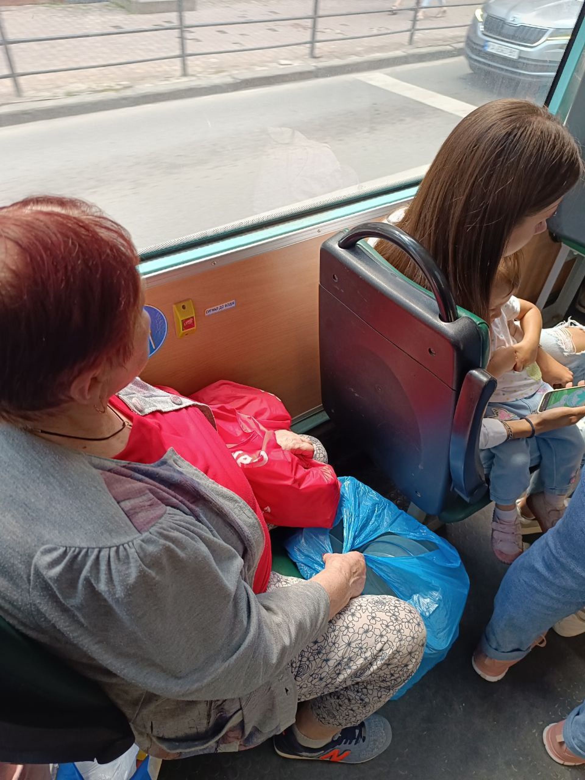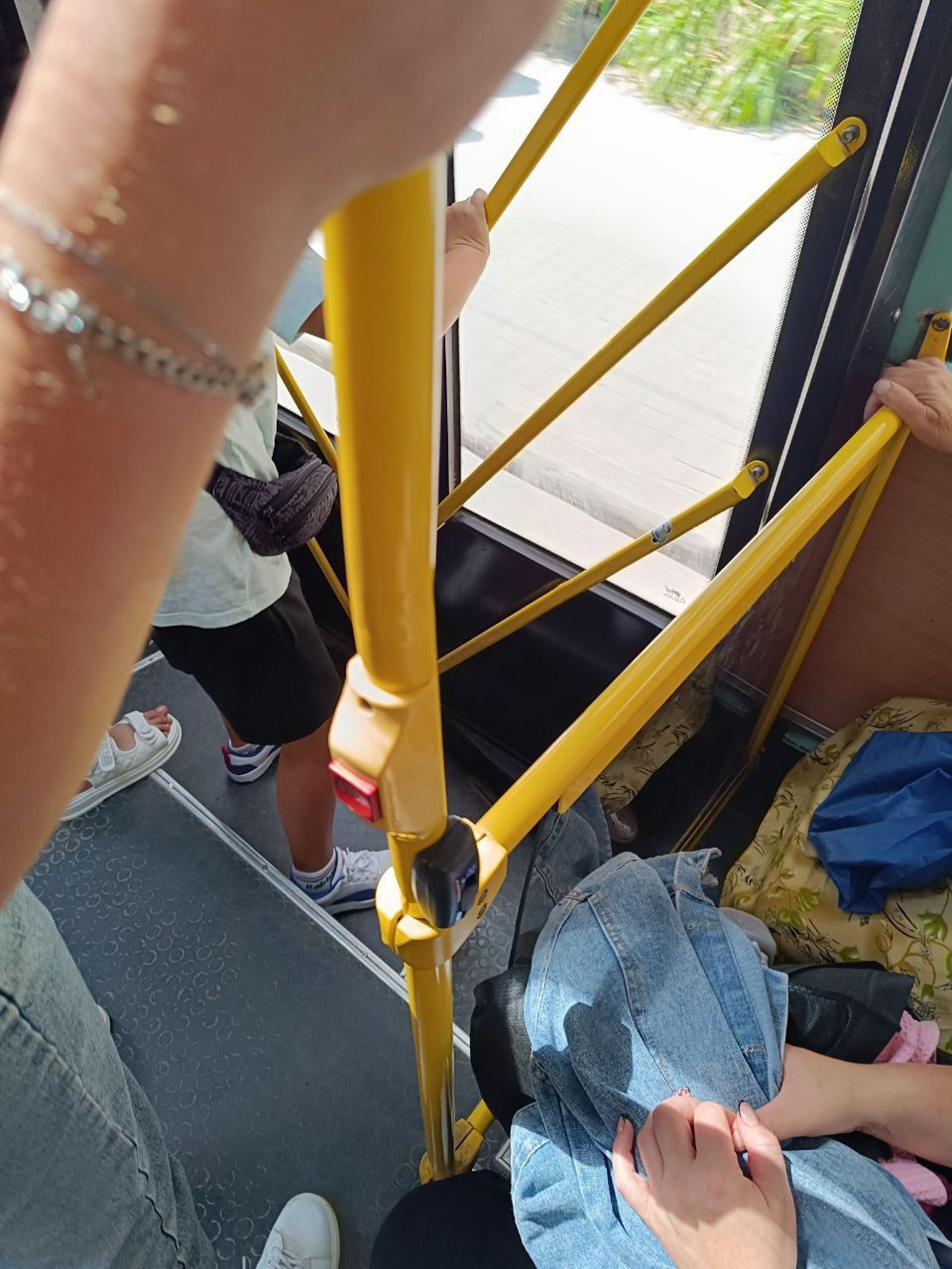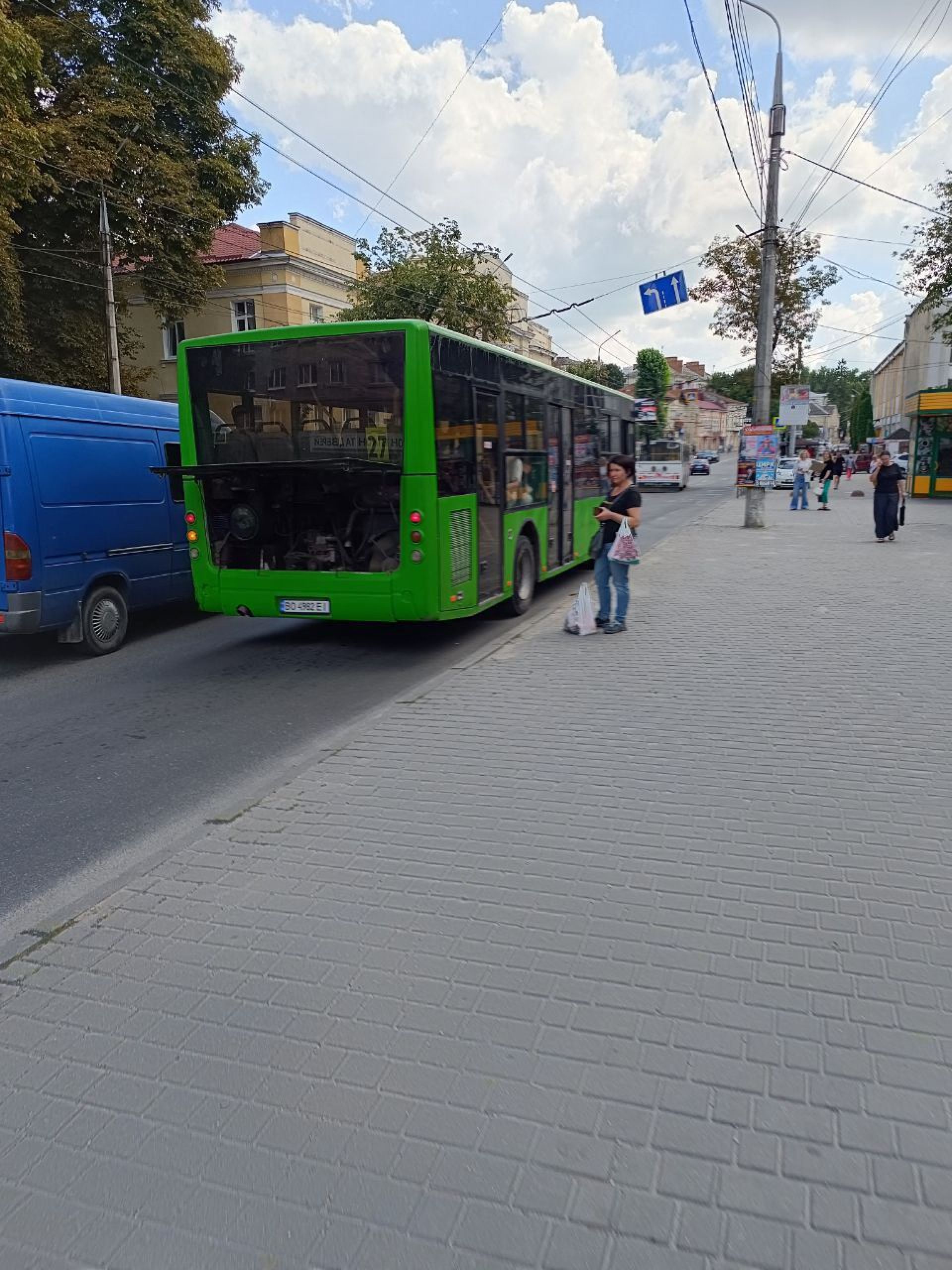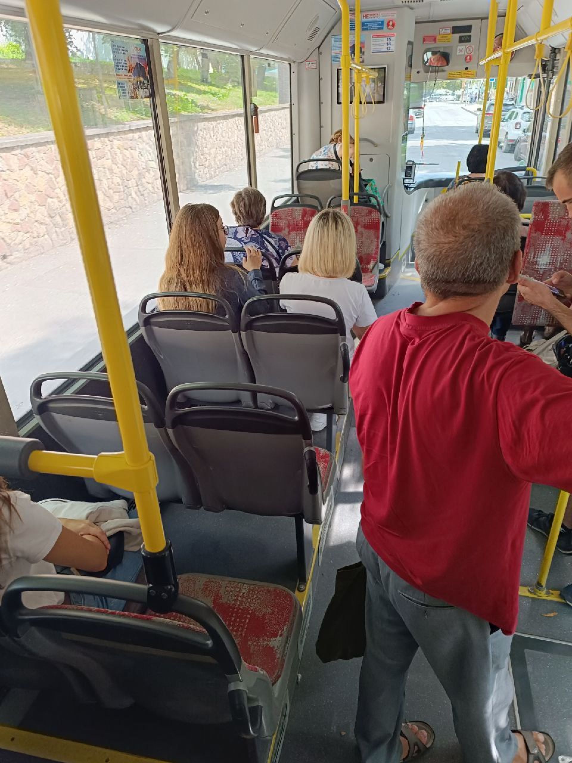 Цей великий зелений автобус приїхав на зупинку з відкритим моторним відсіком. Імовірно, у спеку мотор перегрівається і тому довелося відкрити його для охолодження. Всередині багато місця. Там можна поставити не один дитячий візок. Однак сидячих місць не так багато. Є кілька місць для пенсіонерів. Вони нижчі, ніж звичайні сидіння в салоні.