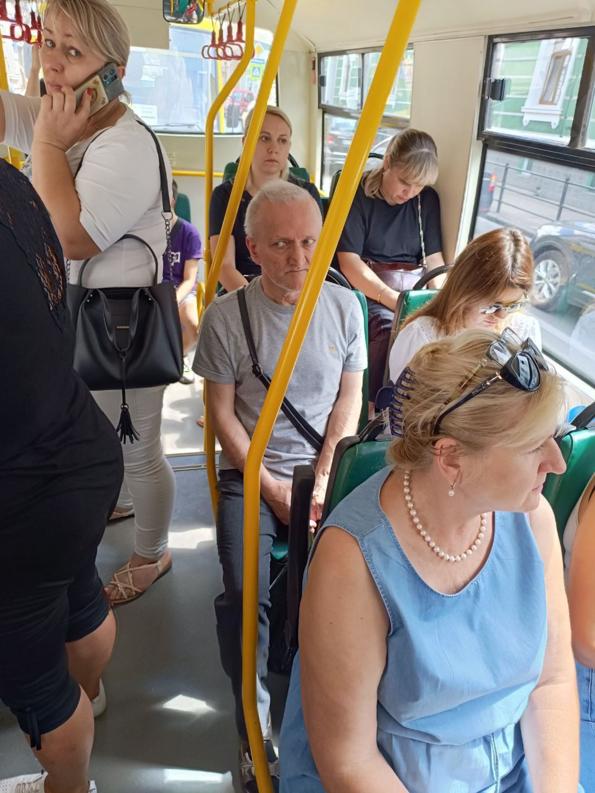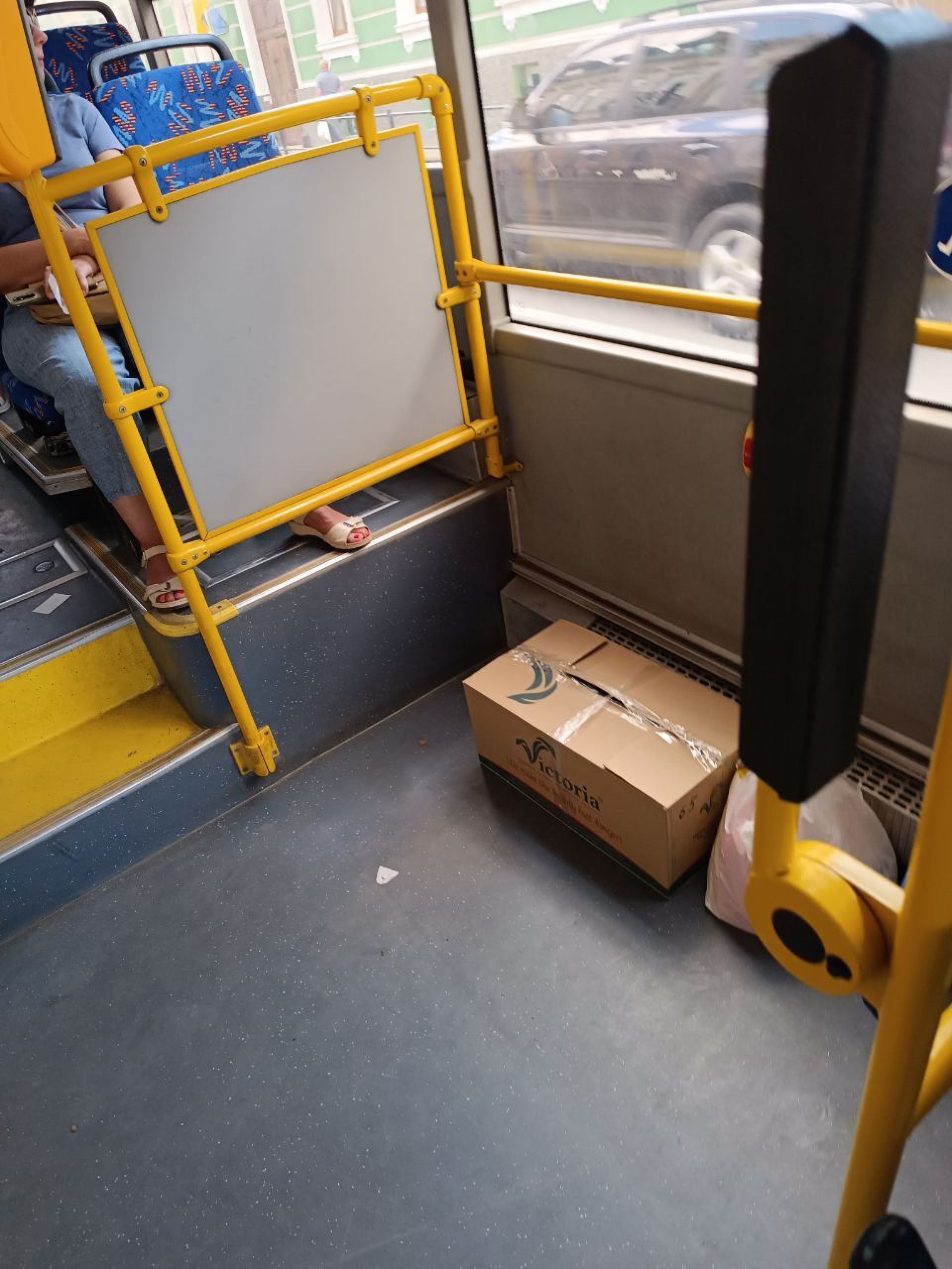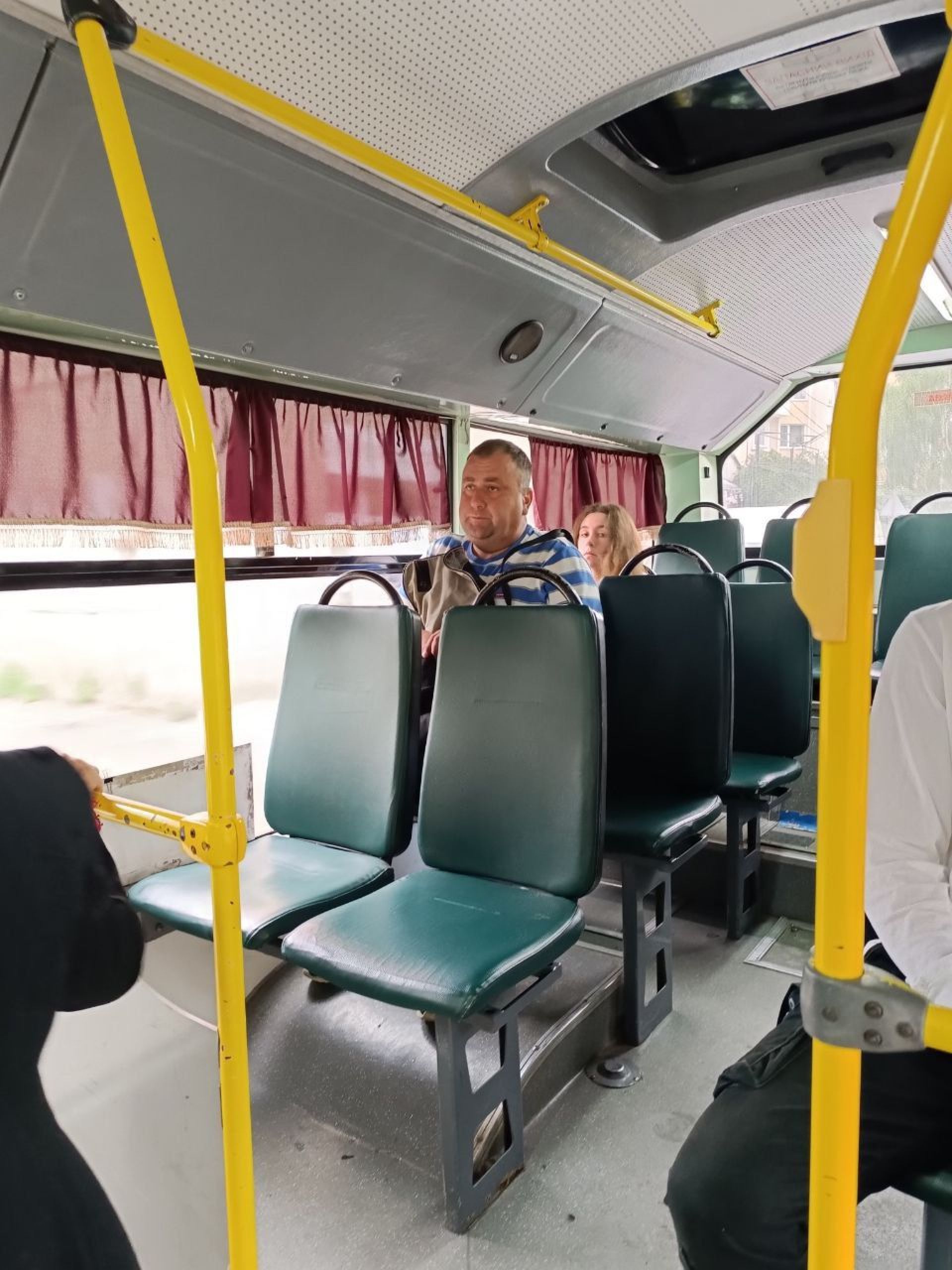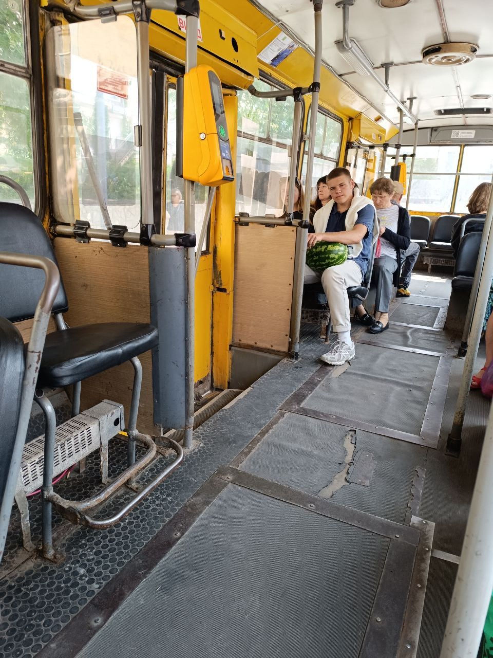 Цей великий зелений автобус приїхав на зупинку з відкритим моторним відсіком. Імовірно, у спеку мотор перегрівається і тому довелося відкрити його для охолодження. Всередині багато місця. Там можна поставити не один дитячий візок. Однак сидячих місць не так багато. Є кілька місць для пенсіонерів. Вони нижчі, ніж звичайні сидіння в салоні.