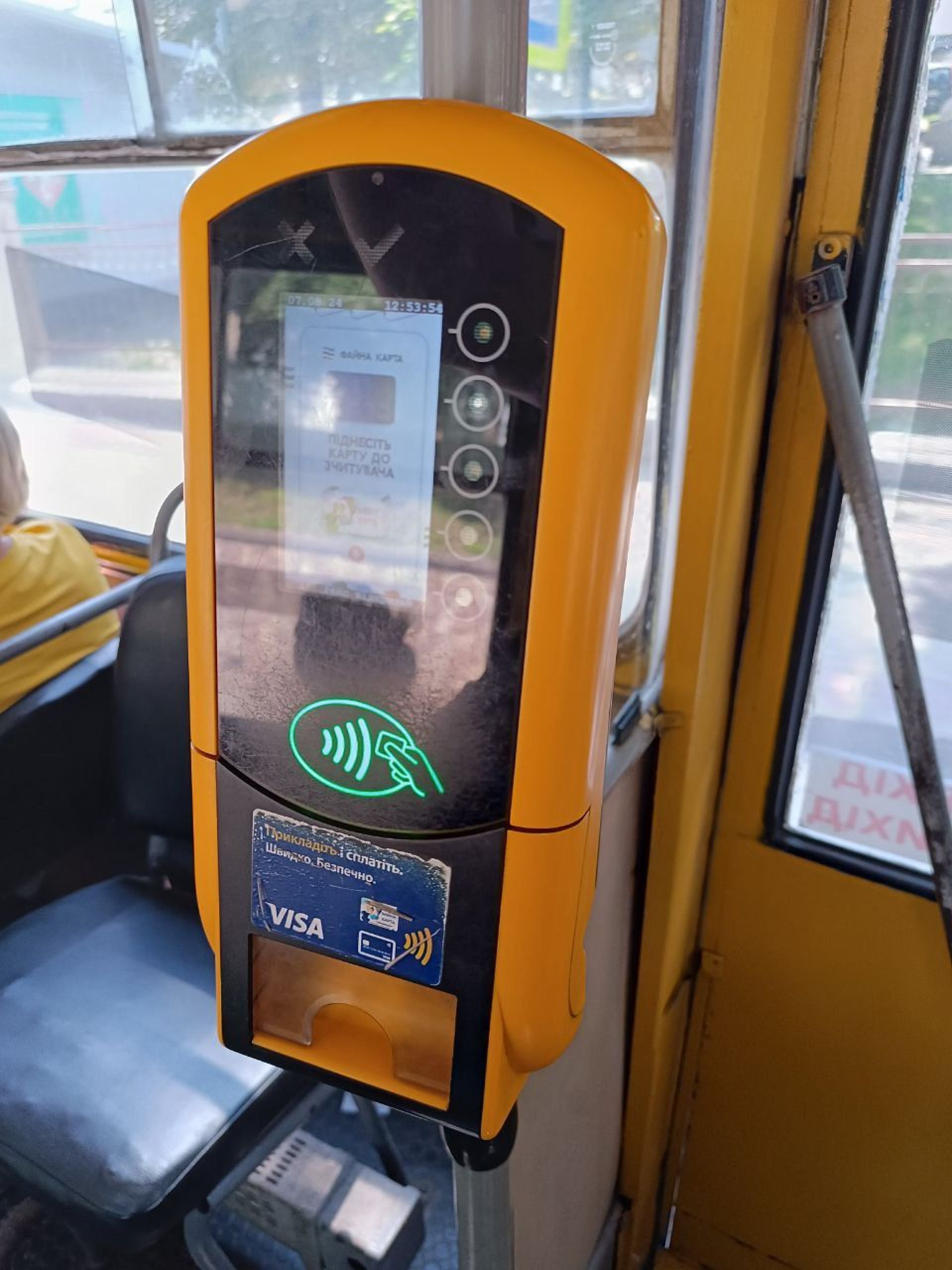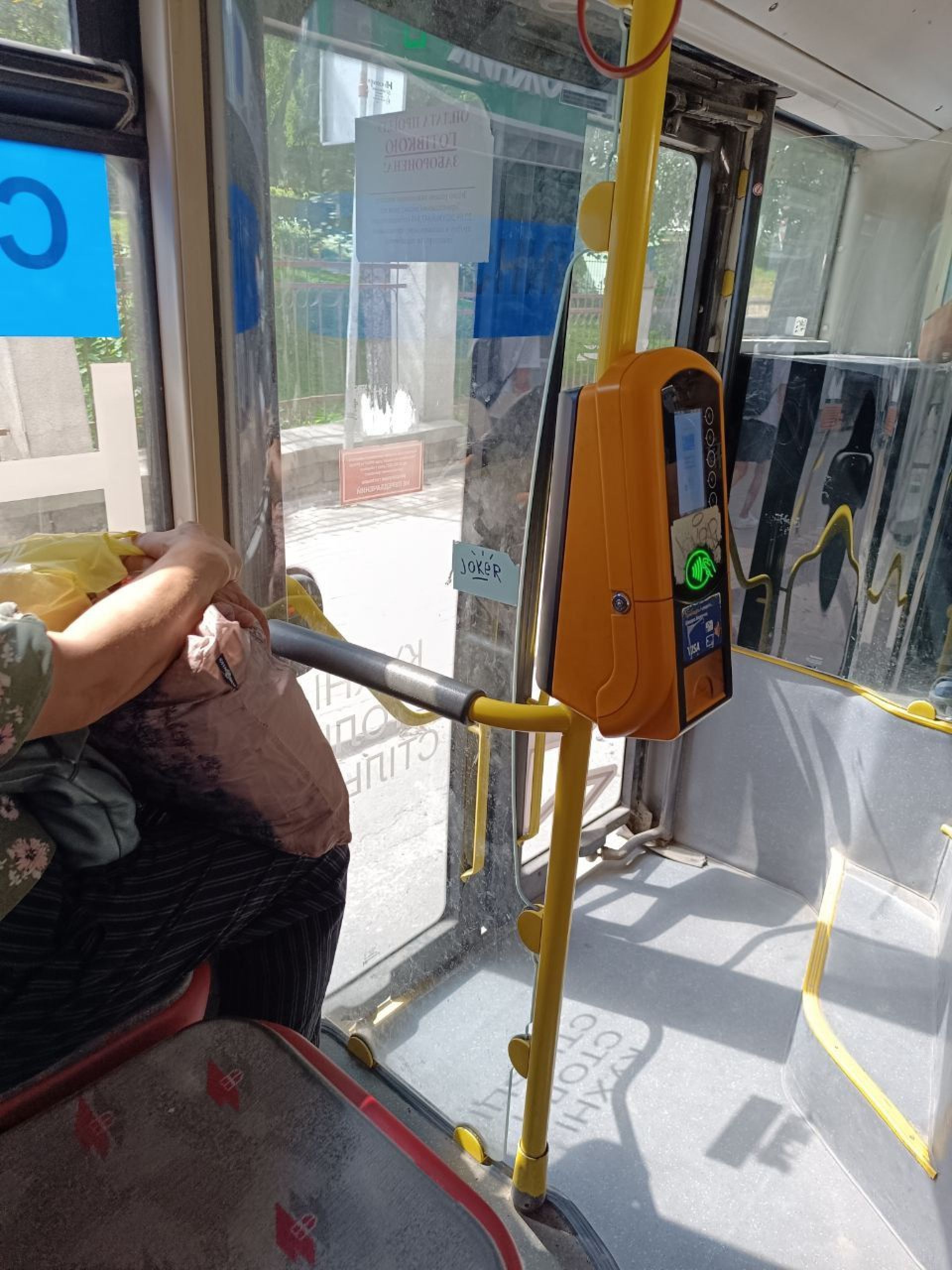Стаціонарних валідаторів в салоні немає. Також всередині були розвішані спеціальні молоточки для аварійного розбиття скла. Працює монітор на якому показують рекламу.