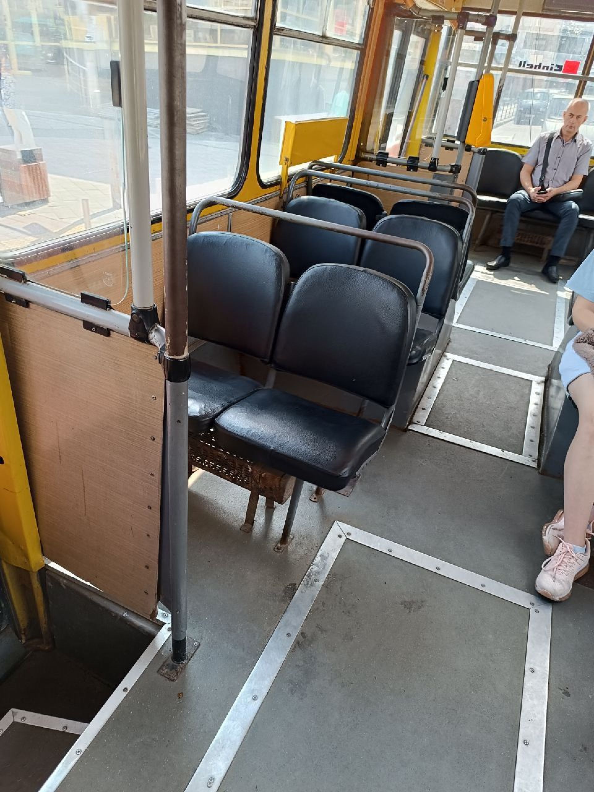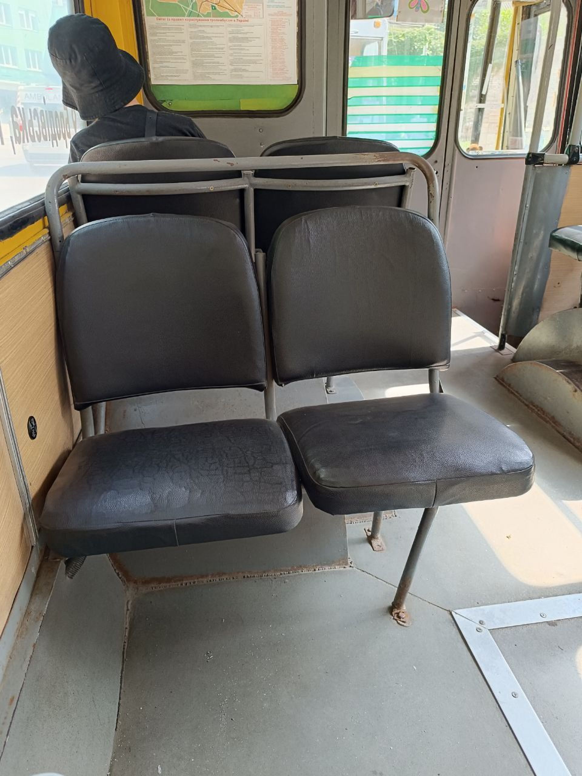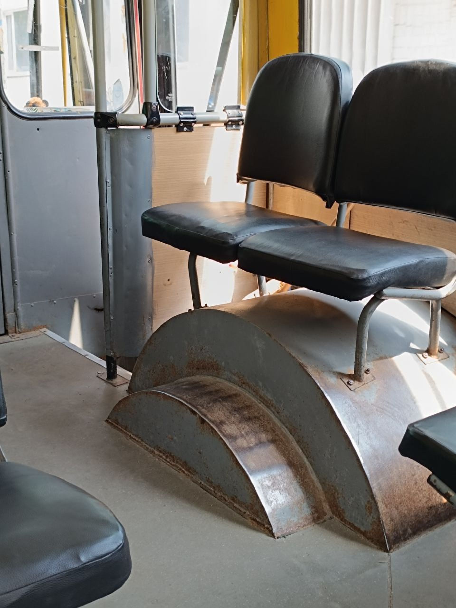 У тролейбусі з поручнів злізла фарба. Бокові панелі здуті. Сидіння з замінника шкіри були цілі. Багато елементів покриті ржавчиною. Також в салоні помітили відра, порожні пляшки та віники для прибирання. Два стаціонарні валідатори є на входах у тролейбус.
