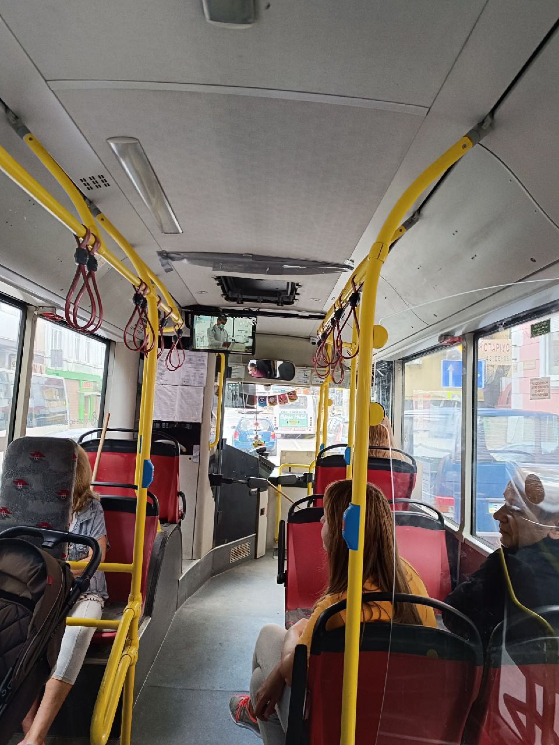 Новий низькопідлоговий автобус. Усередині багато місця. У салоні було чисто, хоча на вікнах багато слідів рук та трохи пилу. Деякі сидіння були забруднені. На центральному вході є достатньо місця щоб поставити дитячий візок або крісло колісне. Також є спеціальні крісла з відкидними сидіннями. Розрахуватися можна лише на вході біля водія.