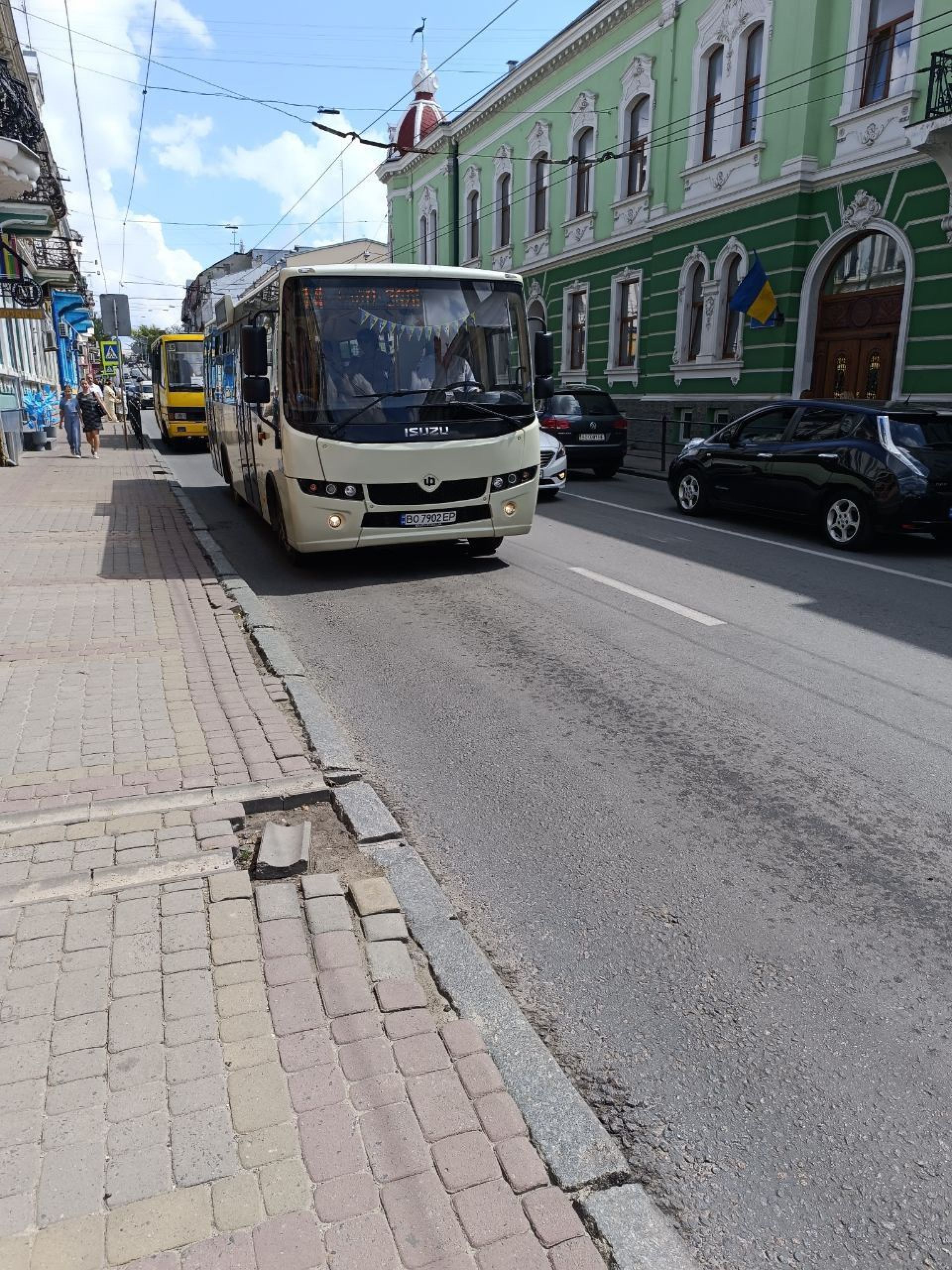 Це новий автобус марки ISUZU. Кілька таких курсують містом. Вони нові. У салоні помітно, що він почав перевозити пасажирів нещодавно. Там нові сидіння, ще не облущена фарба на поручнях, чистий салон. Є інформаційний монітор.