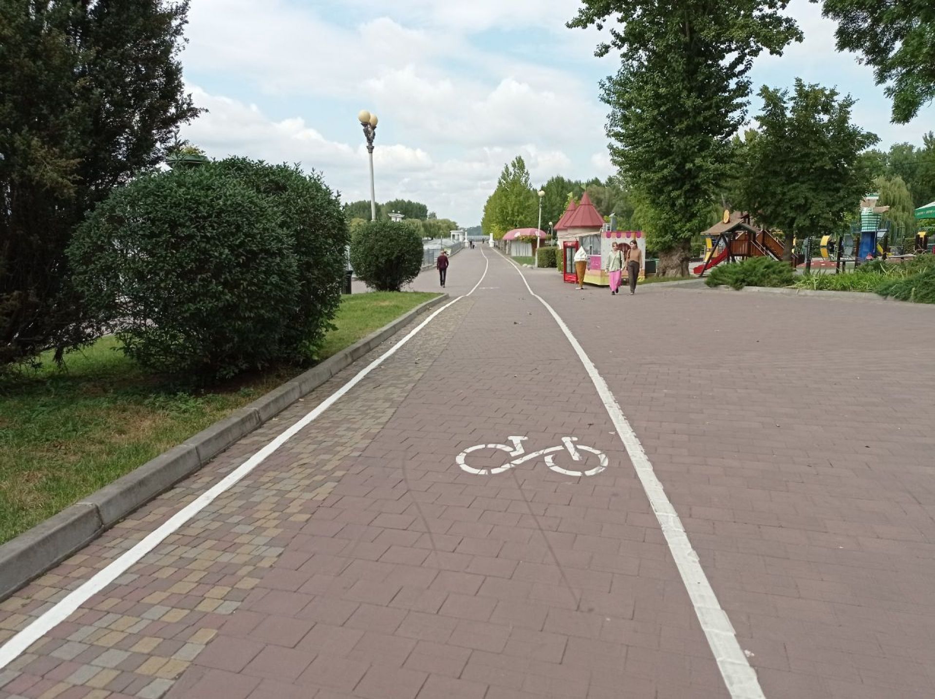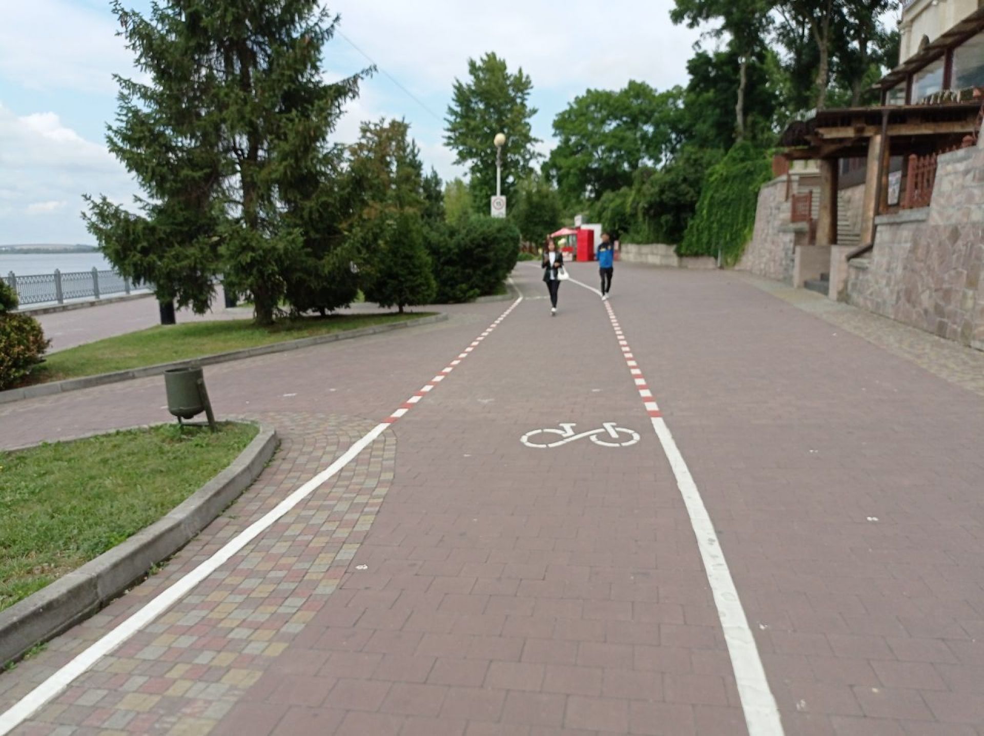 У парку ім. Тараса Шевченка зона для велосипедів та електросамокатів є вздовж набережної від Надставної церкви до пивзаводу. Доріжка має розмітку, є знаки обмеження швидкості. Здебільшого пішоходи не виходять на велодоріжку, але є і ті, хто ігнорує правила. Дехто навіть йшов у навушниках та не чув сигналів велосипедів та електросамокатів.