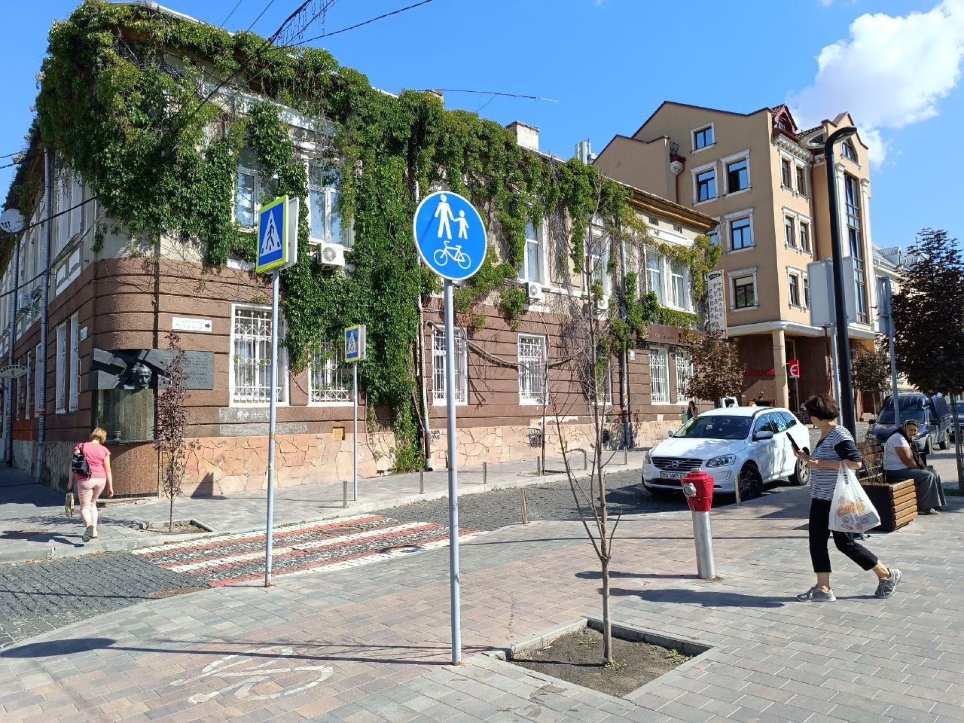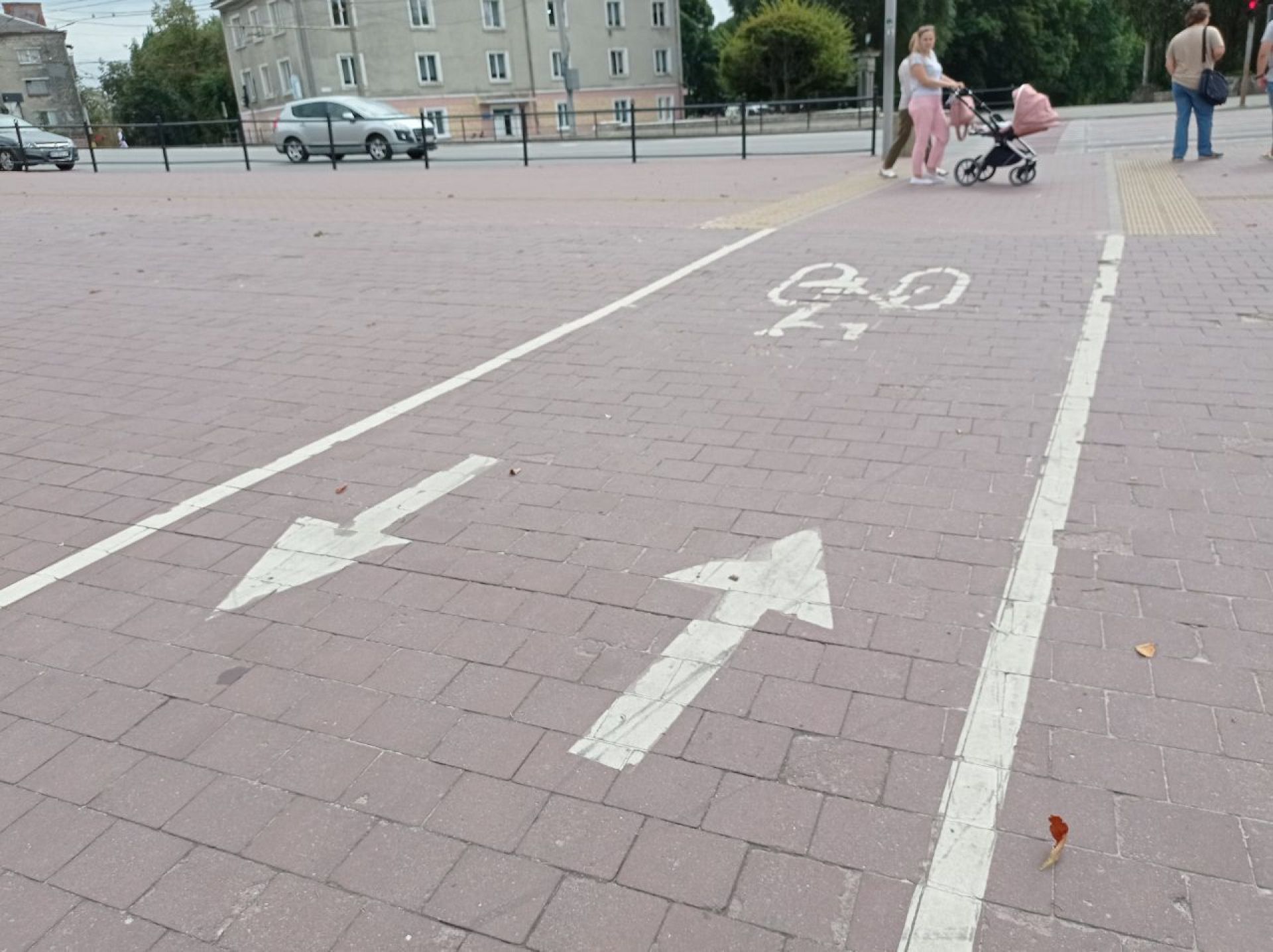На тротуарі по вулиці Протасевича є знак, що це тротуар для велосипедистів та пішоходів. Він не широкий, тому його не розділили на пішохідну зону та зону для велосипедів.