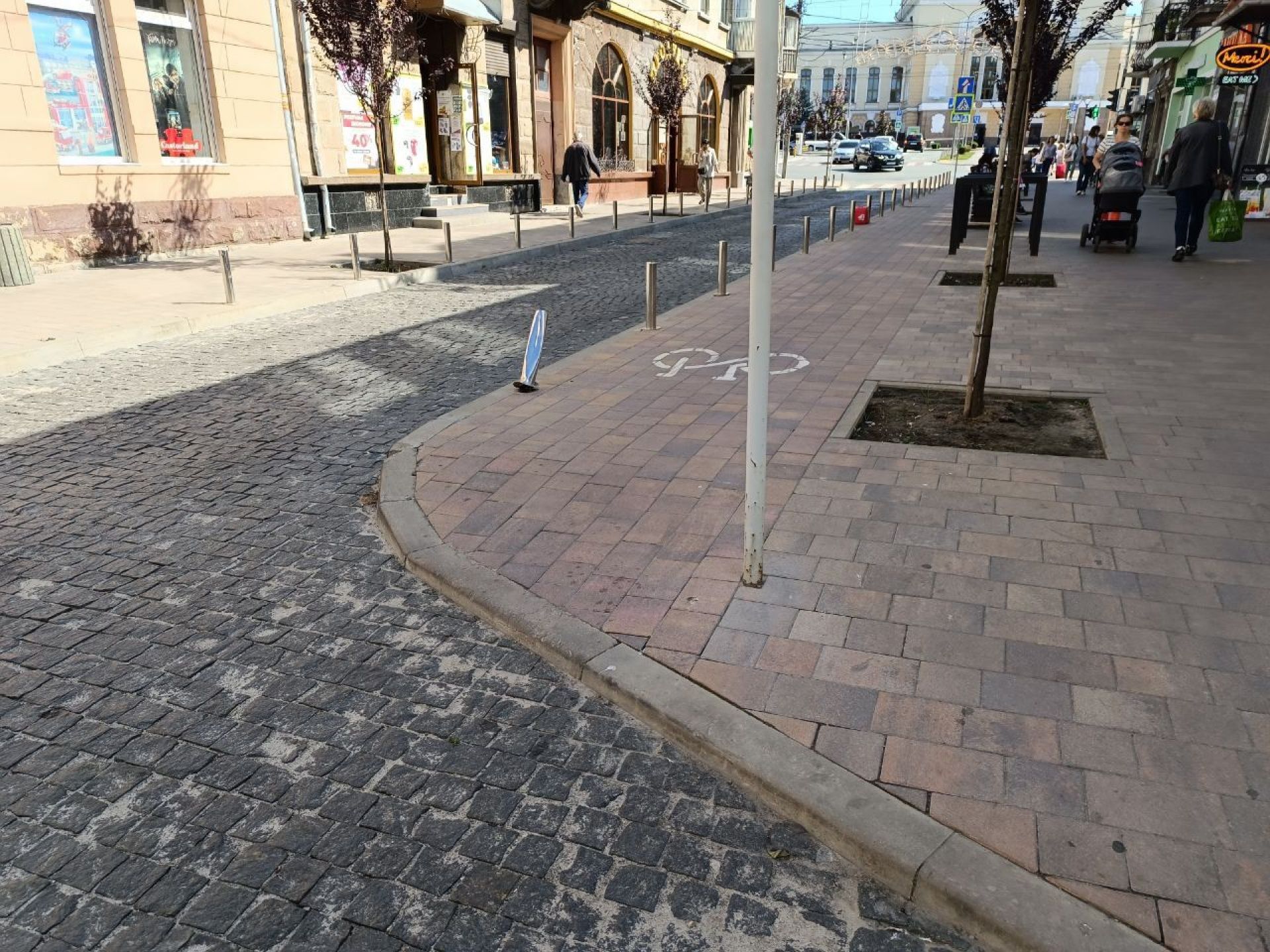Стартуємо з вулиці В’ячеслава Чорновола. Тут є велодоріжка від залізничного вокзалу до Театрального майдану. Вона відділена від пішохідної зони лавками. Тому нею користуються лише велосипедисти та користувачі електросамокатів. Лиш іноді тут є пішоходи.