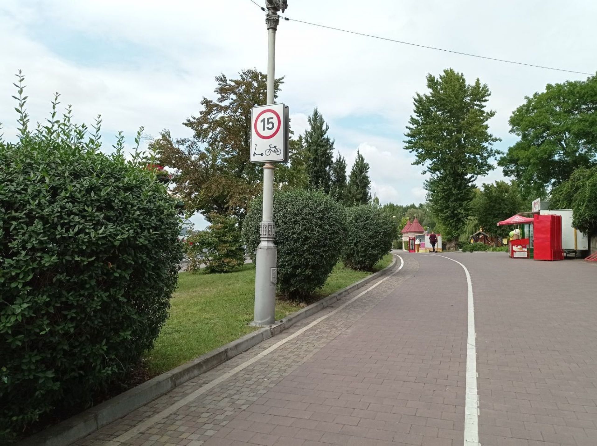 У гідропарку доріжка тягнеться від екстрим-майданчика до центральної алеї. Бруківка там іншого кольору, також є знак обмеження швидкості до 15 км/год.