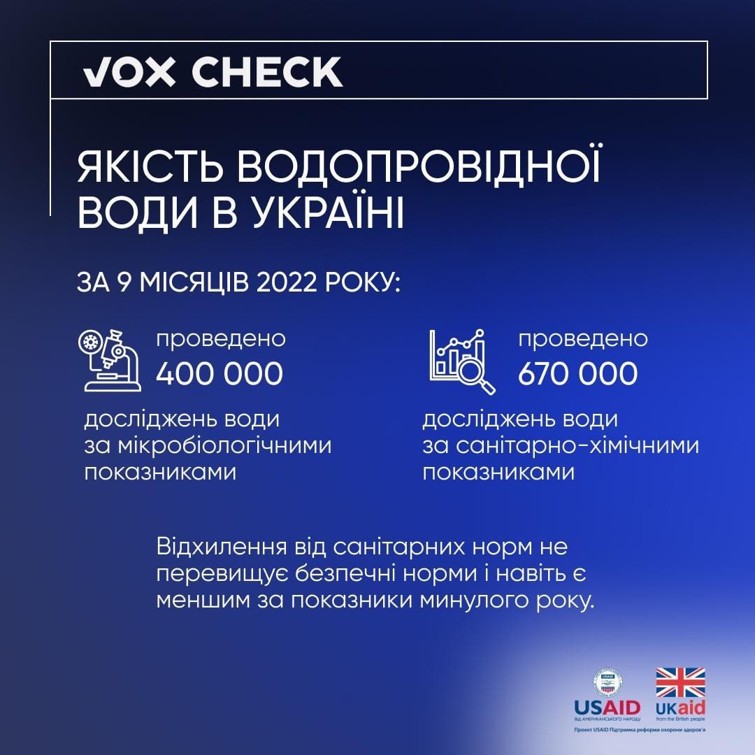 У Міністерстві охорони здоров’я повідомляють, що за 9 місяців 2022 року провели майже 400 тисяч досліджень питної води централізованого водопостачання за мікробіологічними показниками. Відхилення від санітарних норм виявили у 1,5 % усіх досліджень, на противагу 4,3 % минулого року, повідомляє voxukrain.