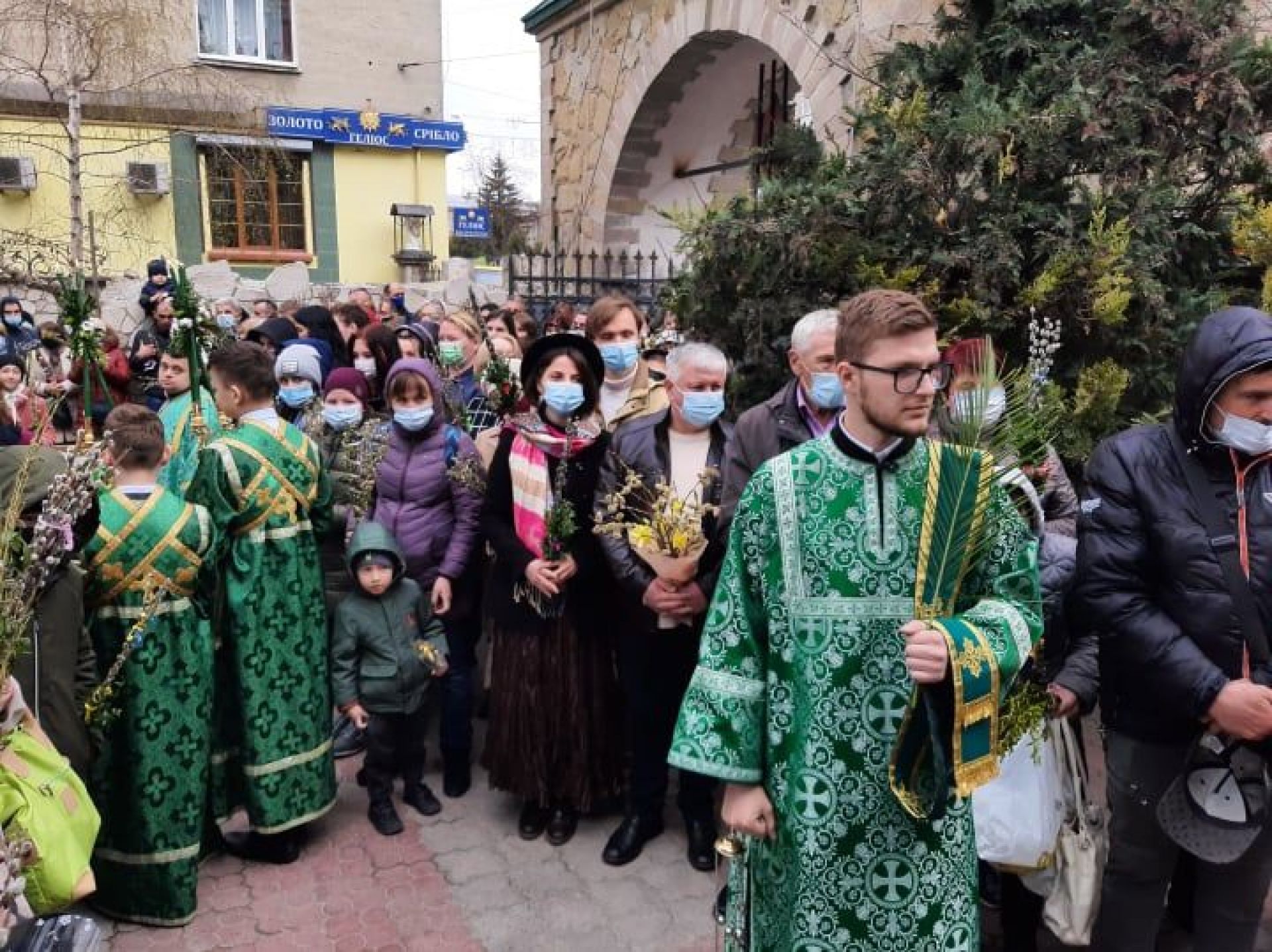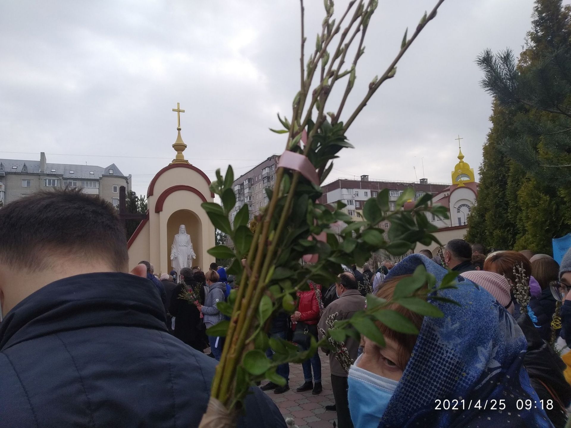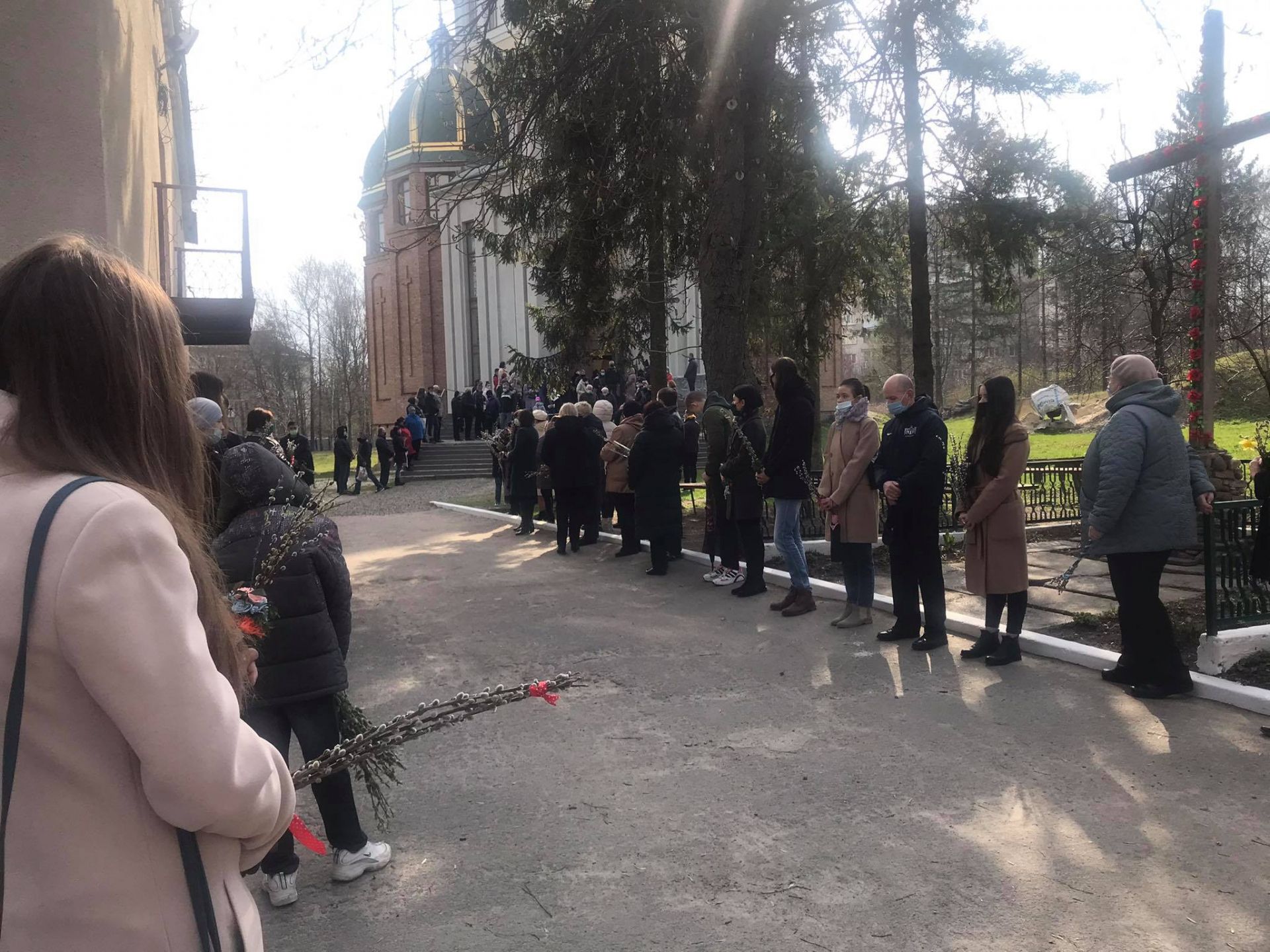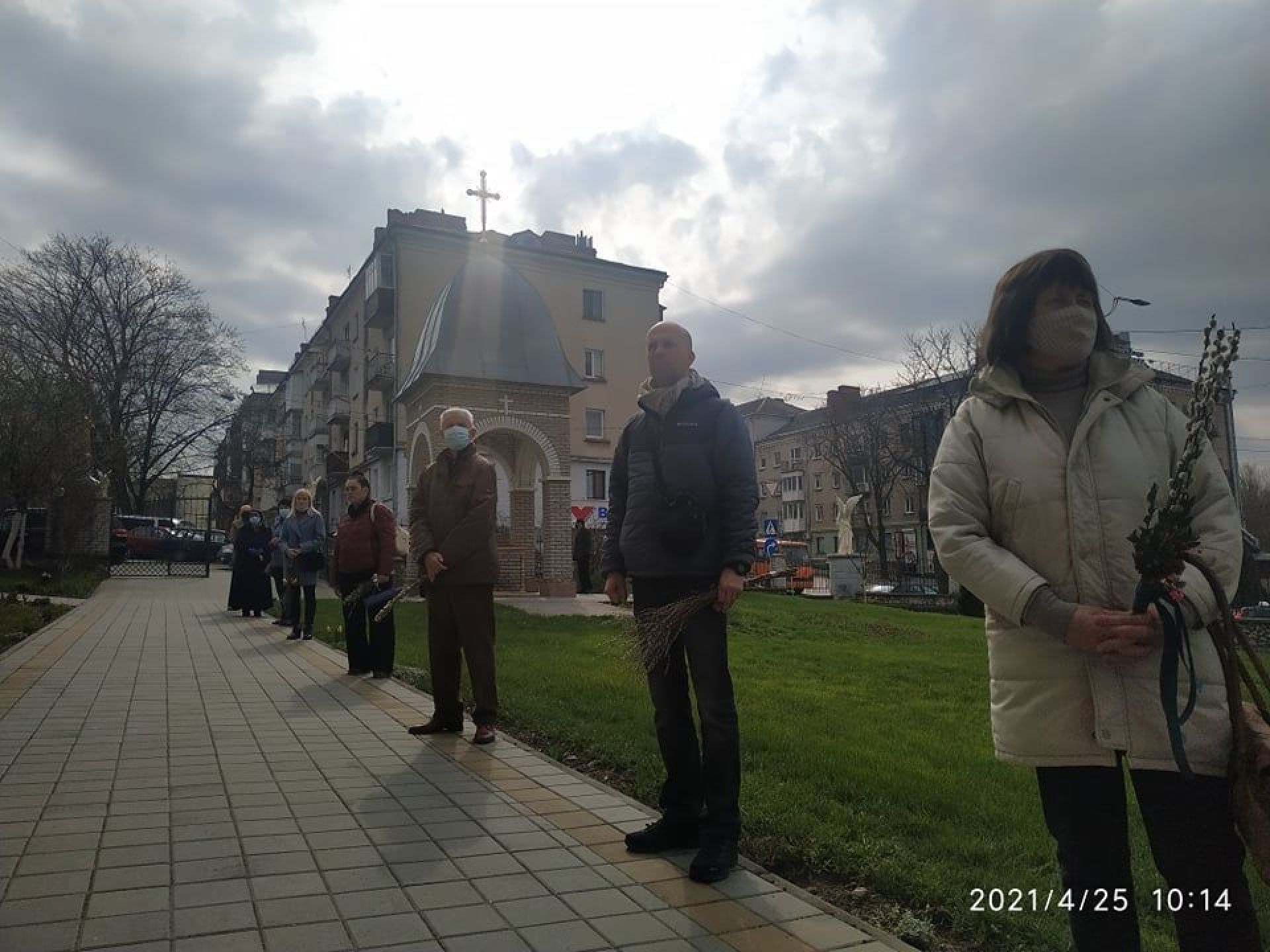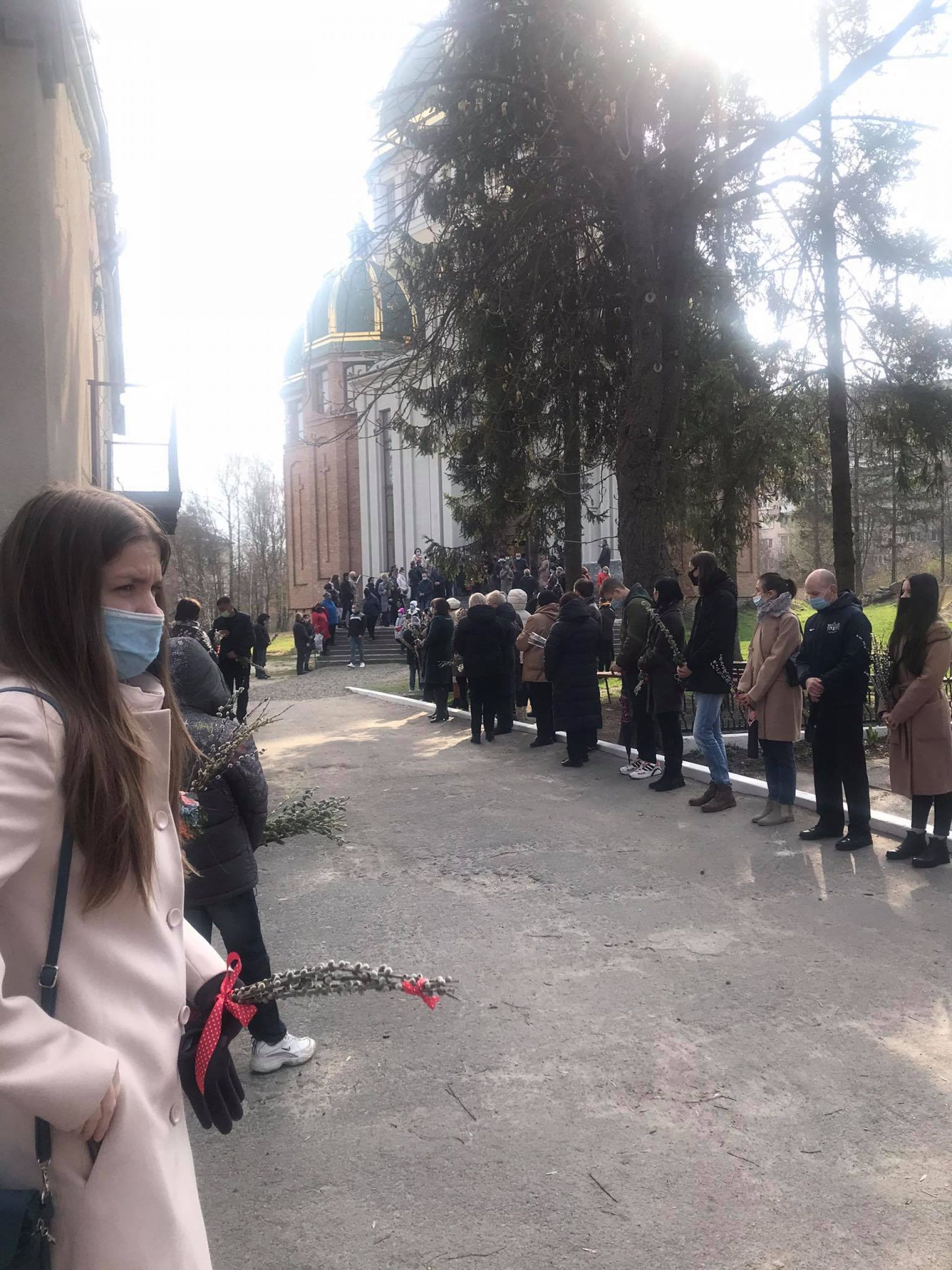 Також багато парафіян з вербою. Навіть на вулиці одягнули маски і зберігають дистанцію.