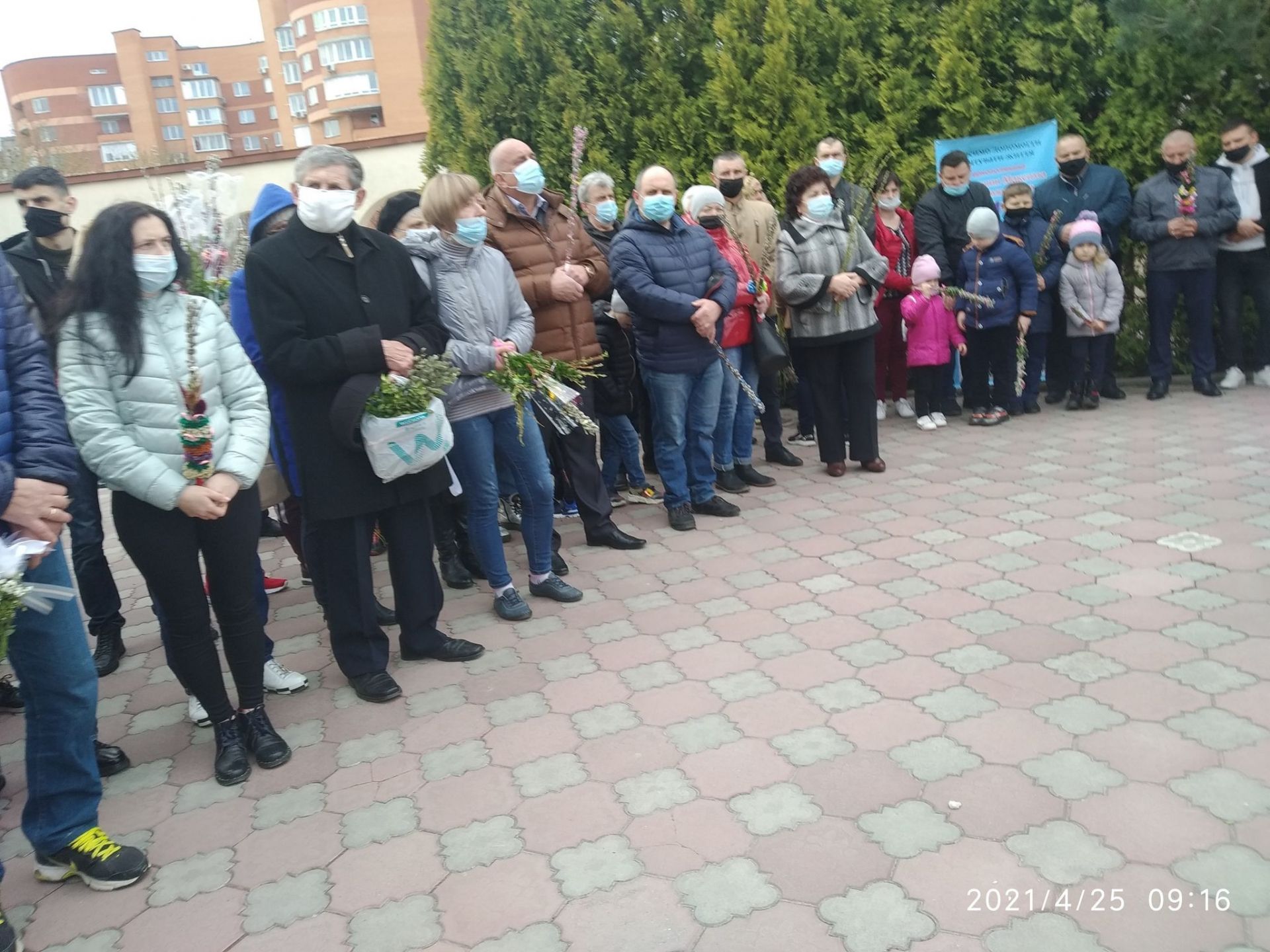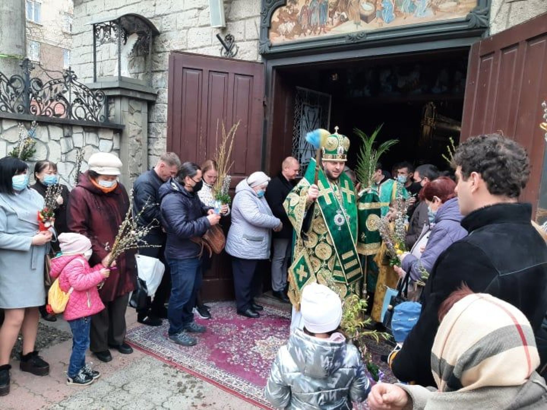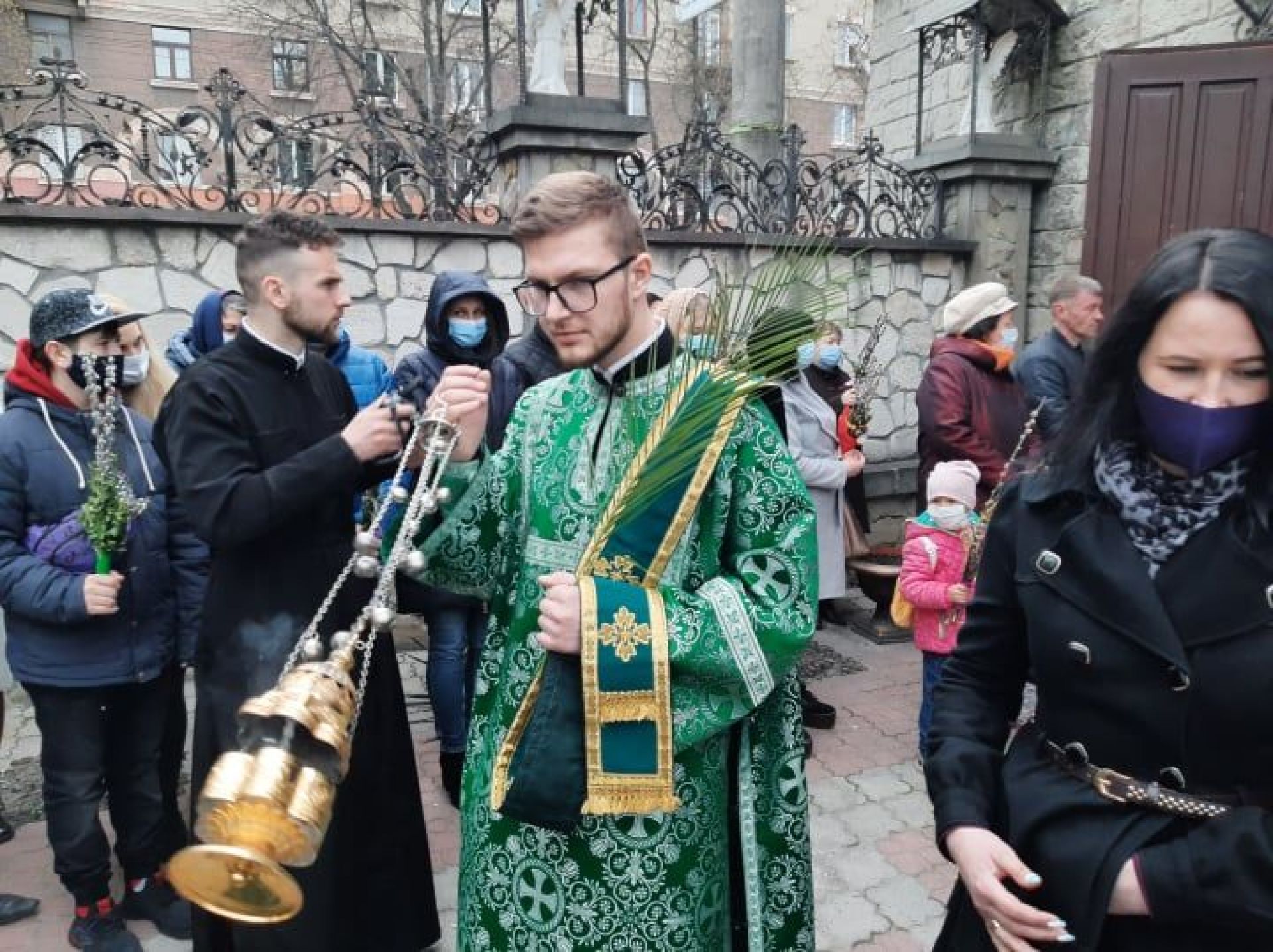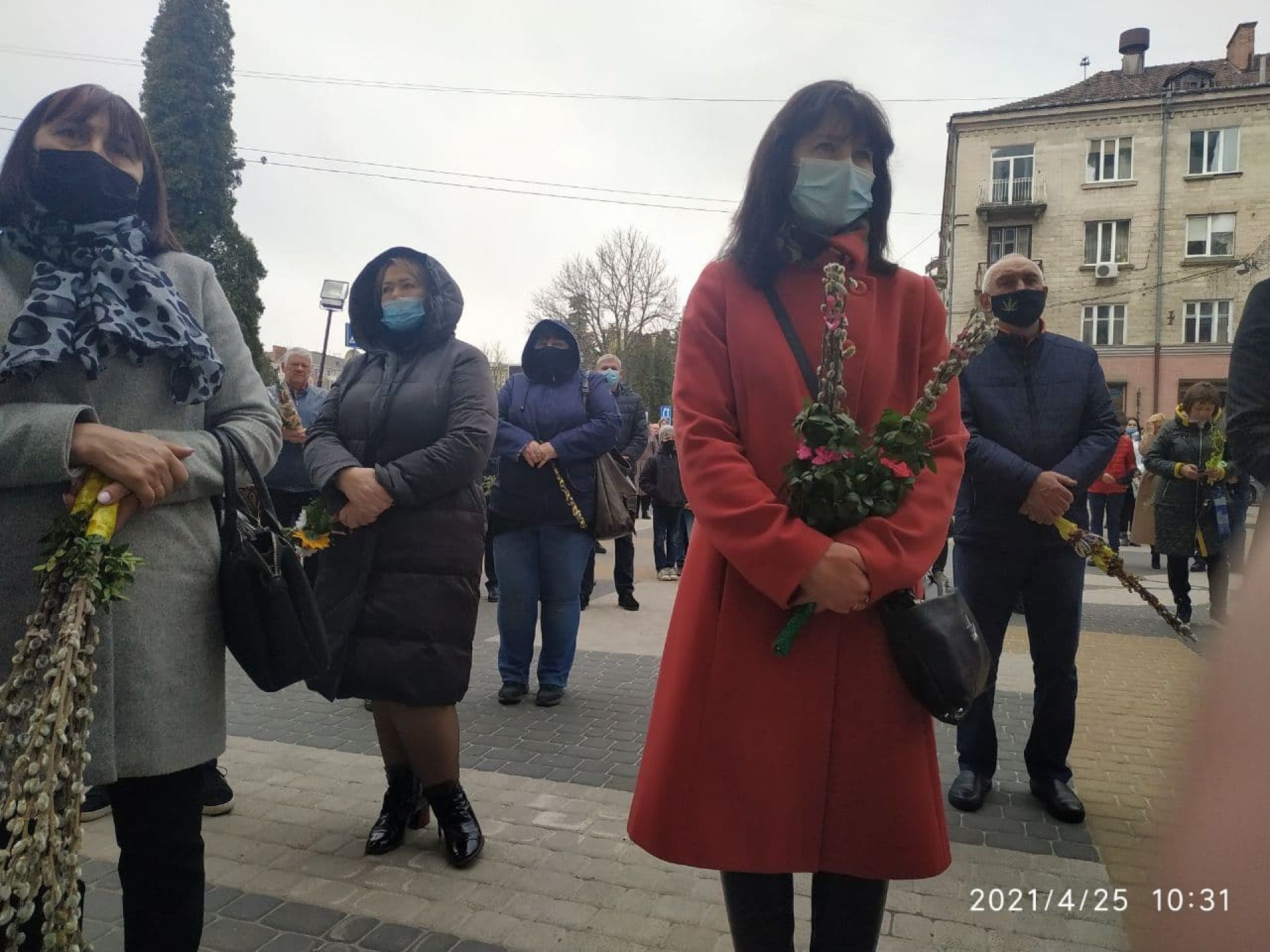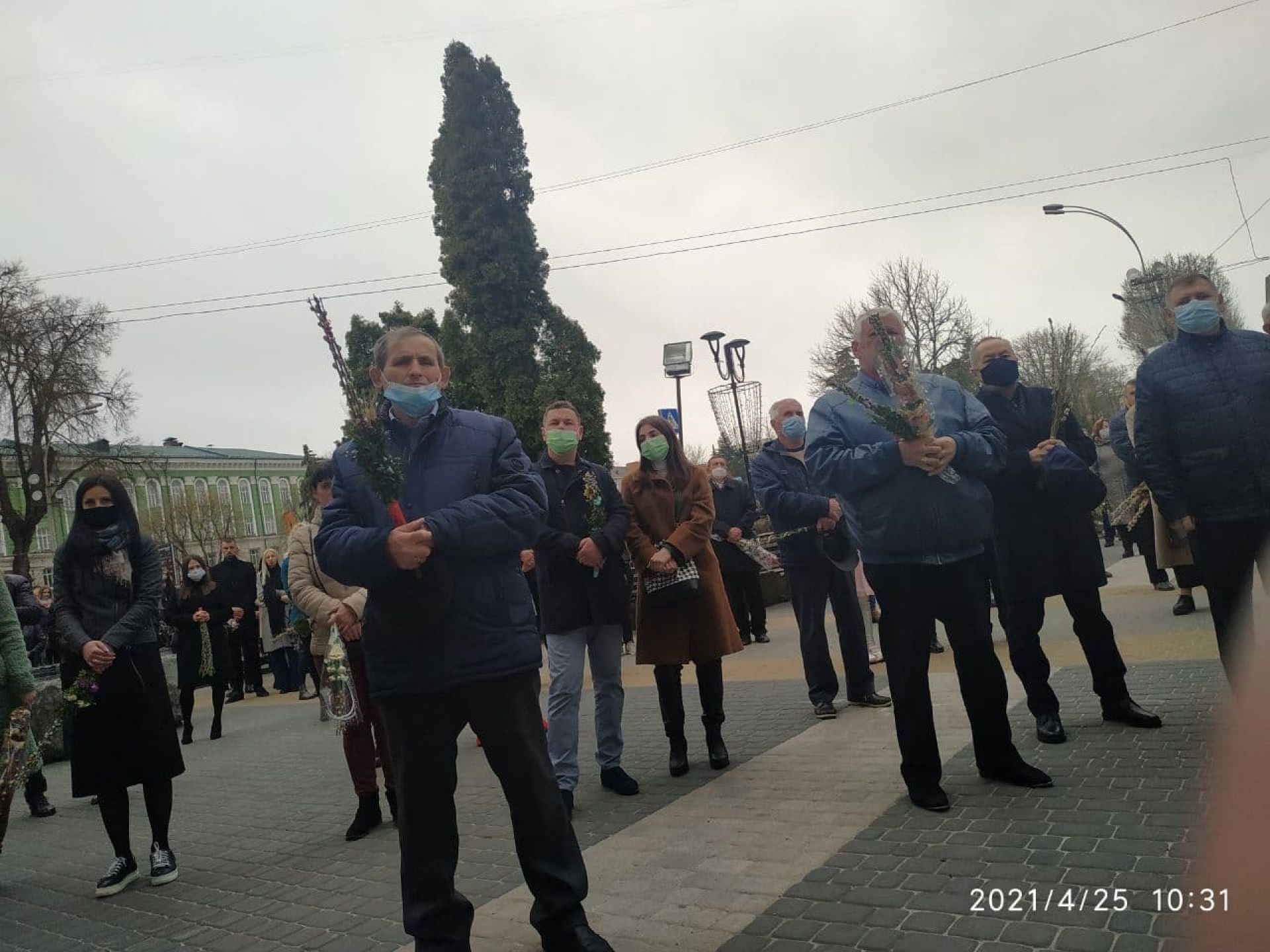 Також багато парафіян з вербою. Навіть на вулиці одягнули маски і зберігають дистанцію.