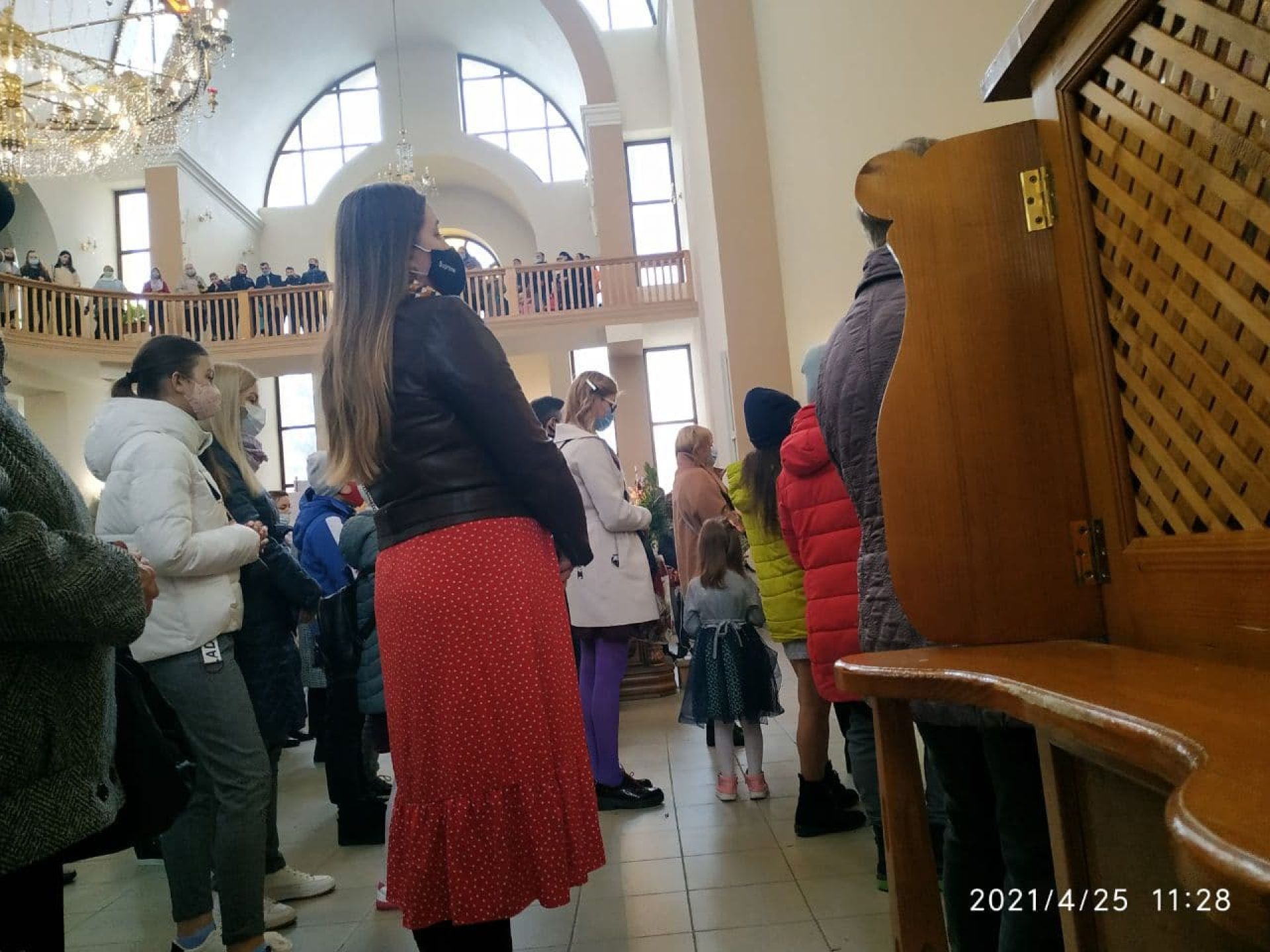 Всередині церкви ситуація дещо гірша. адже між людьми мінімальна дистанція. Хоча люди перебувають в масках. Серед присутніх журналіст помітив лиш трьох людей, котрі маски не вдягнули.