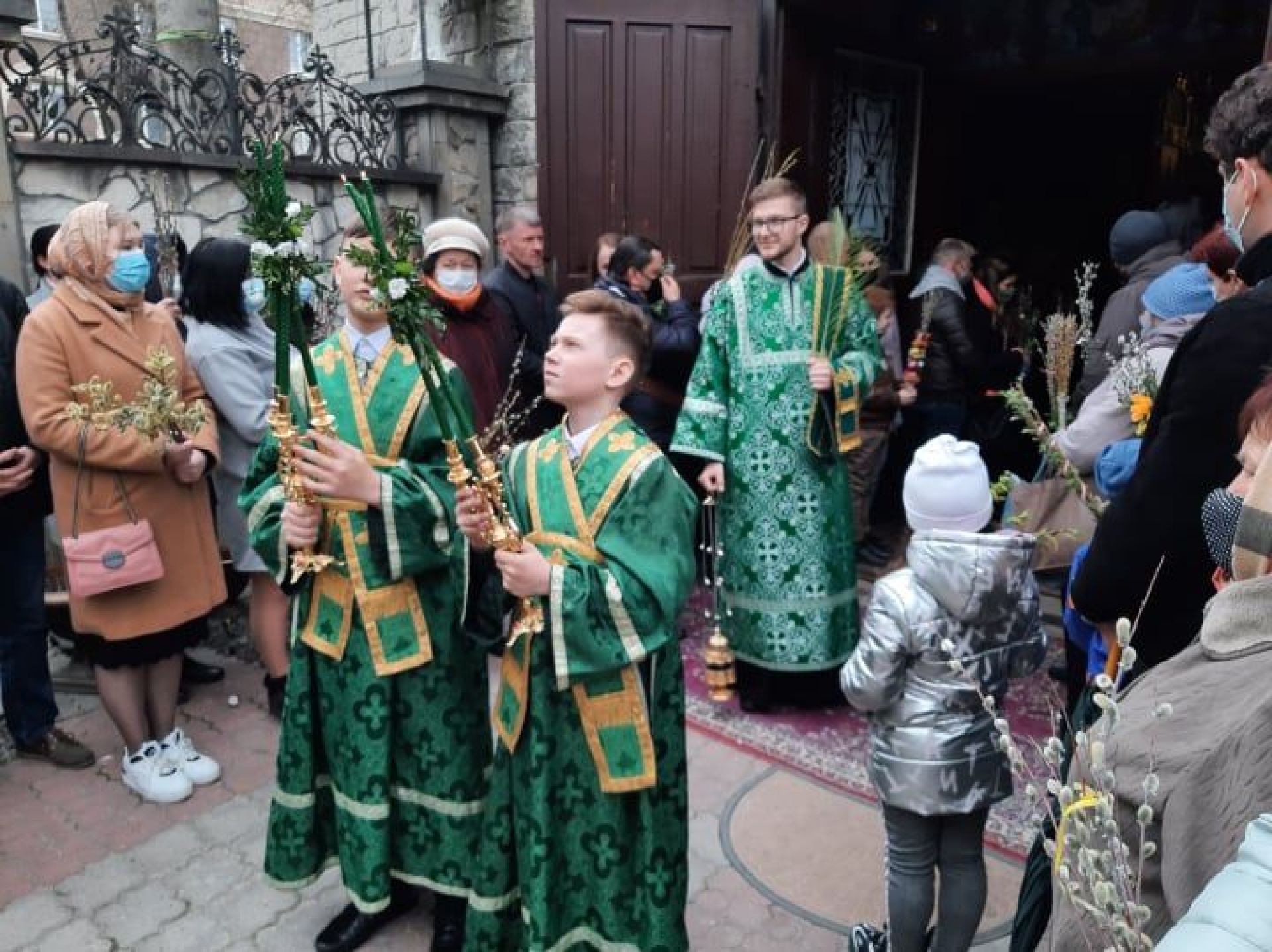 У храмі святого апостола Петра, що на Алясці, у неділю 25 квітня на службі на 8 ранку зібралося дуже багато парафіян. Усі мають в руках прикрашені букети з вербових гілочок.