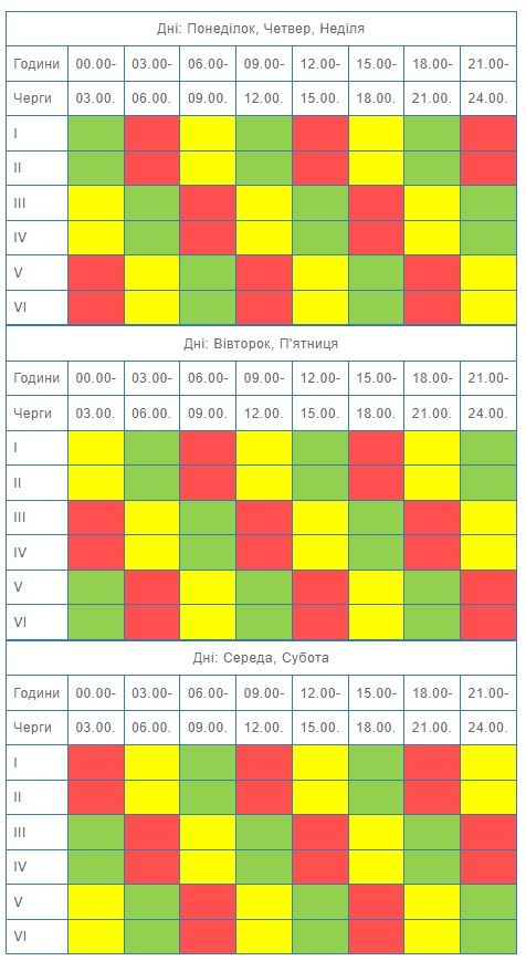Черговість вимкнення 6 через 3 години або 3 через 6 годин. Виходячи із погодинного навантаження на енергосистему, енергетики будуть корегувати це навантаження, вмикаючи або вимикаючи певну групу споживачів.