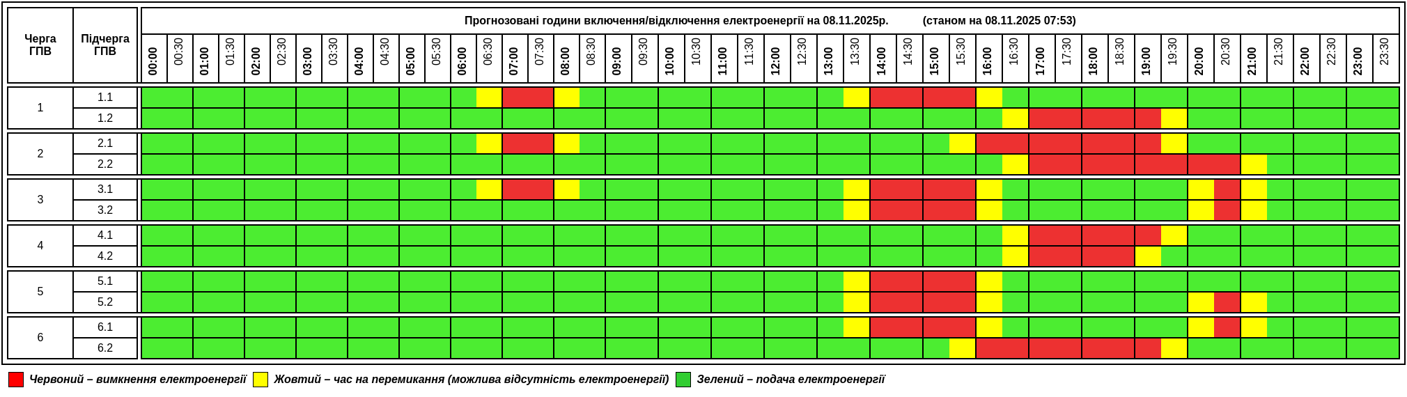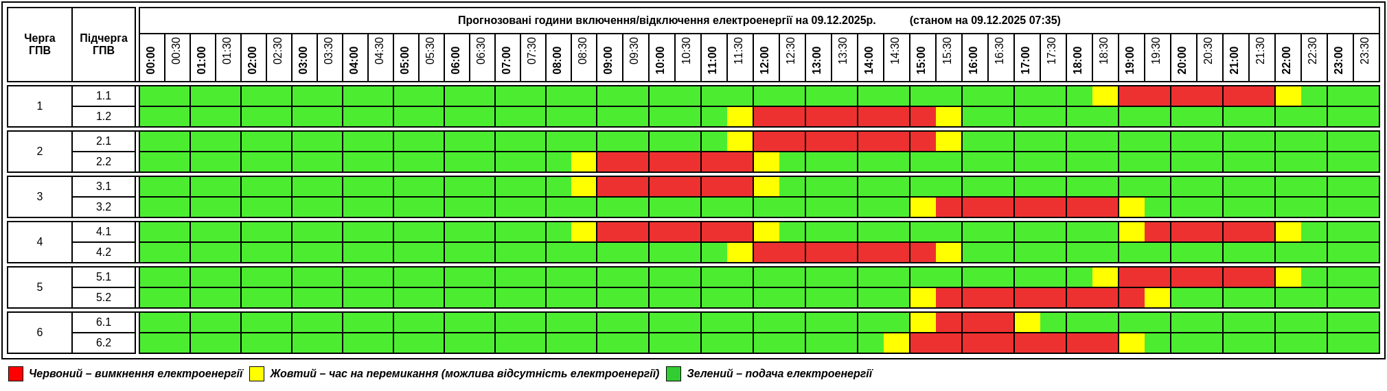 Графіки погодинного вимкнення (ГПВ) — це перелік конкретних населених пунктів та вулиць, які будуть знеструмлені у певні години за 6-ма чергами, які поділяються на 12 підчерг. ГПВ розробляються заздалегідь обленерго, погоджуються із органами місцевого самоврядування та НЕК «Укренерго». Тобто, вони заздалегідь заплановані, час вимкнень і тривалість відомі завчасно. Споживач повідомляється напередодні про їх введення і має змогу ознайомитися з графіком та дізнатися до якої черги відноситься його адреса.