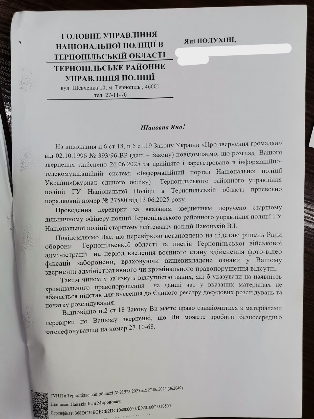 «Здійснення фото-відеофіксації заборонено, ознаки адміністративного чи кримінального правопорушення відсутні», — такою була відповідь медійниці. От щоправда, у відповіді не уточнили, що саме заборонено фотографувати.
