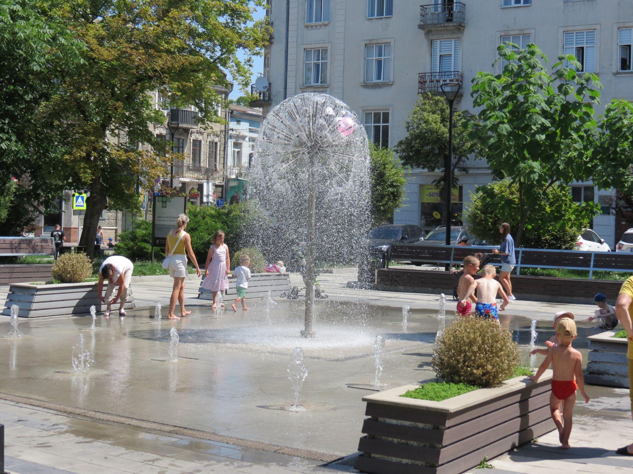 Діти приходять купатися до фонтанів. У сквері Чорновола є багато малечі, які бігають через фонтан.